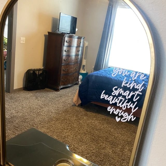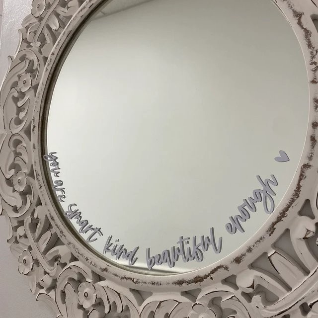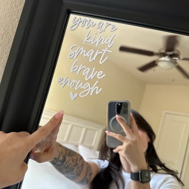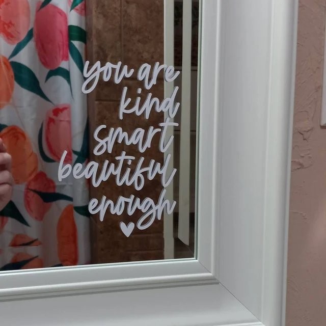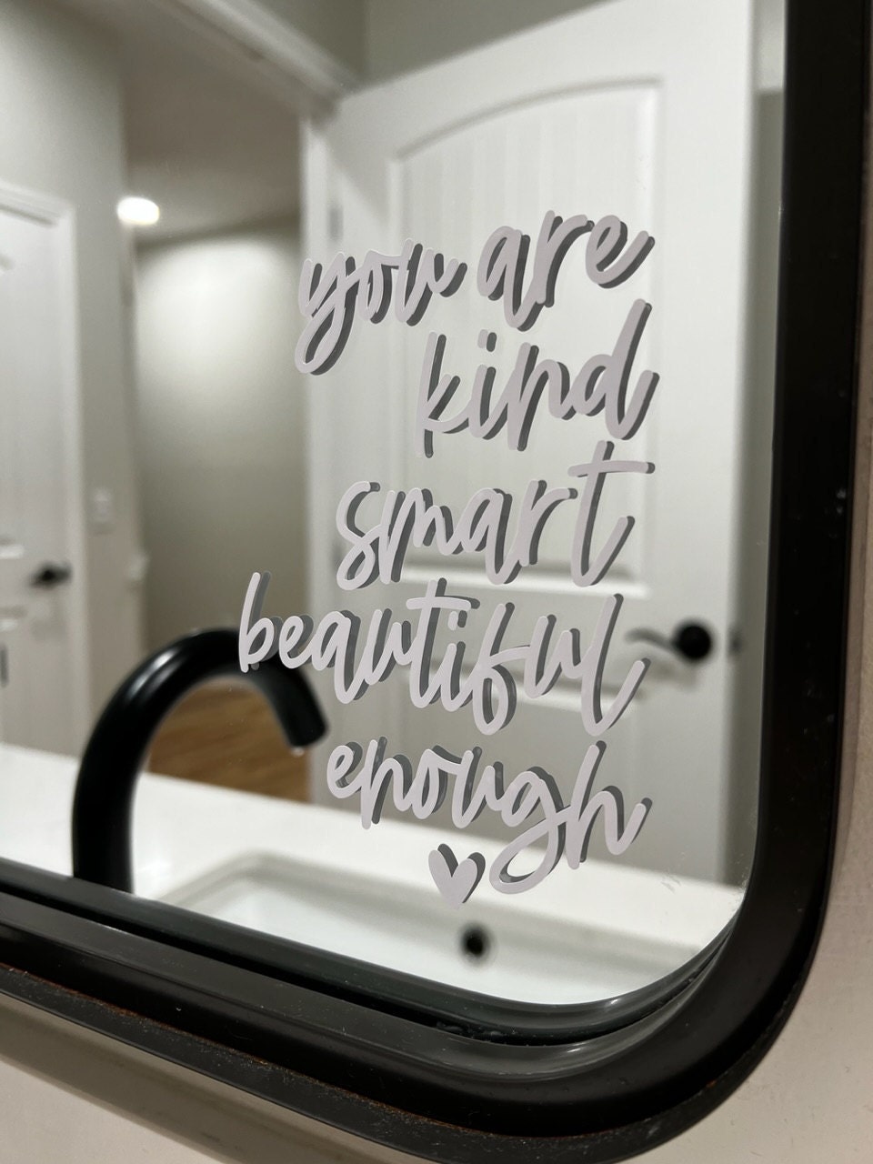 Each word decal measures 0.8 inches tall, adding a touch of positivity to your walls and mirrors. The overall size varies based on the length of the text, making each piece unique. For example, the phrase "You are kind smart beautiful enough. <3" is approximately 4 inches wide x 5.5 inches long.
