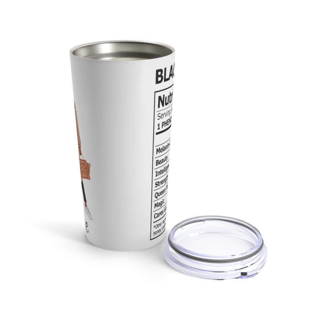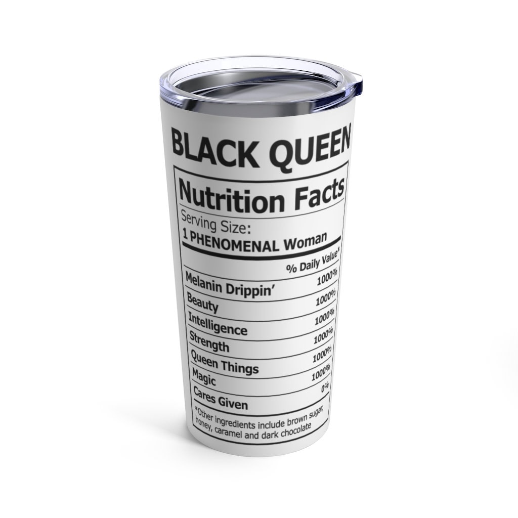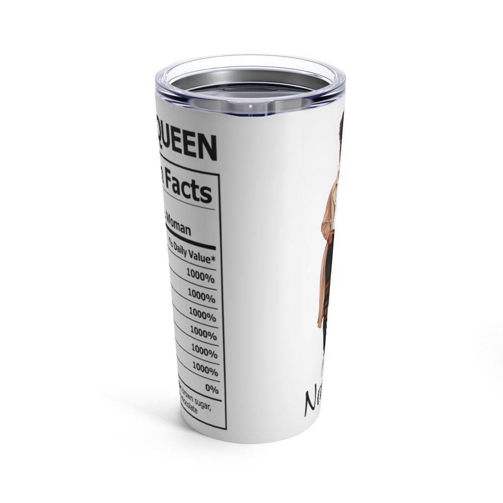 The "Comfy and Chic" 20oz stainless steel travel-size tumbler for black women is stylish and cute. It features an image of a beautiful an chic African American woman on one side and the "Black Queen Nutrition Facts" on the other side.