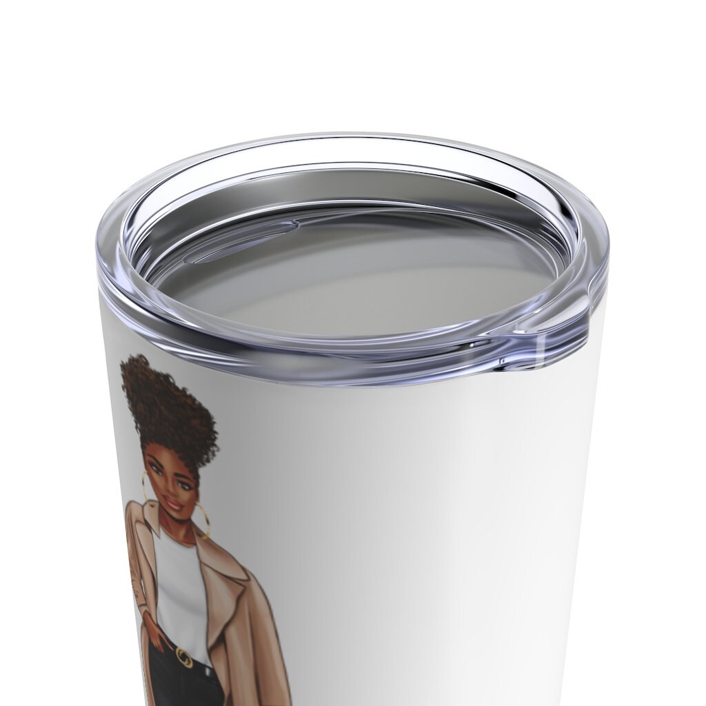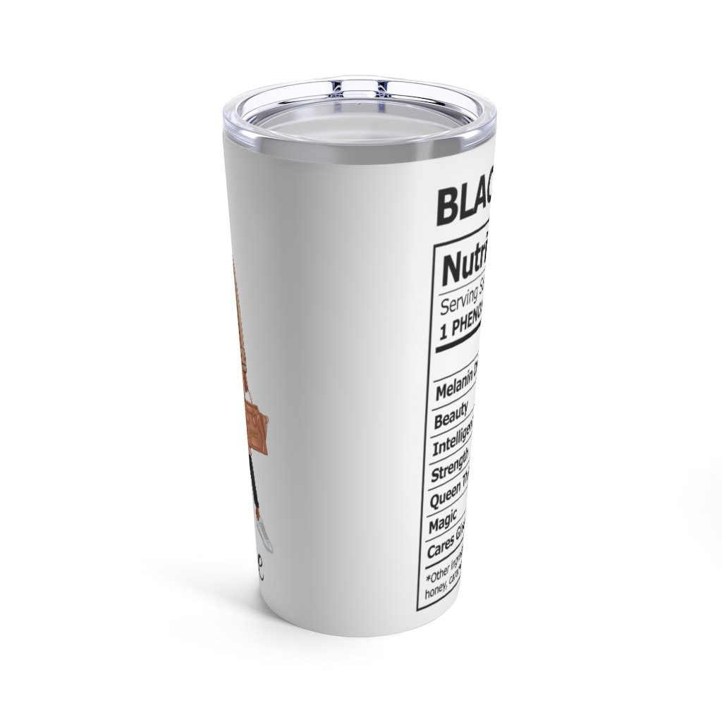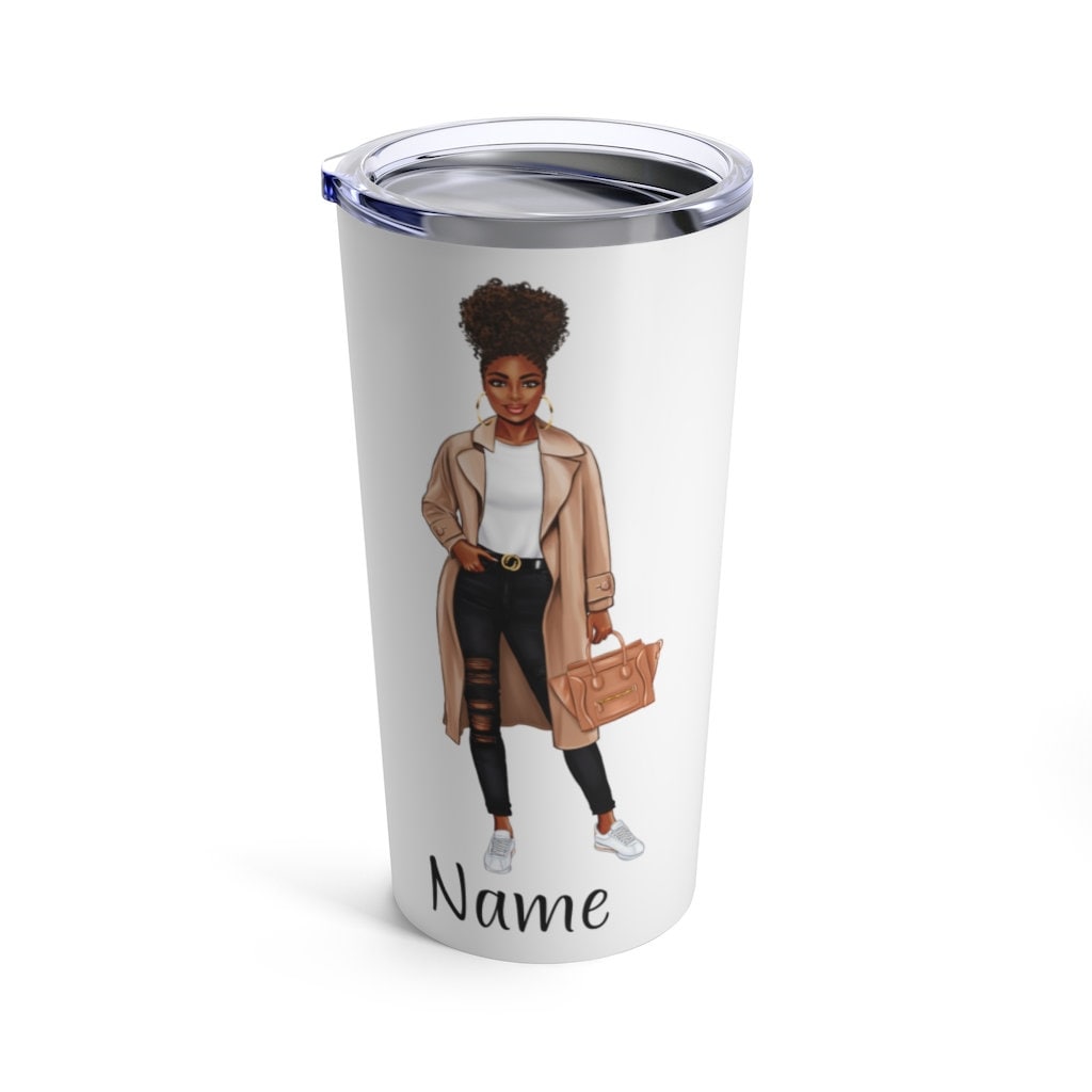 The "Comfy and Chic" 20oz stainless steel travel-size tumbler for black women is stylish and cute. It features an image of a beautiful an chic African American woman on one side and the "Black Queen Nutrition Facts" on the other side.