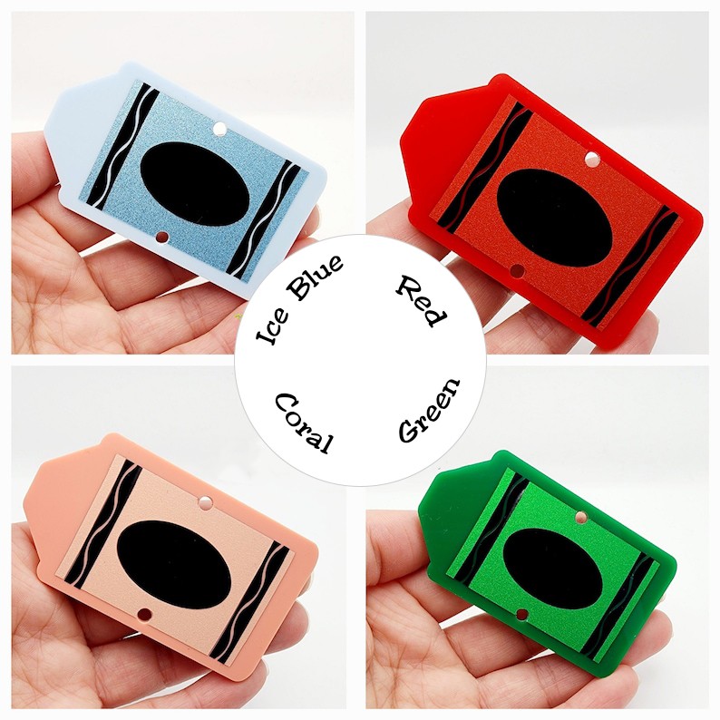 This lanyard is approximately 21” from the breakaway clasp to the lobster clasp. The crayon acrylic piece is approx. 3” wide. Comes with 8 charms (as shown in picture).