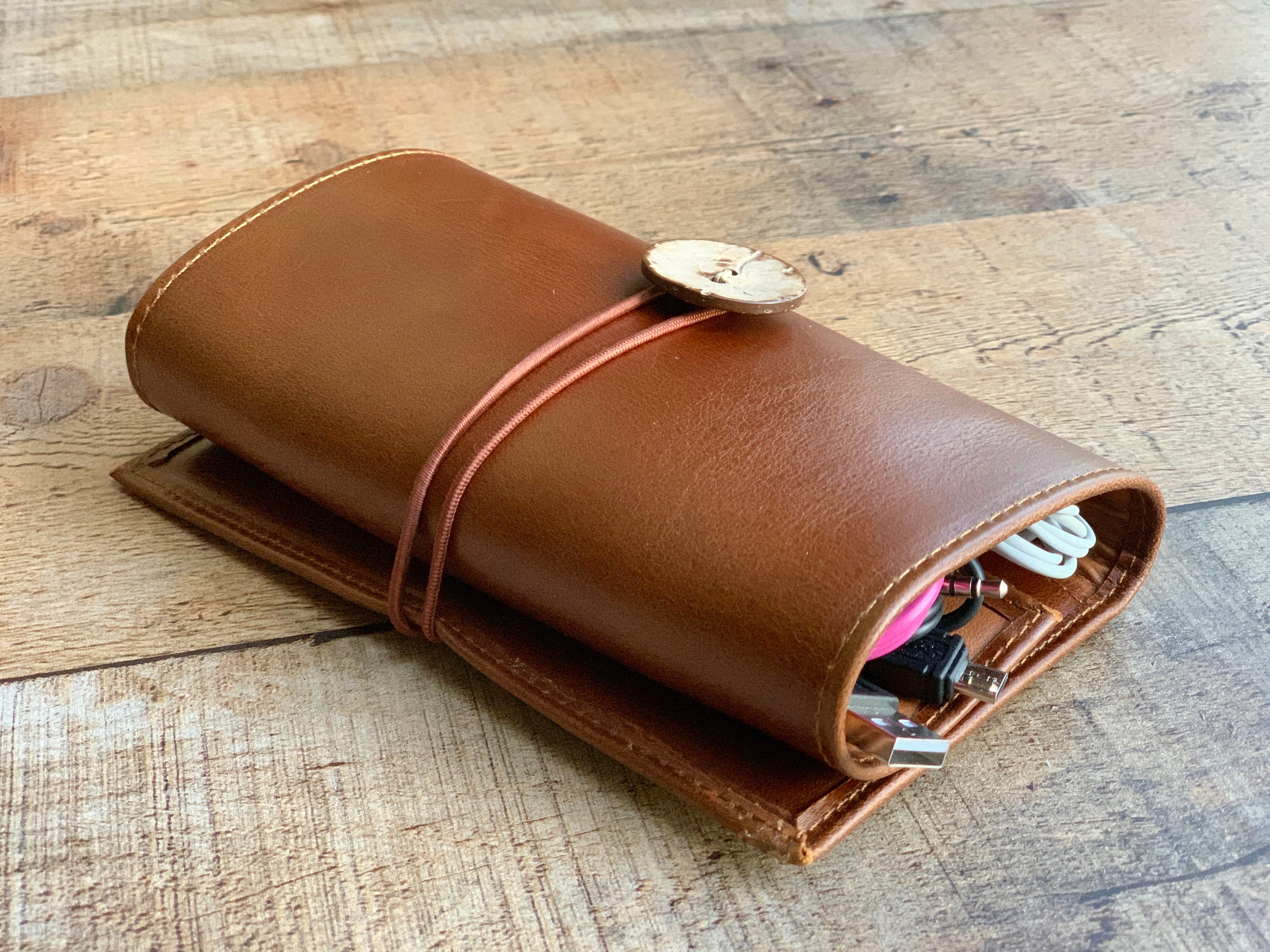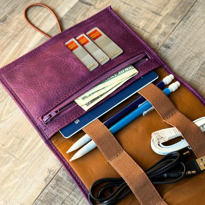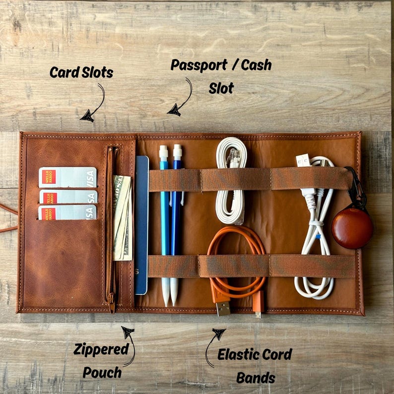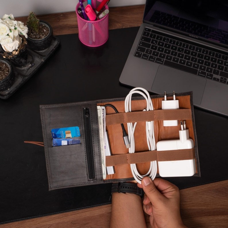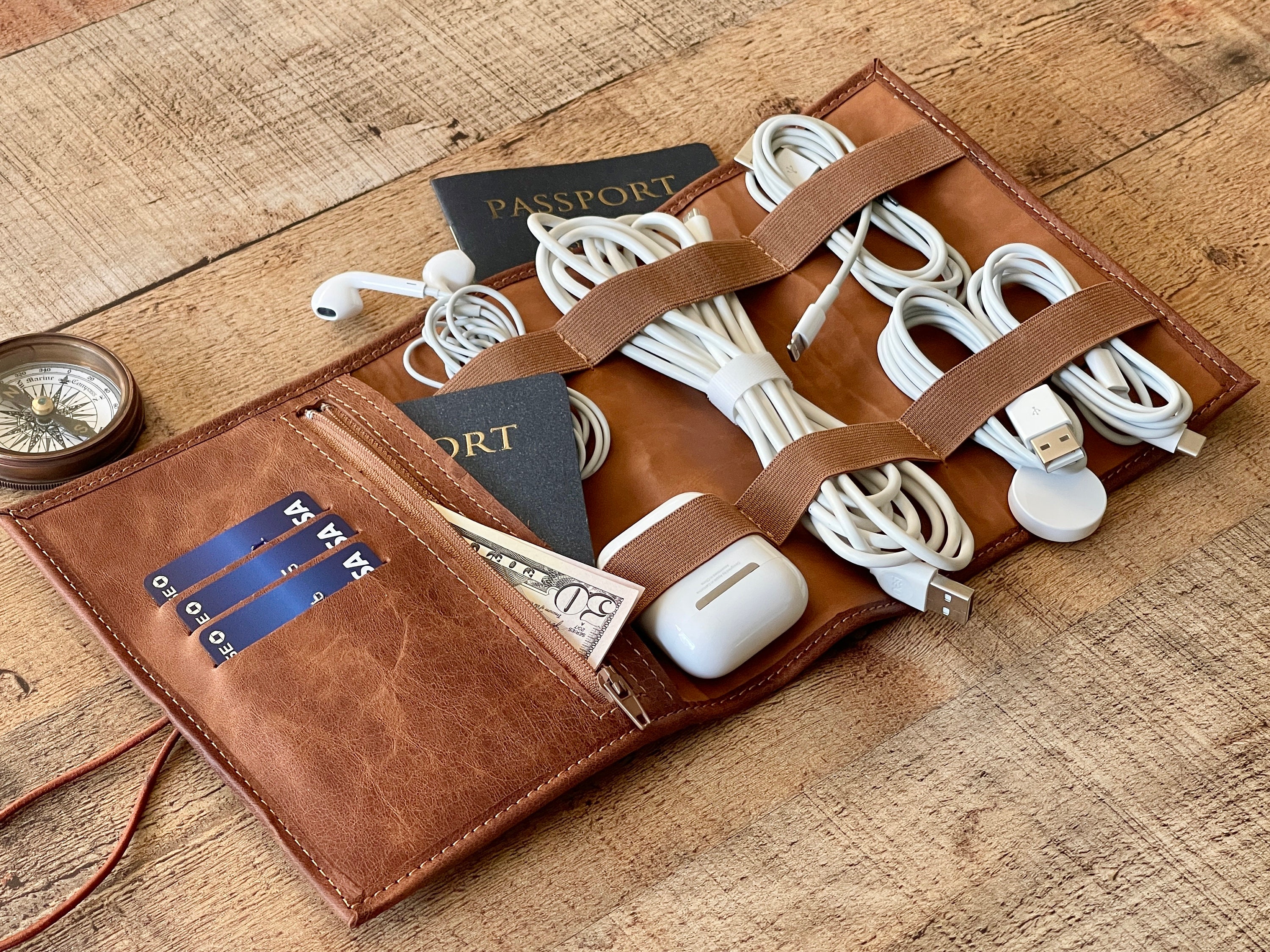 Keep all of your accessories together in one place with this travel charger + passport case and a small accessories pouch.Place your cables, cords, chargers, credit cards, cash, and secure them inside the snug compartment with a tie-toggle closure.