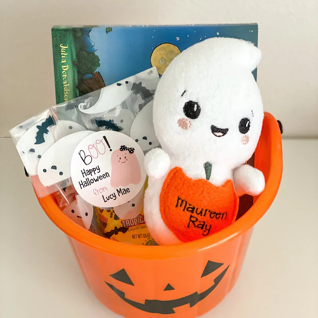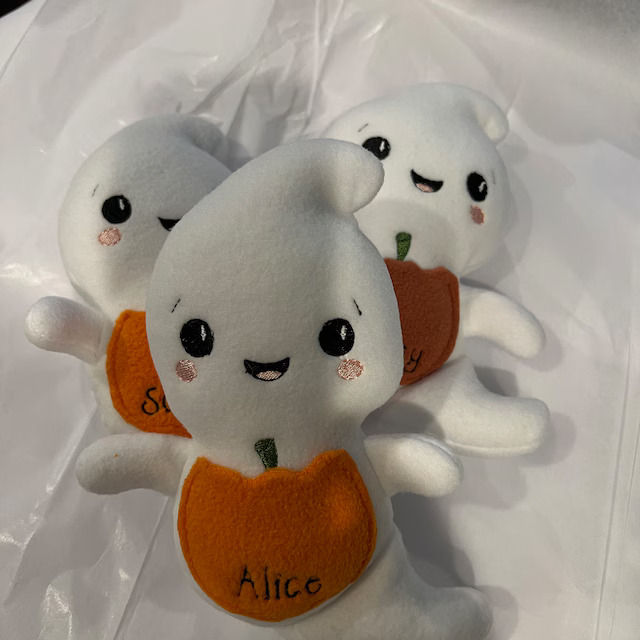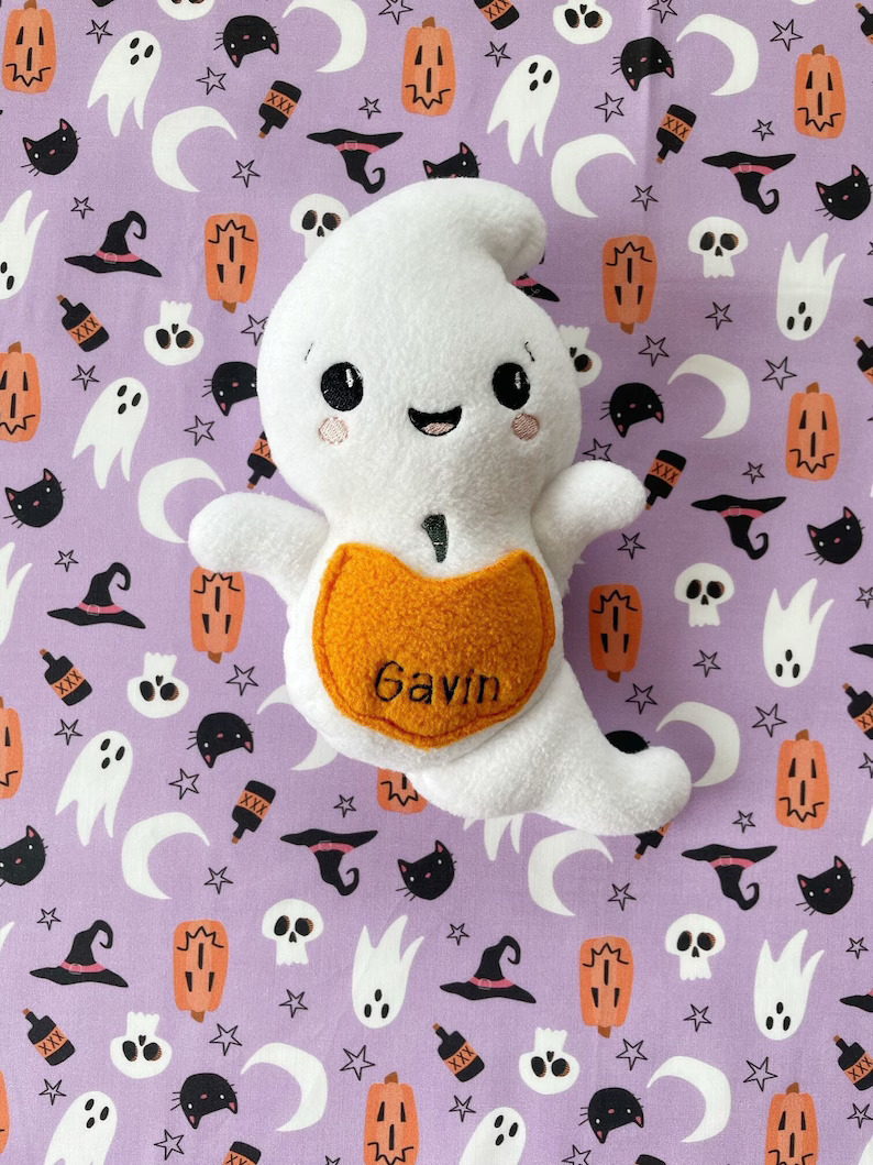 The pumpkin on the stomach is a pocket, where you could place a small candy treat or other small goodies. Our ghost stuffie is made of fleece and stuffed with poly-fil.