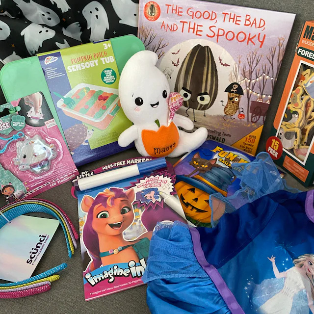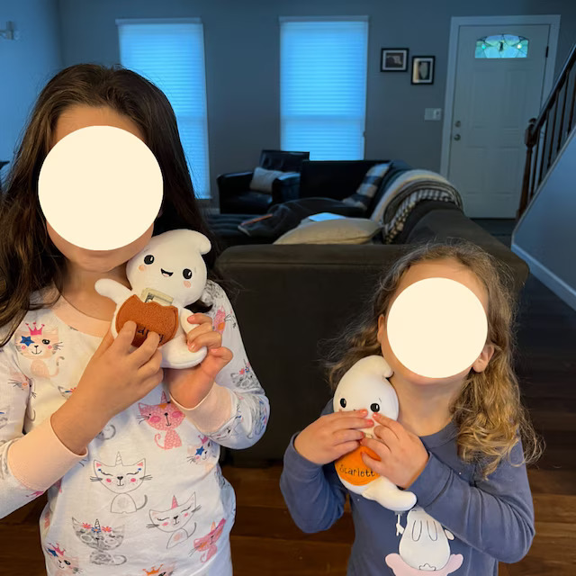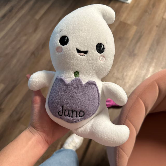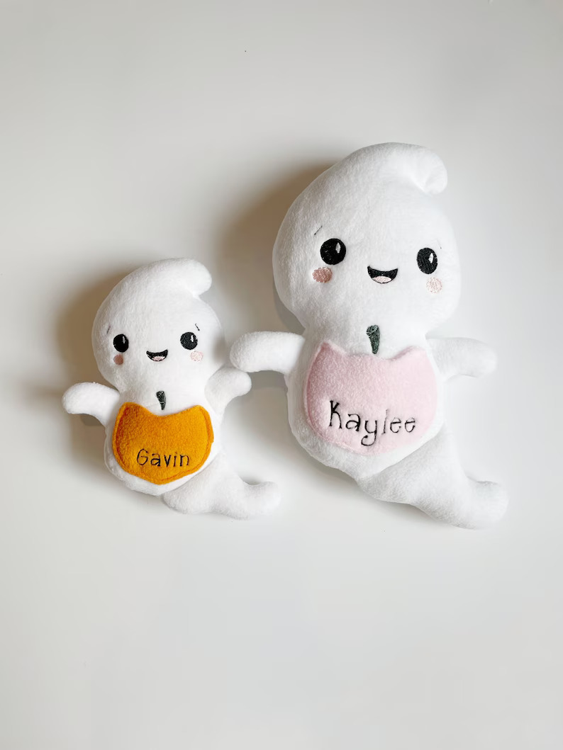 This ghost stuffie is a fun festive friend for your kiddos who love Halloween & perfect for your boo baskets! The ghost is available in two sizes. The small ghost measure about 8 inches tall and the large ghost is about 11 inches tall. See photo for size comparison.