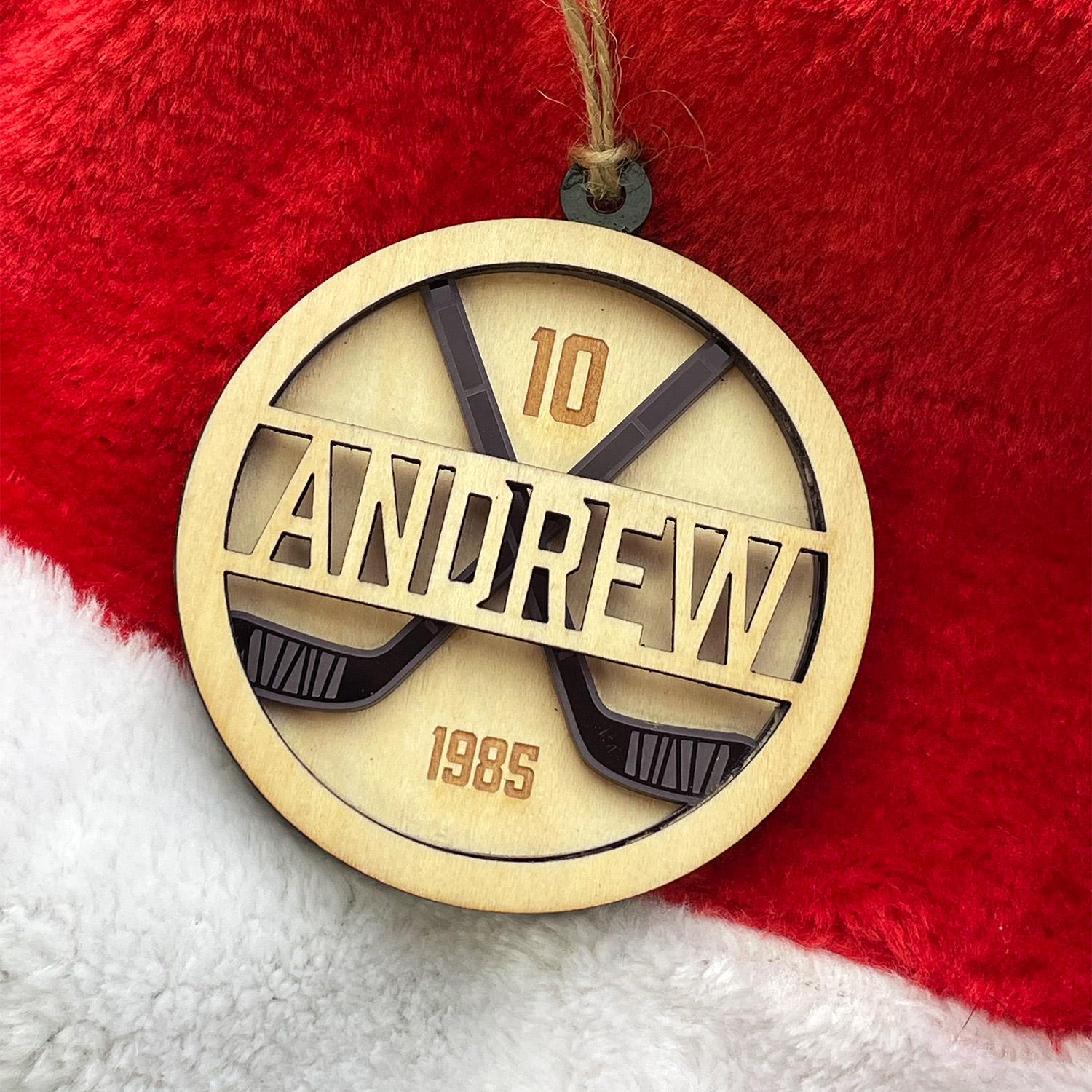 Keywords: personalized, kids ornaments, kids Christmas, children's ornament, wooden ornament, engraved, sports player, hockey sticks , sports jersey, athlete ornament, Hockey , Hockey player, young adult