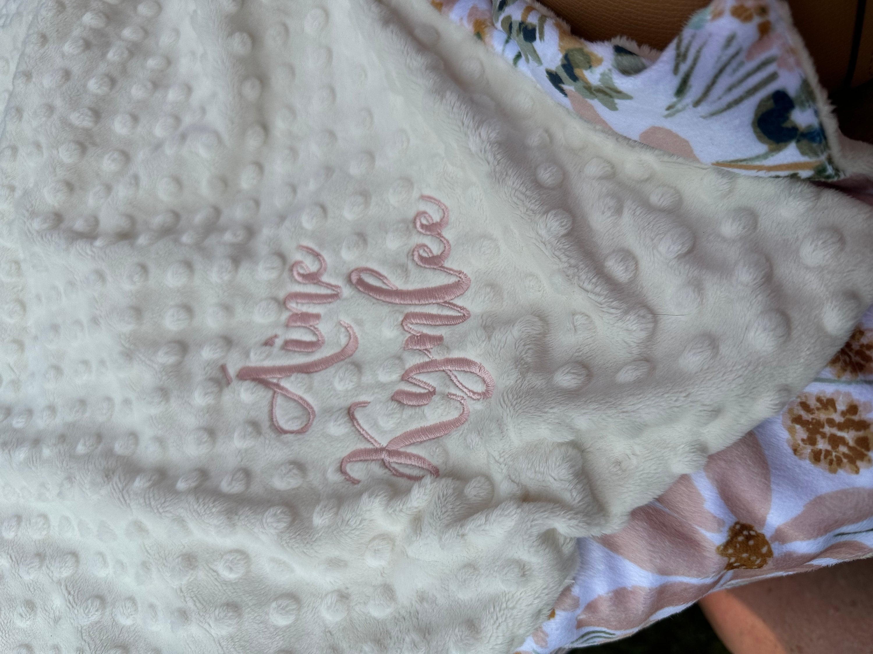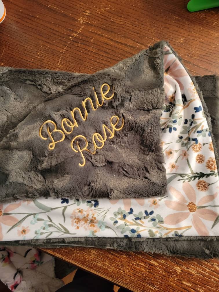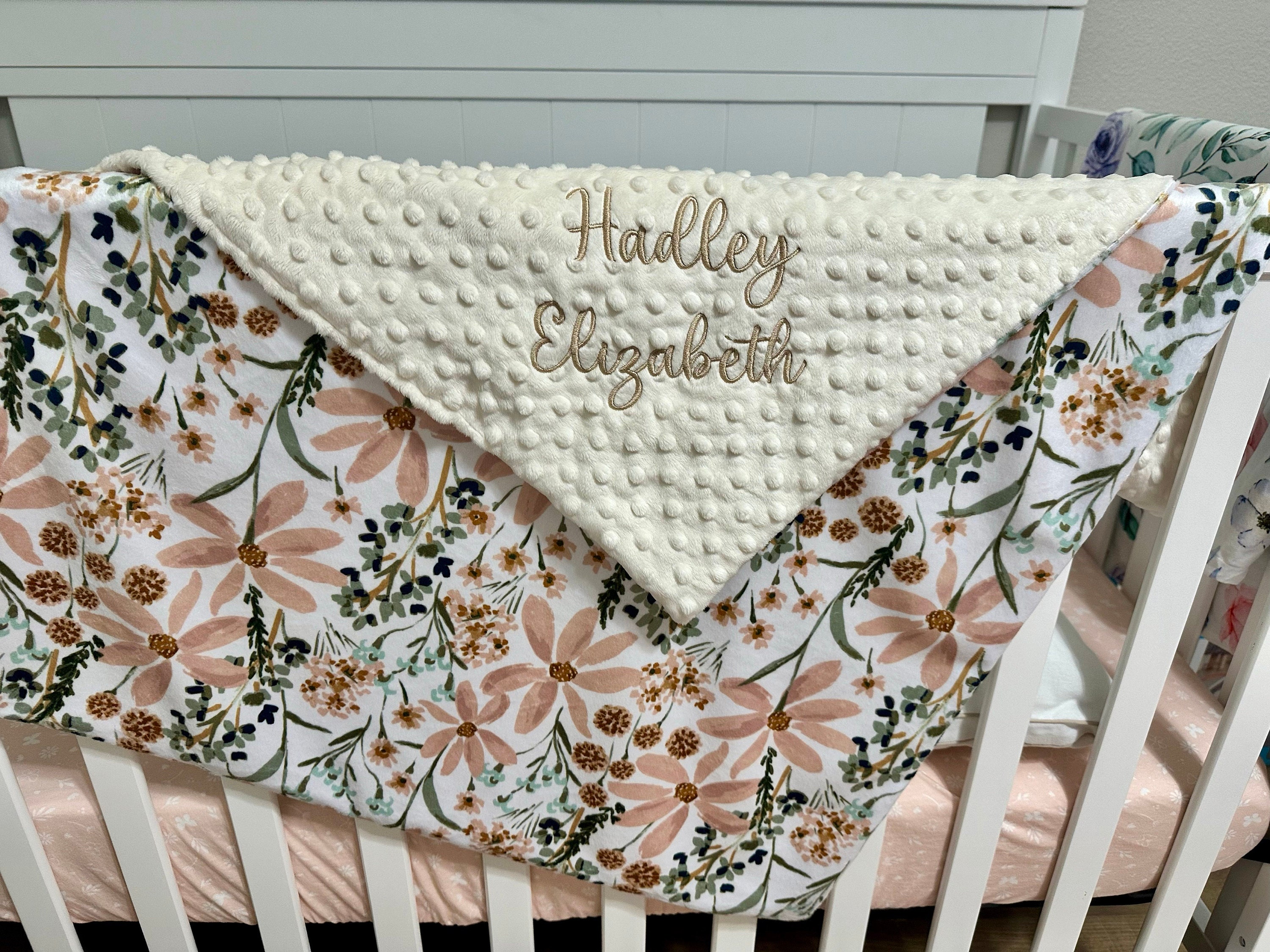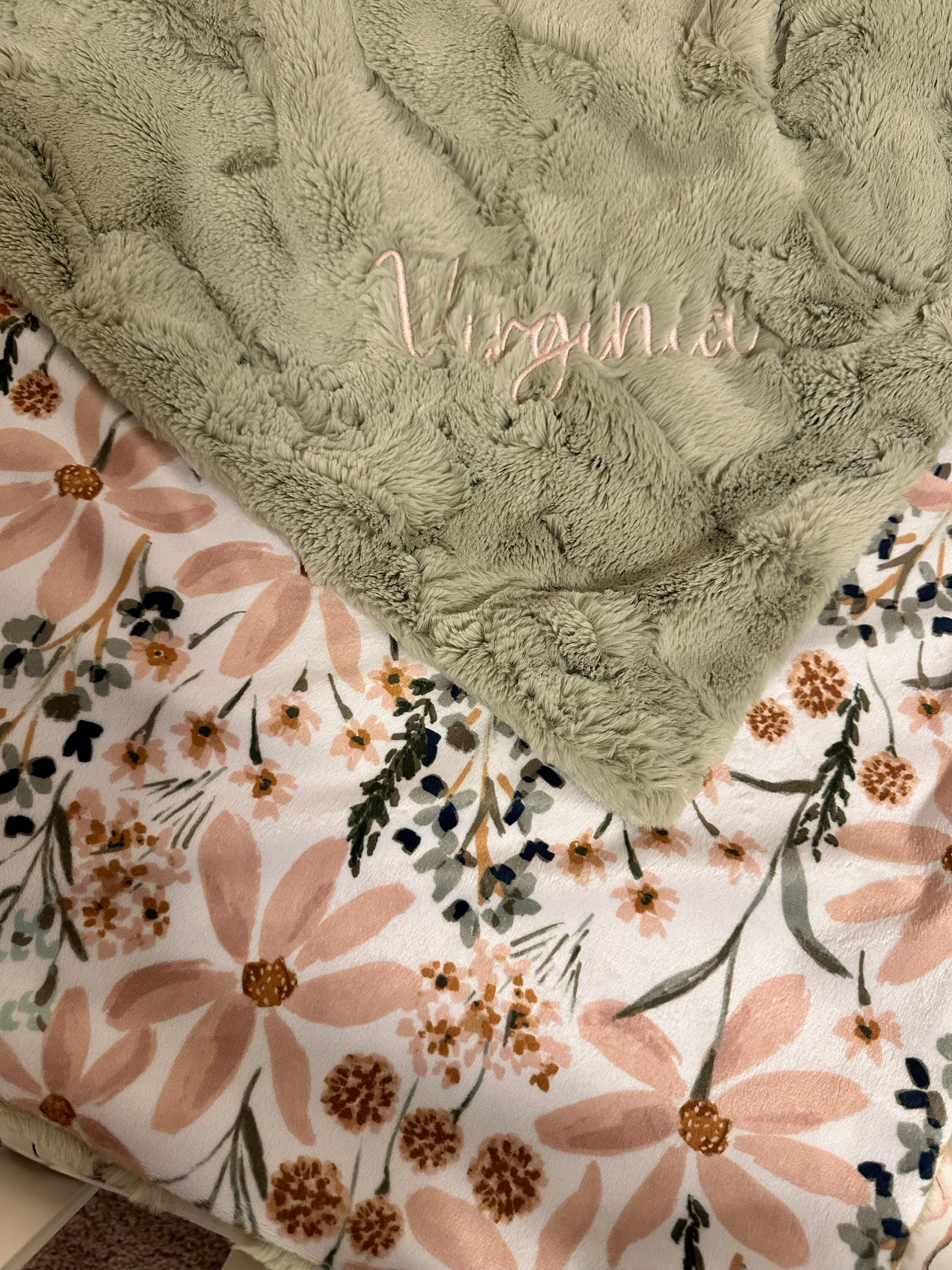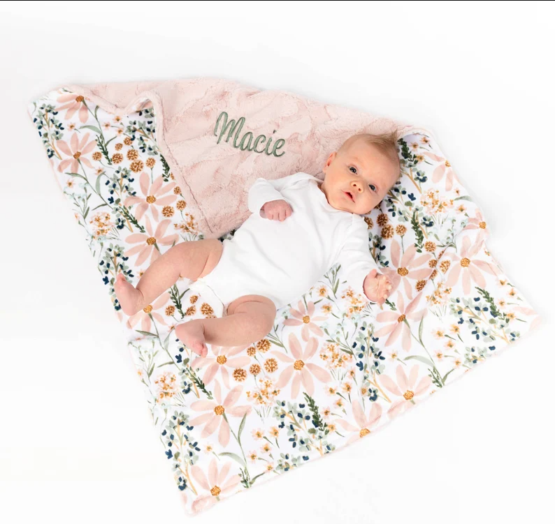 This handmade floral baby blanket can be personalized with your baby girl's name. Each name is custom embroidered during the process of making your personalized blanket. Both sides of the blanket are made of very soft minky, so no matter which side is used, baby will love the feel.