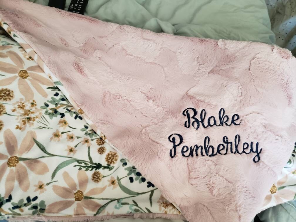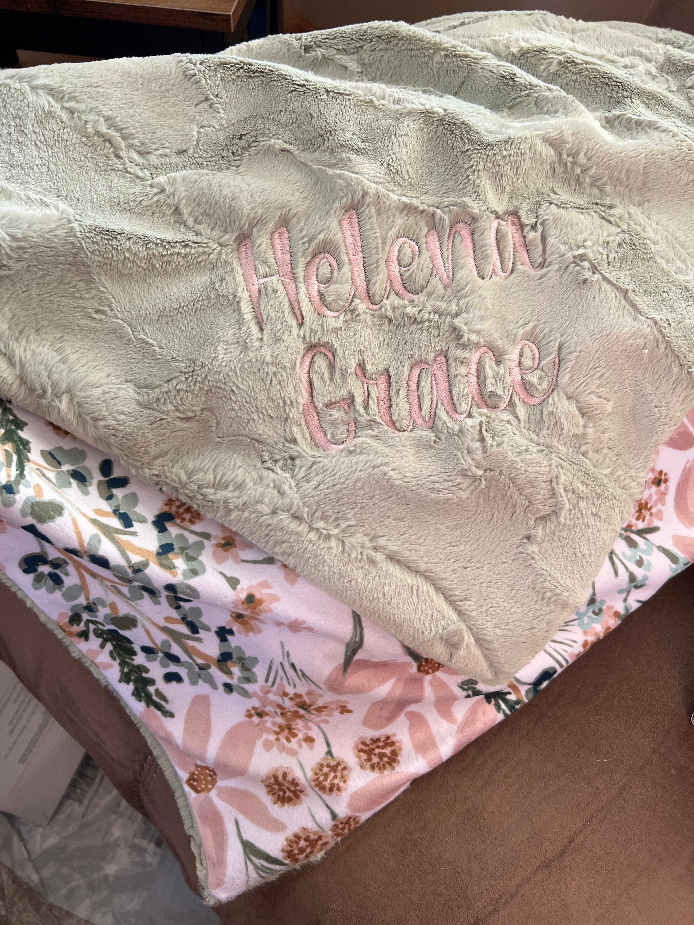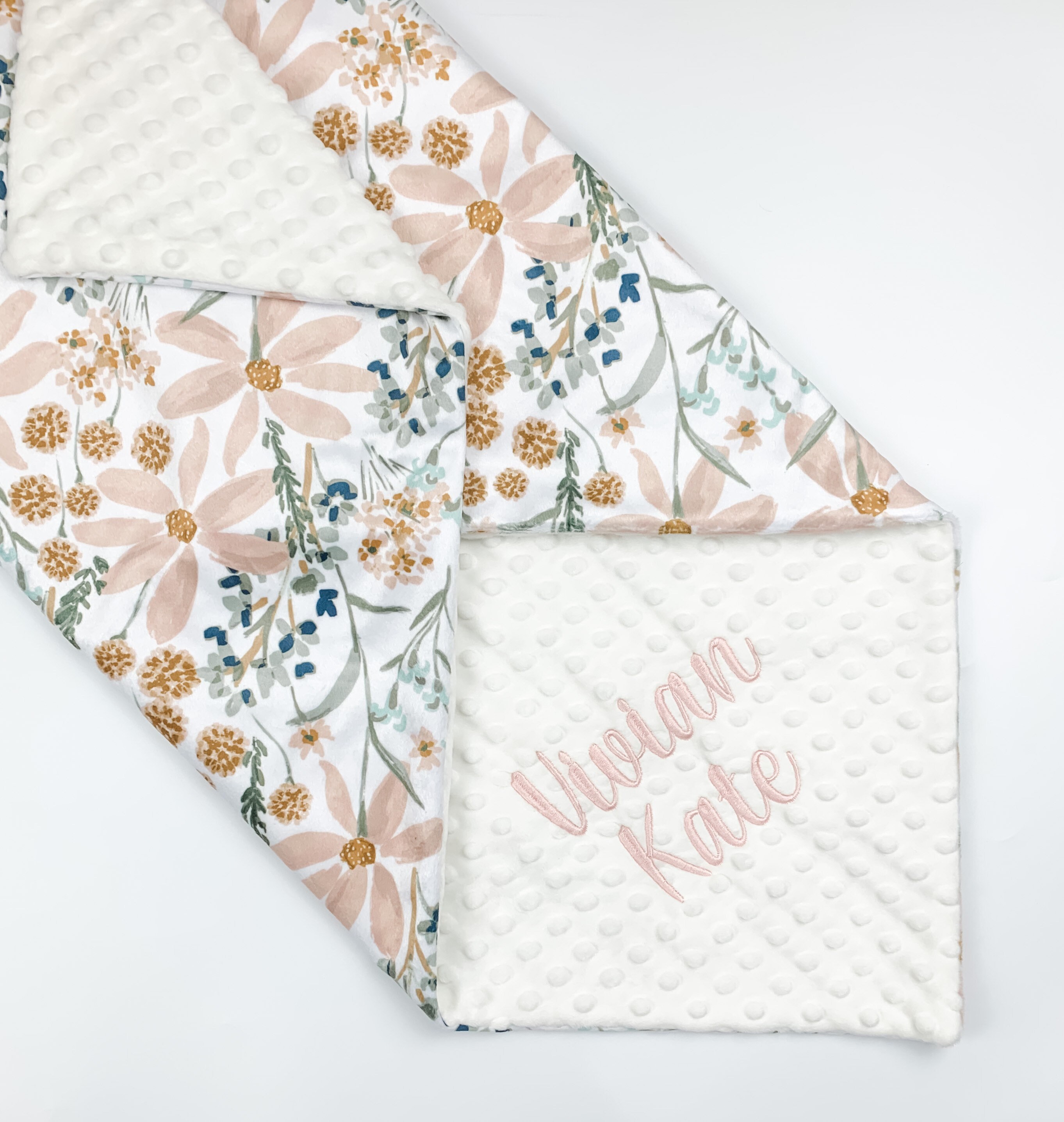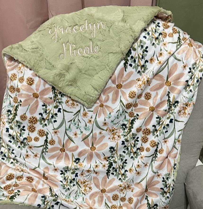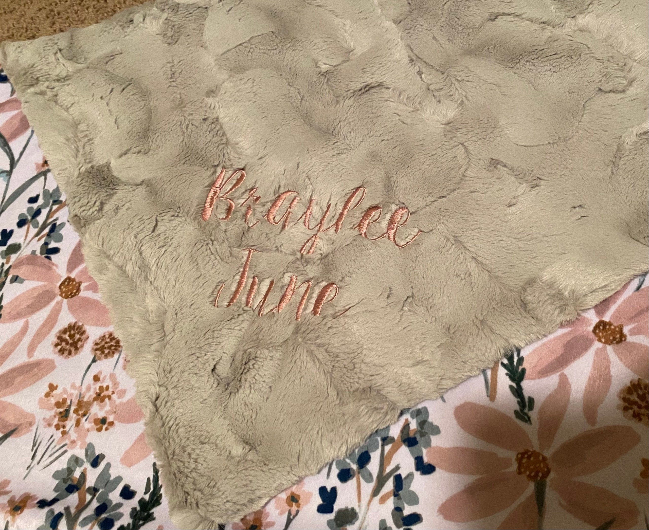 This handmade floral baby blanket can be personalized with your baby girl's name. Each name is custom embroidered during the process of making your personalized blanket. Both sides of the blanket are made of very soft minky, so no matter which side is used, baby will love the feel.