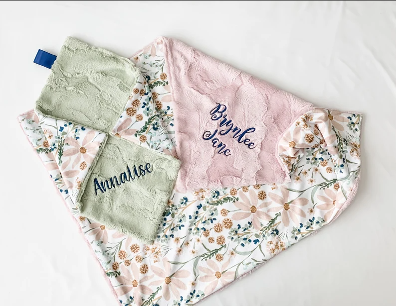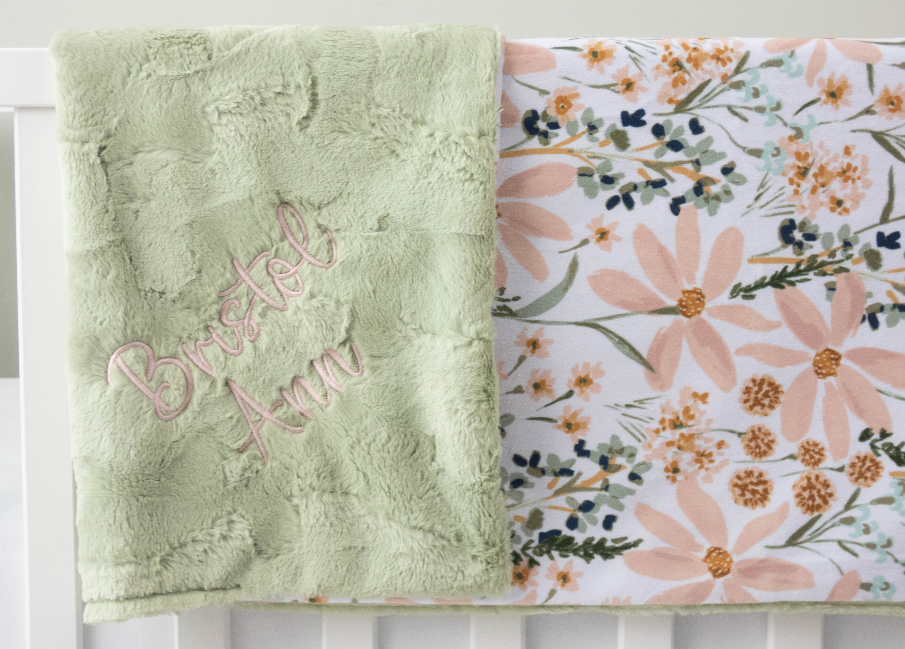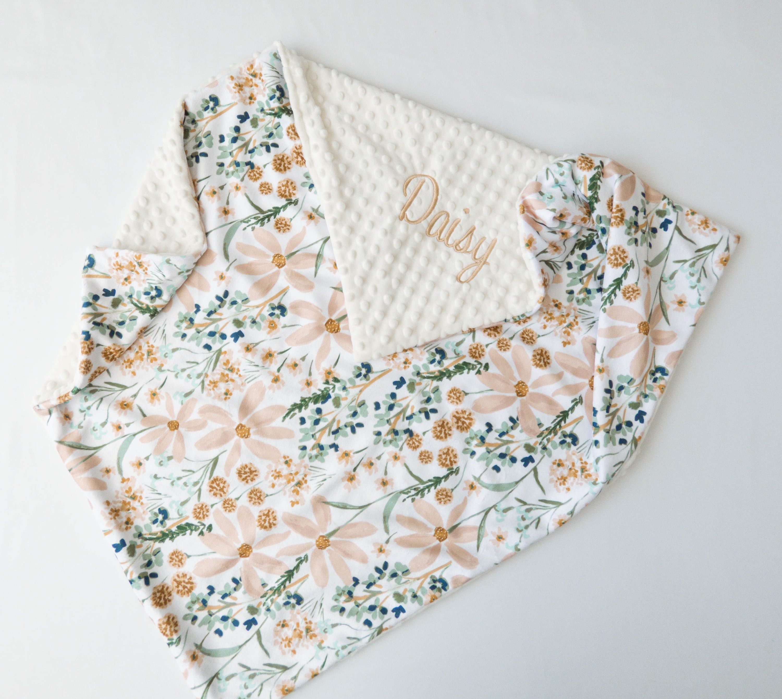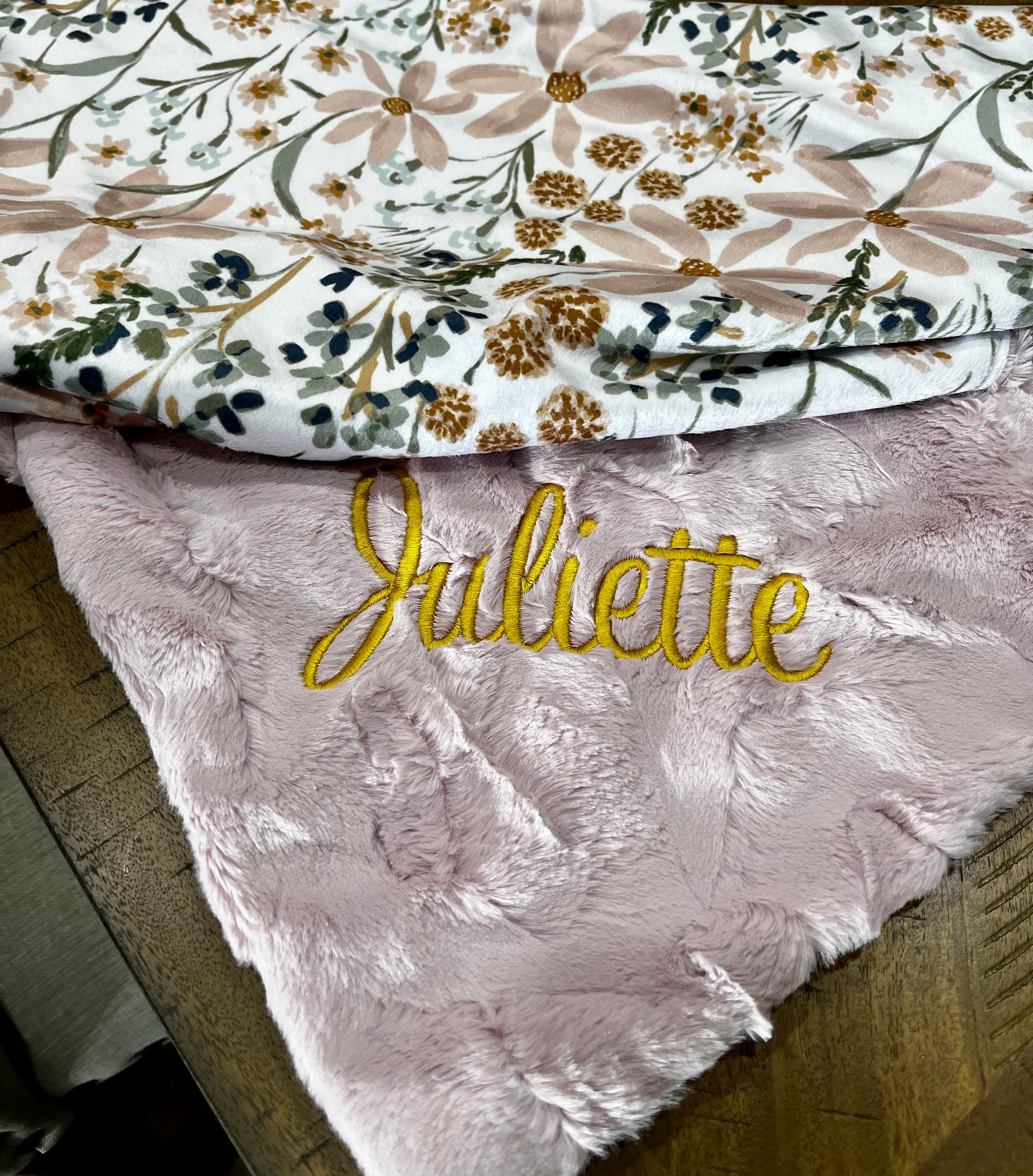 This handmade floral baby blanket can be personalized with your baby girl's name. Each name is custom embroidered during the process of making your personalized blanket. Both sides of the blanket are made of very soft minky, so no matter which side is used, baby will love the feel.