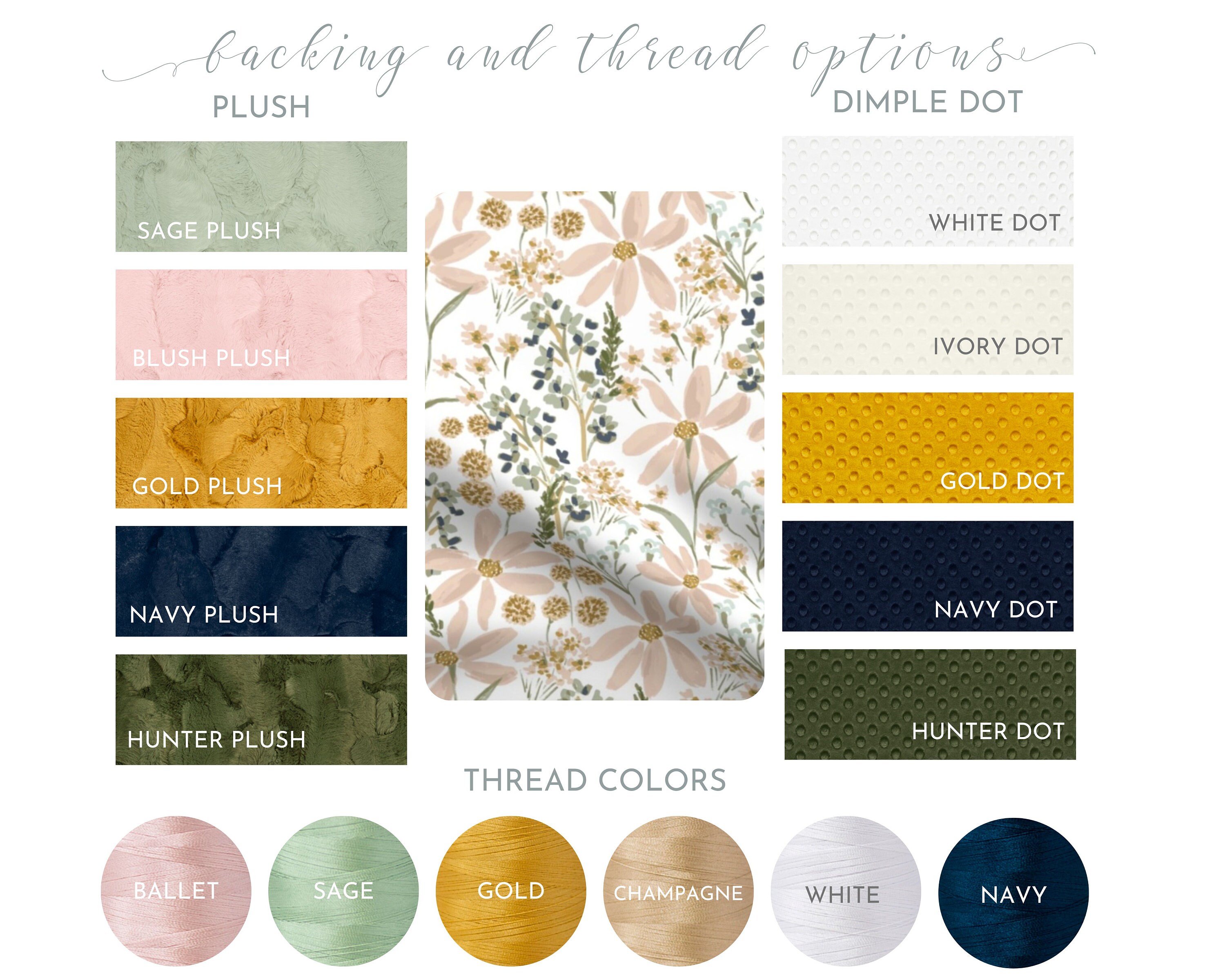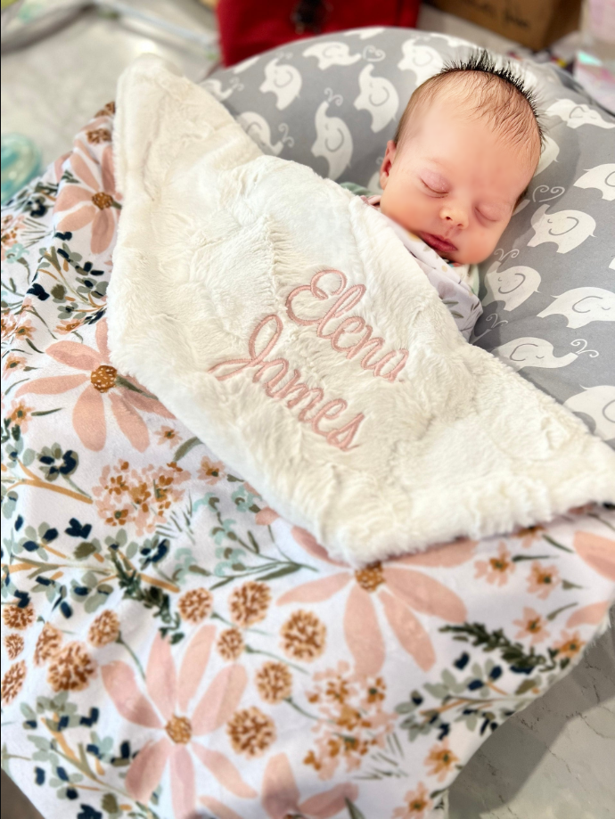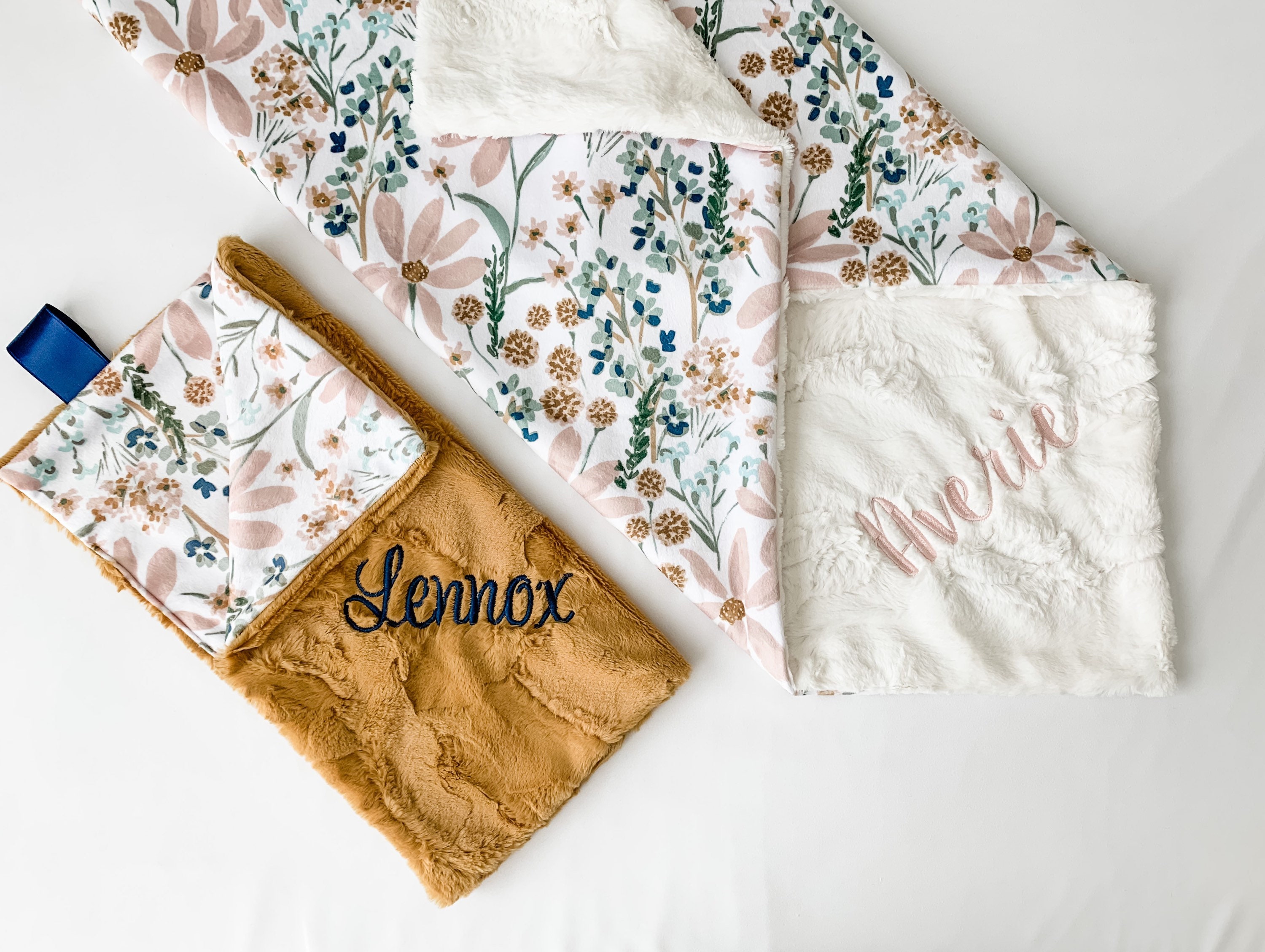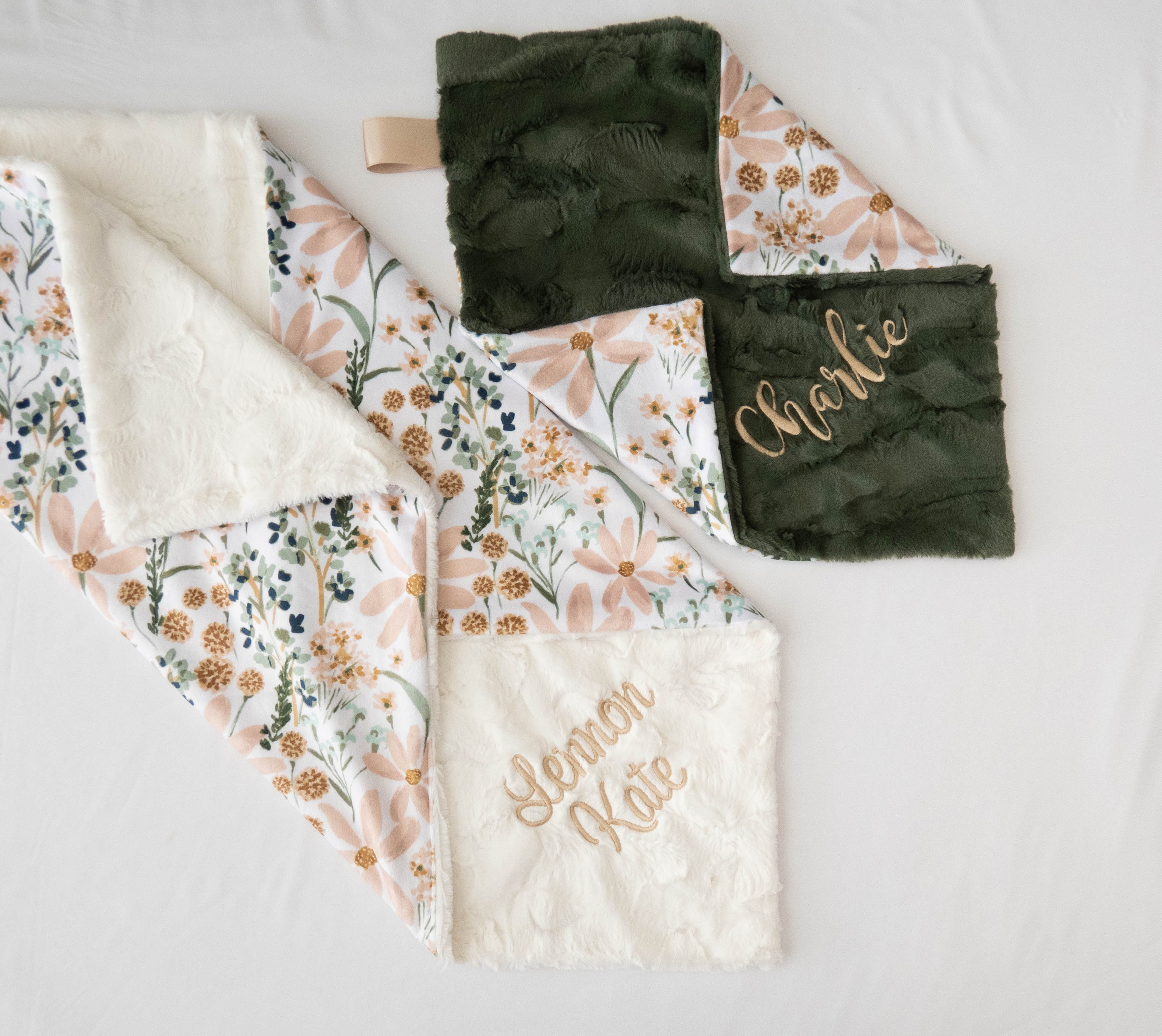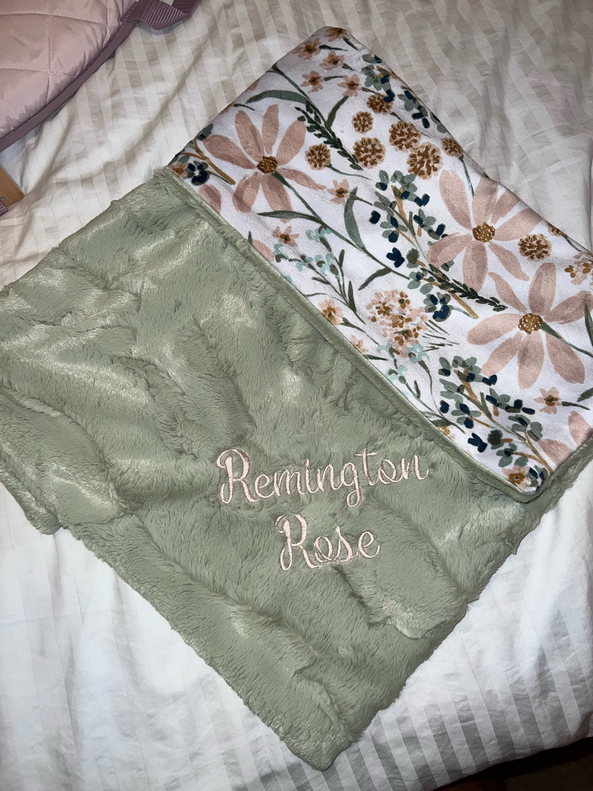 This handmade floral baby blanket can be personalized with your baby girl's name. Each name is custom embroidered during the process of making your personalized blanket. Both sides of the blanket are made of very soft minky, so no matter which side is used, baby will love the feel.