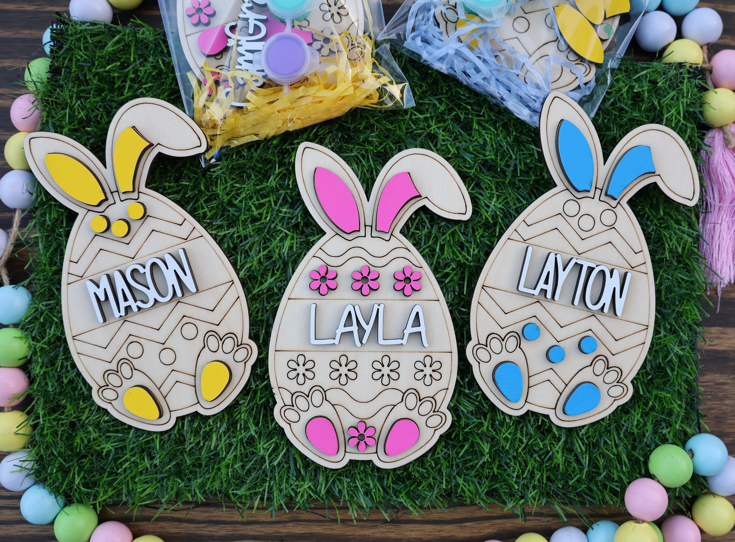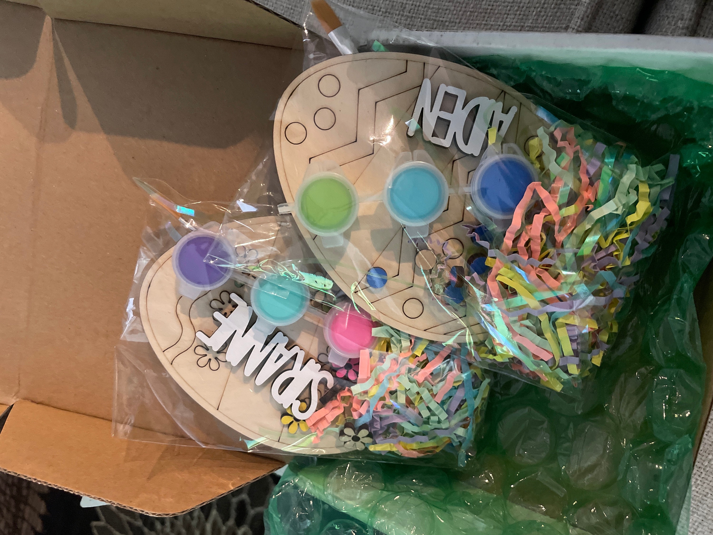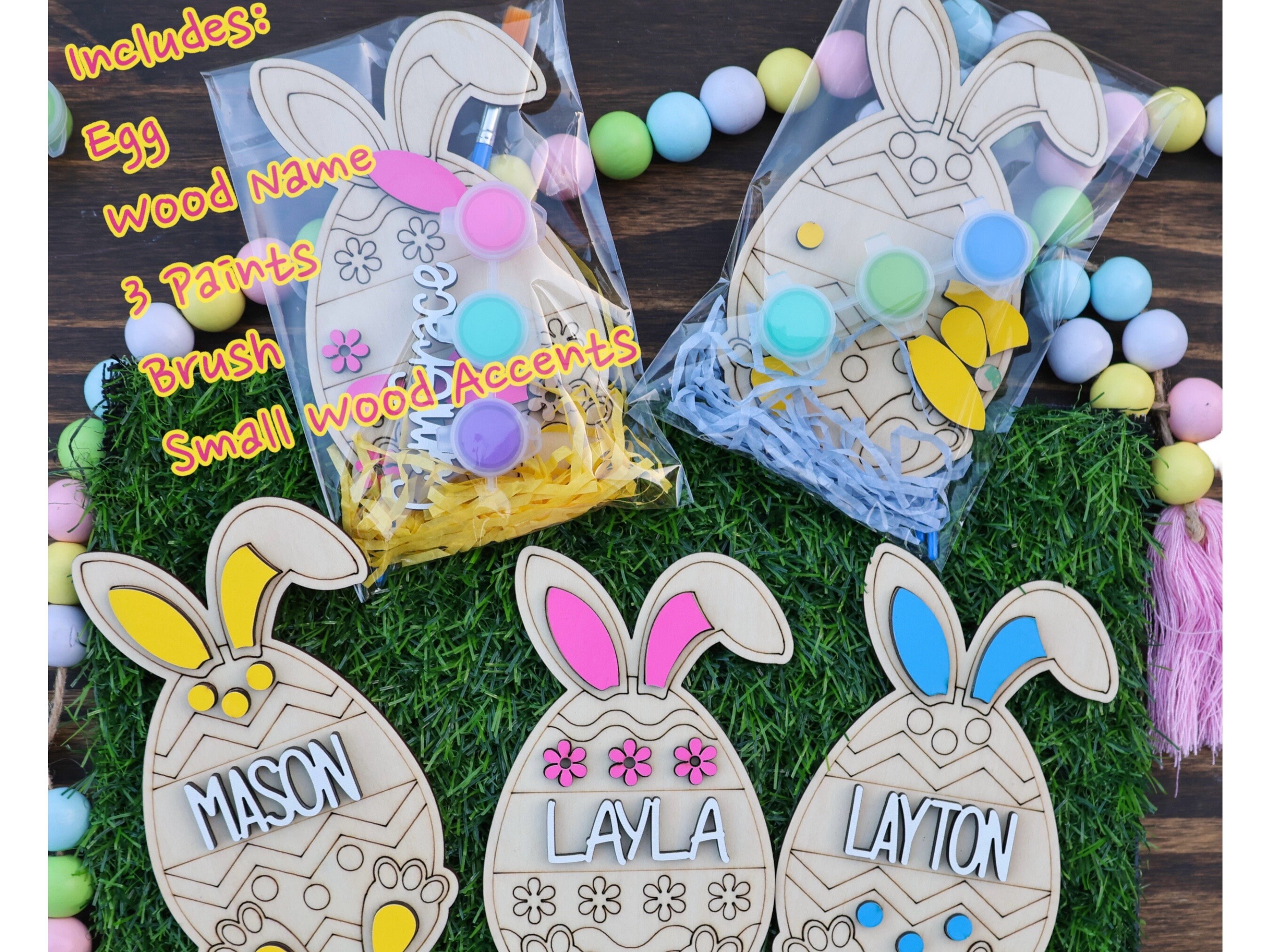 These DIY Easter Egg Paint kits make the neatest craft! They measure 5” tall and are made from 1/8” laser cut birch wood. Each kit comes with one egg, adhesive backed painted pieces of either 3 flowers or 3 dots, 3 paints, paint brush, and your child’s name cut from wood backed w/ adhesive!