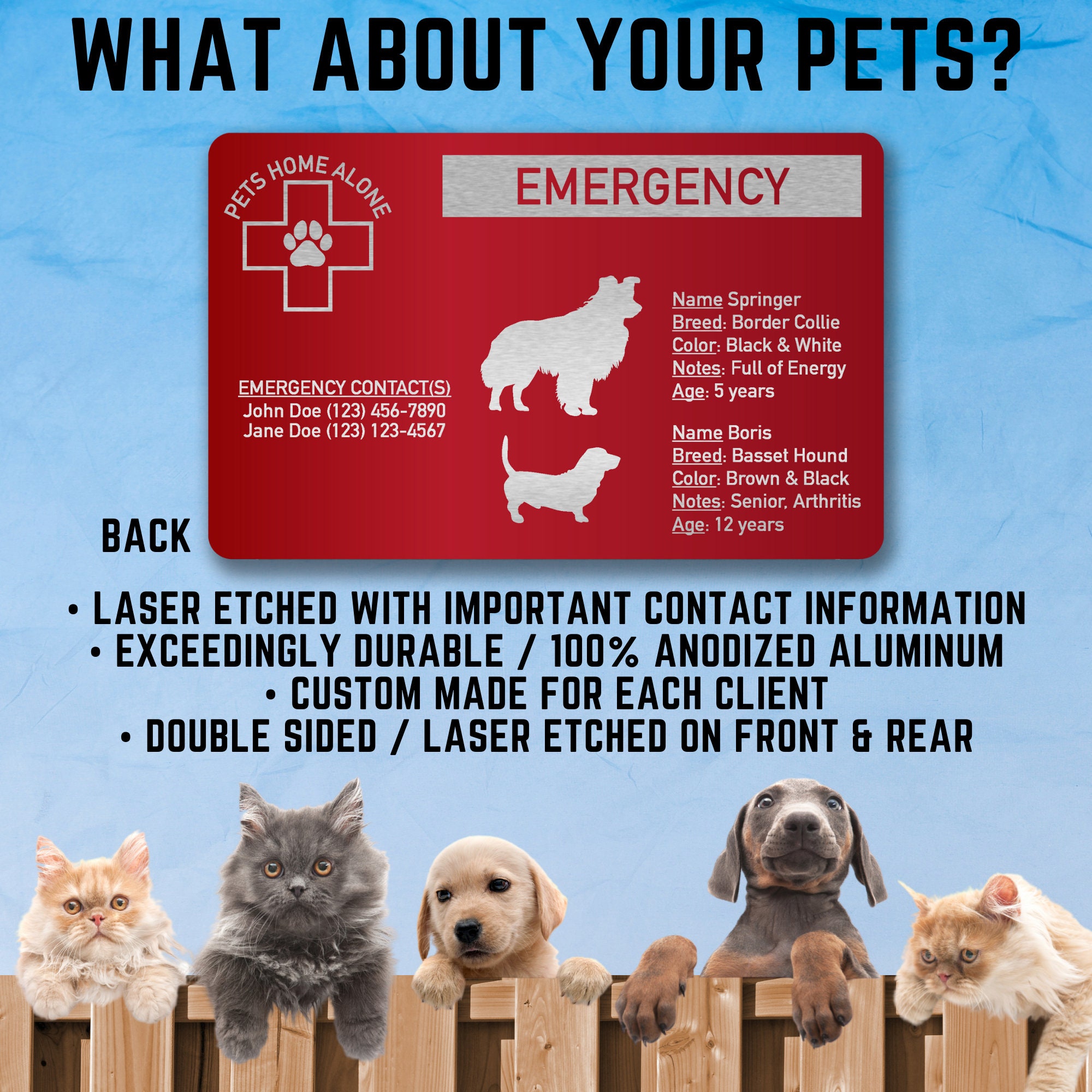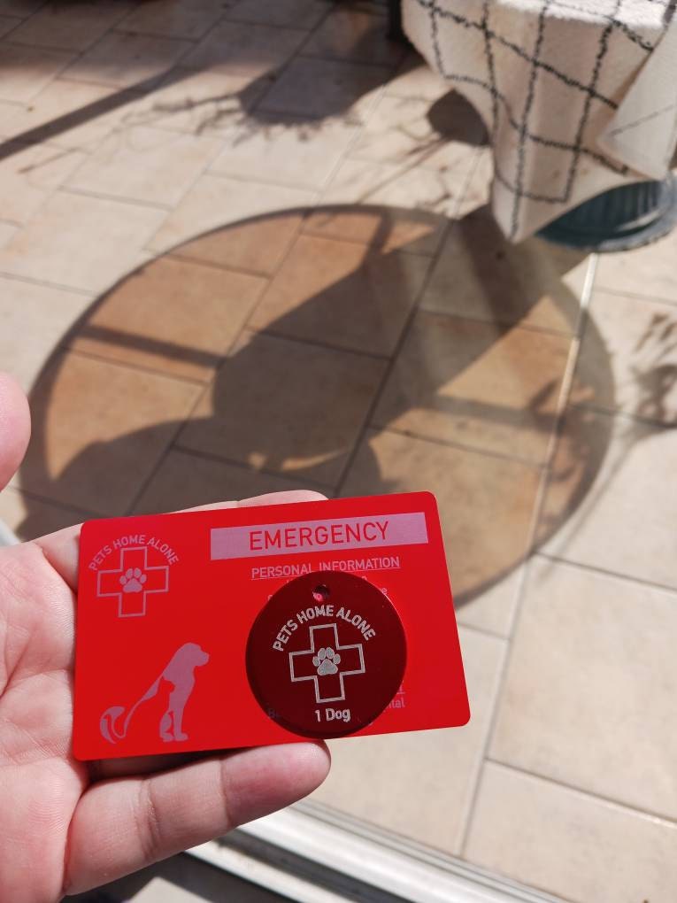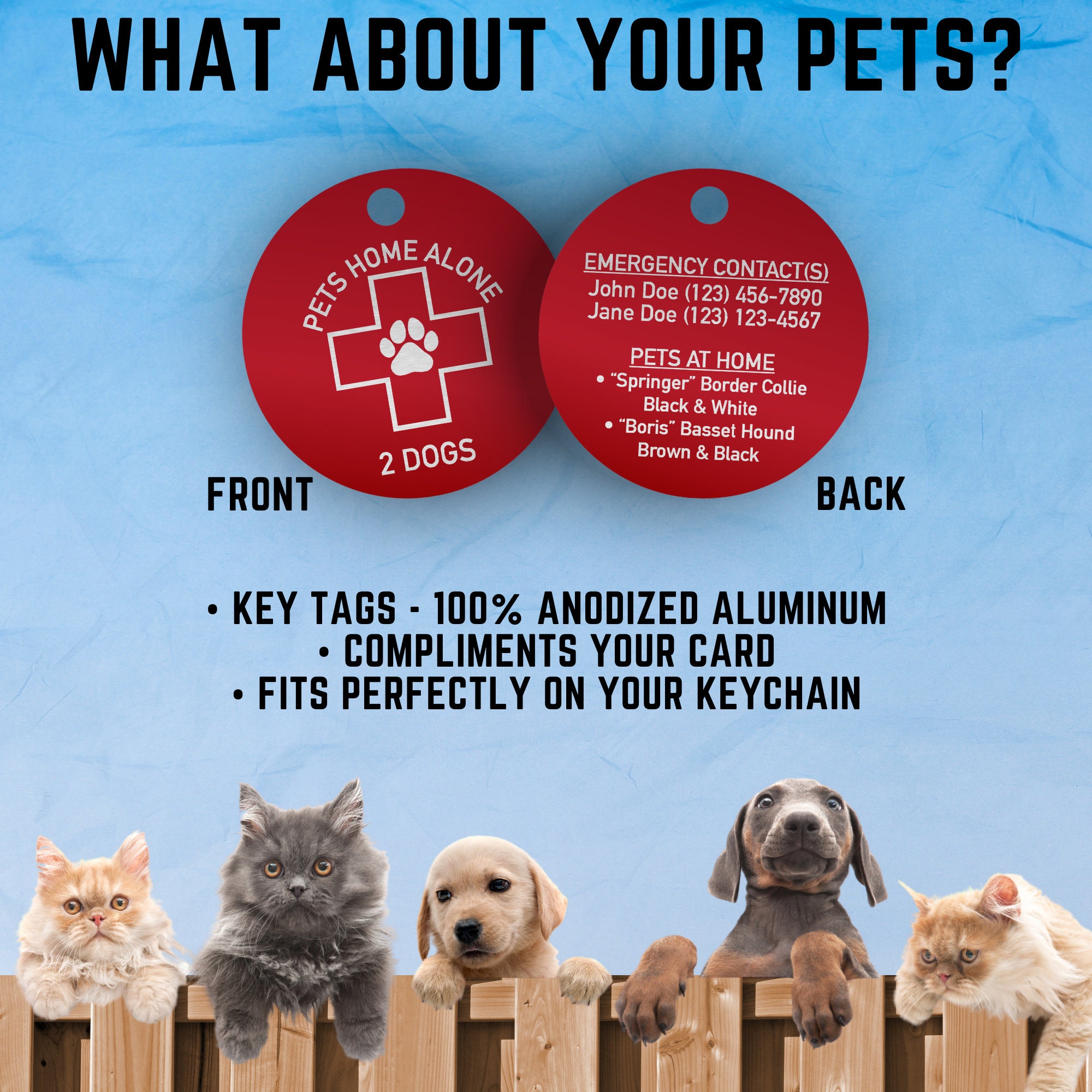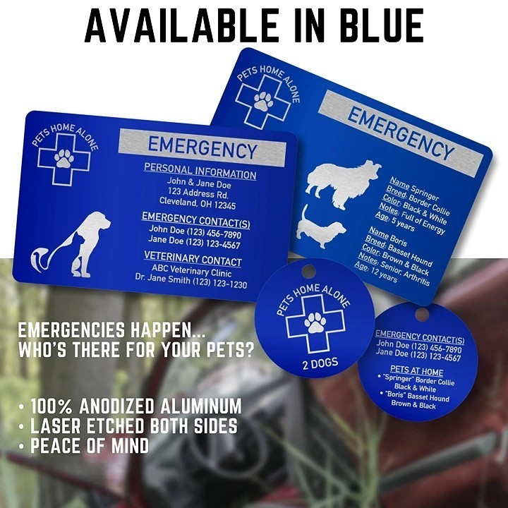 Keep your furry friend safe with our Anodized Aluminum Emergency "Pets at Home" ID Card. Designed with pet owners in mind, this card provides important information about your pet in case of an emergency. Made of durable anodized aluminum, this card is available in 2 attractive colors to suit your style. The accompanying anodized aluminum key tag ensures that this vital information is always within reach. Customizable to include your pet's name, emergency contact information, and any medical needs, this ID card is an essential tool for responsible pet ownership. Keep your pet protected and order yours today!