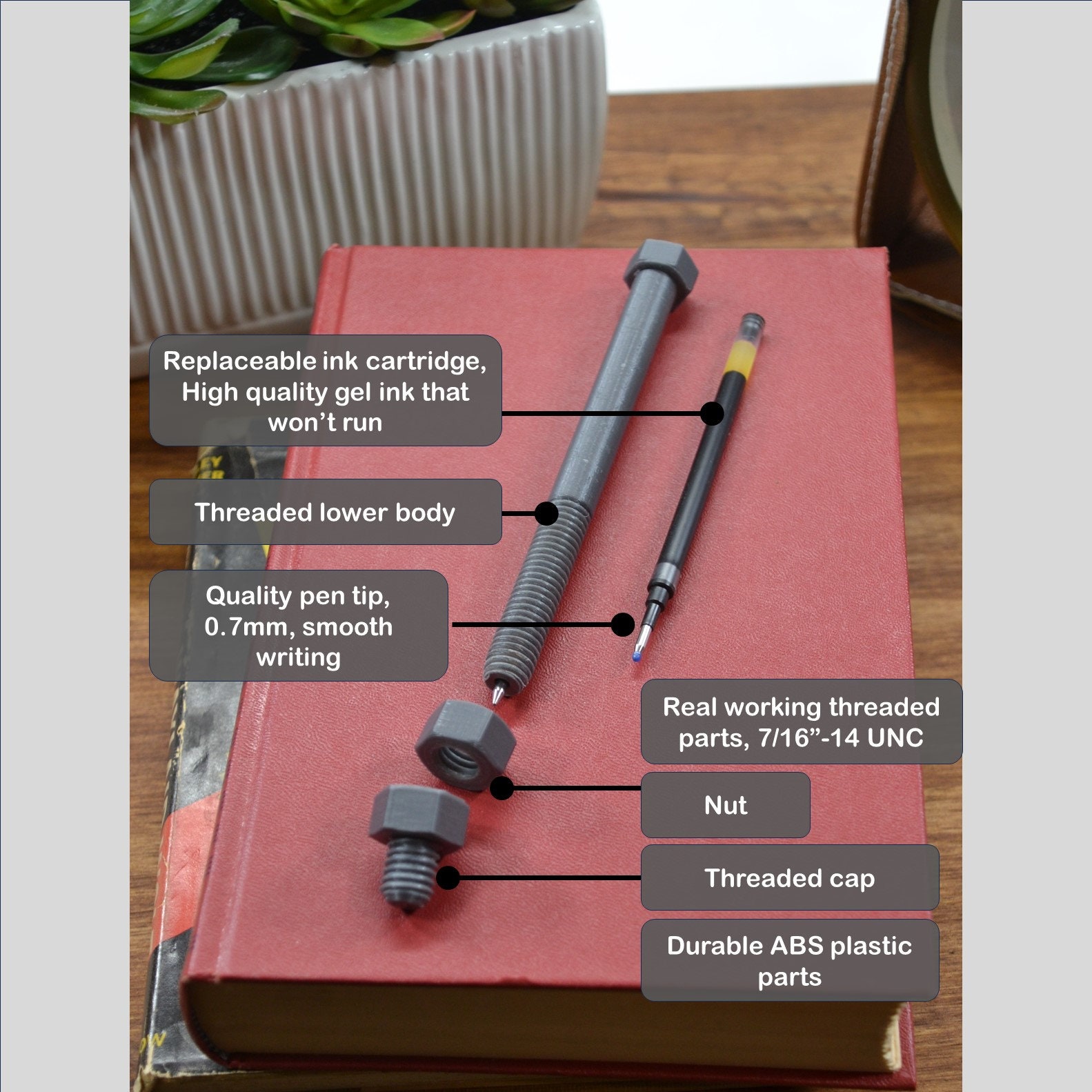 Its a pen. Its a fidget. Its a fidget pen! This pen is 50% bolt, 50% pen and 100% fun. It features a smooth writing gel ink cartridge that gives calligraphy quality writing without running. This pen is made from durable ABS plastic and is lightweight and comfortable.
