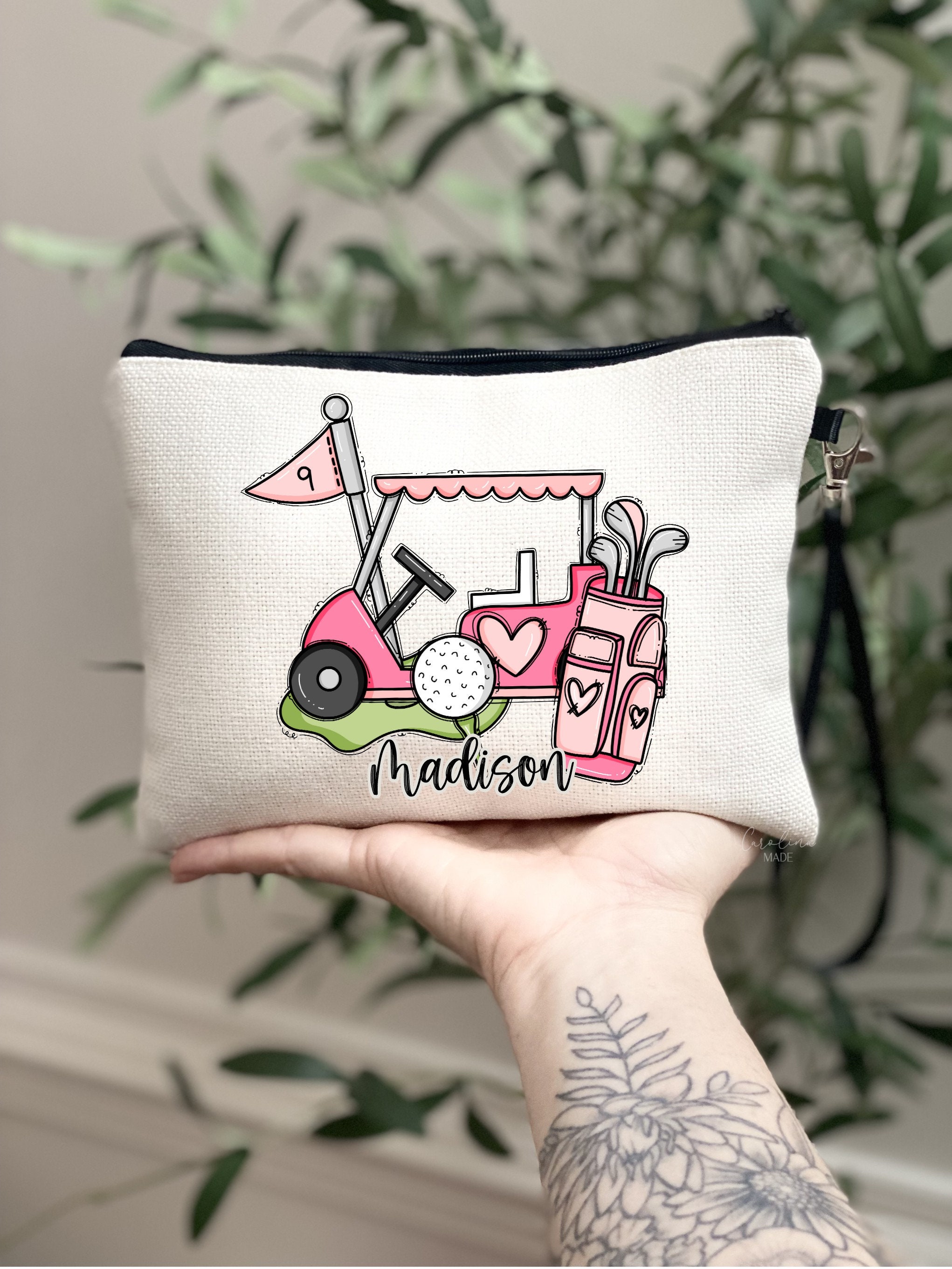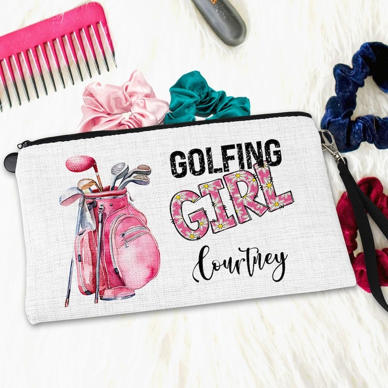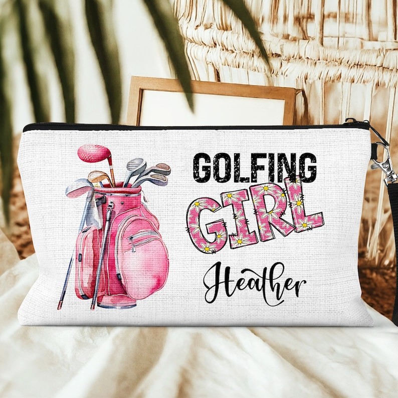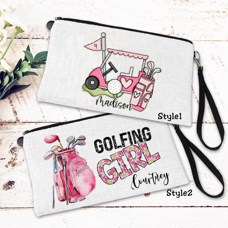 The personalized girly golf bag is a stylish and versatile linen wristlet, perfect for storing your cosmetics and other essentials. With a convenient zipper pouch, it is the ideal accessory for on-the-go, golf outings and more. Personalize yours and make it truly unique!