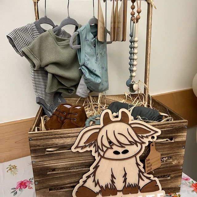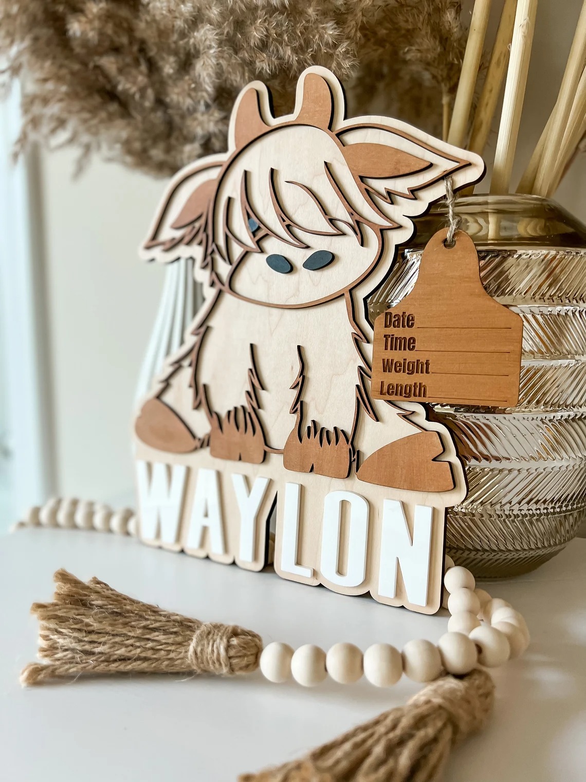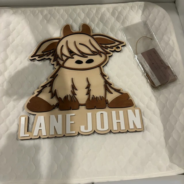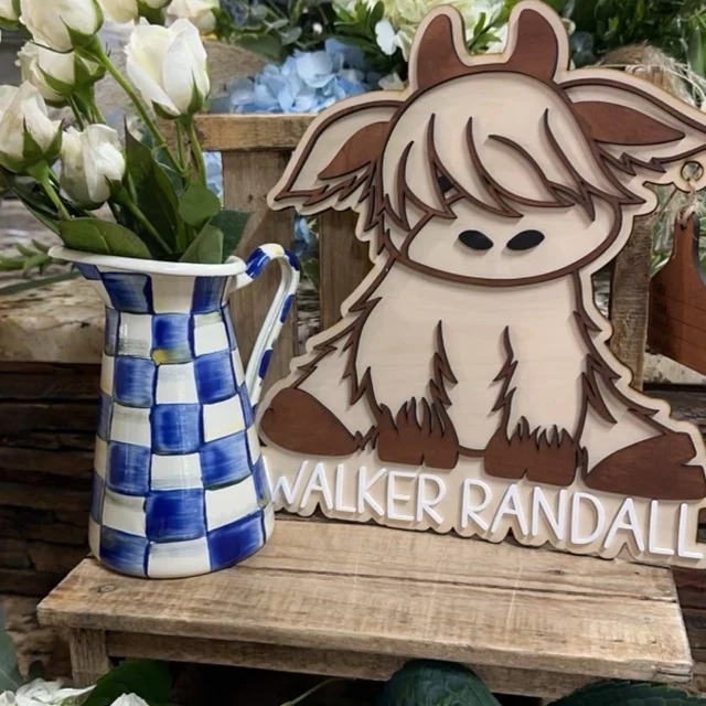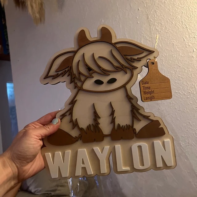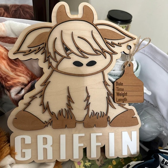 How cute is this highland cow birth announcement? Attached is a cow tag with birth stats! Hang this adorable piece in your nursery for the perfect addition! 11” tall