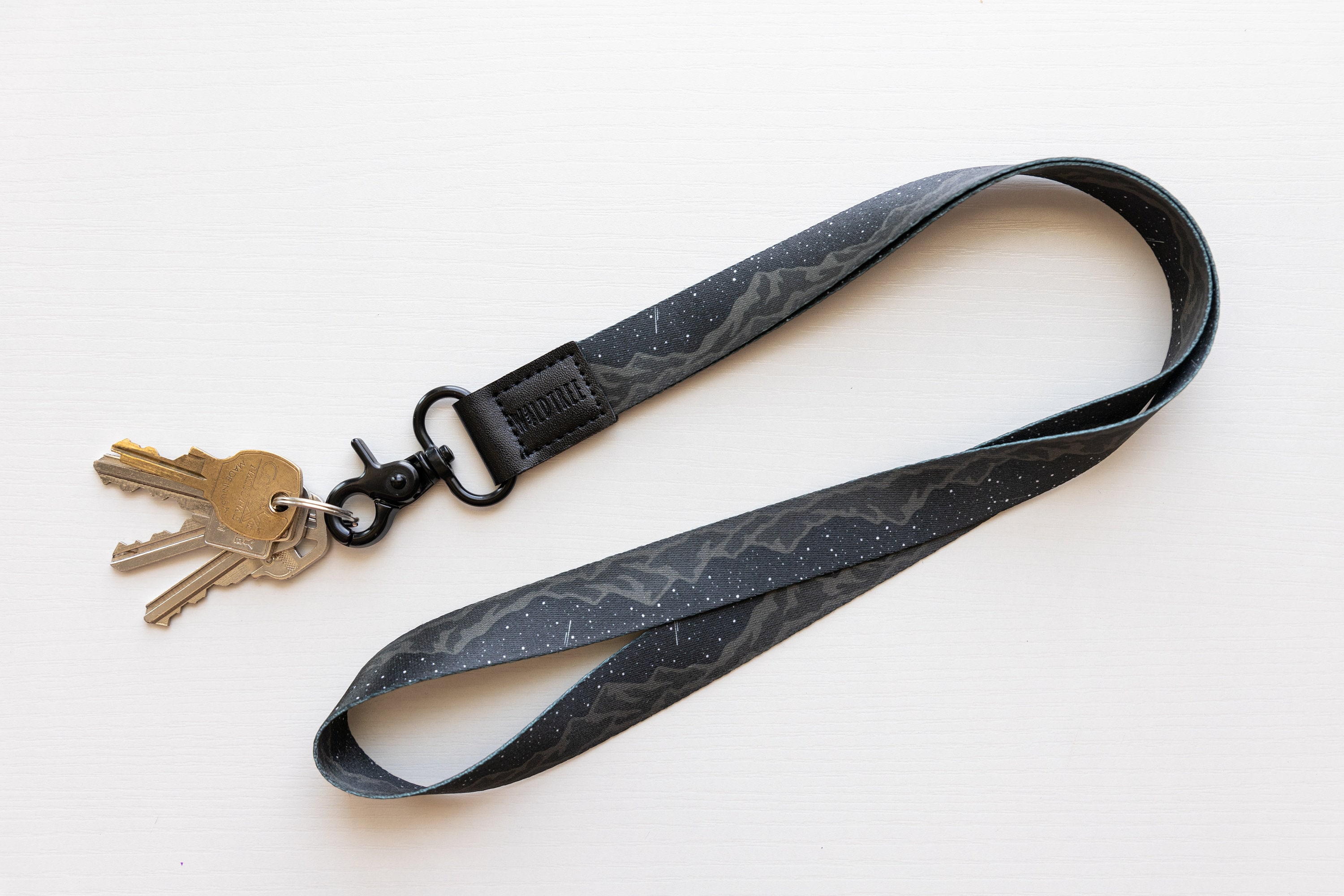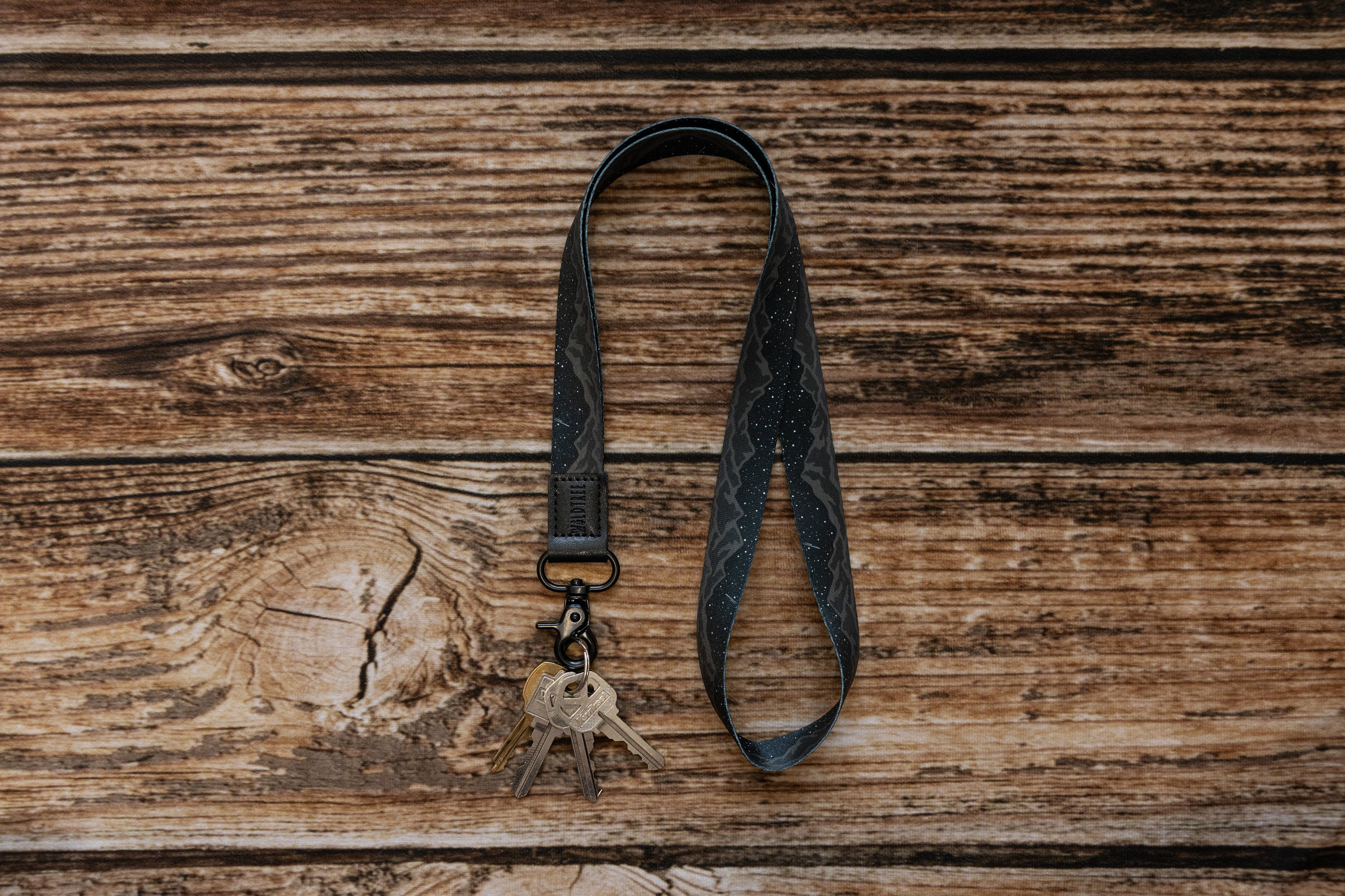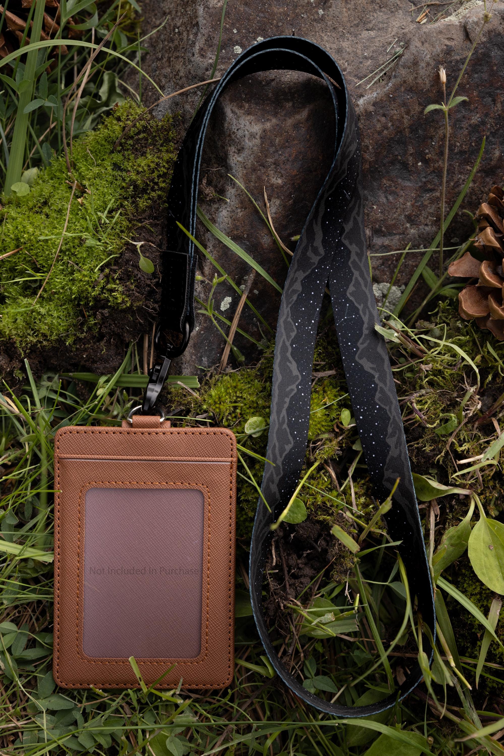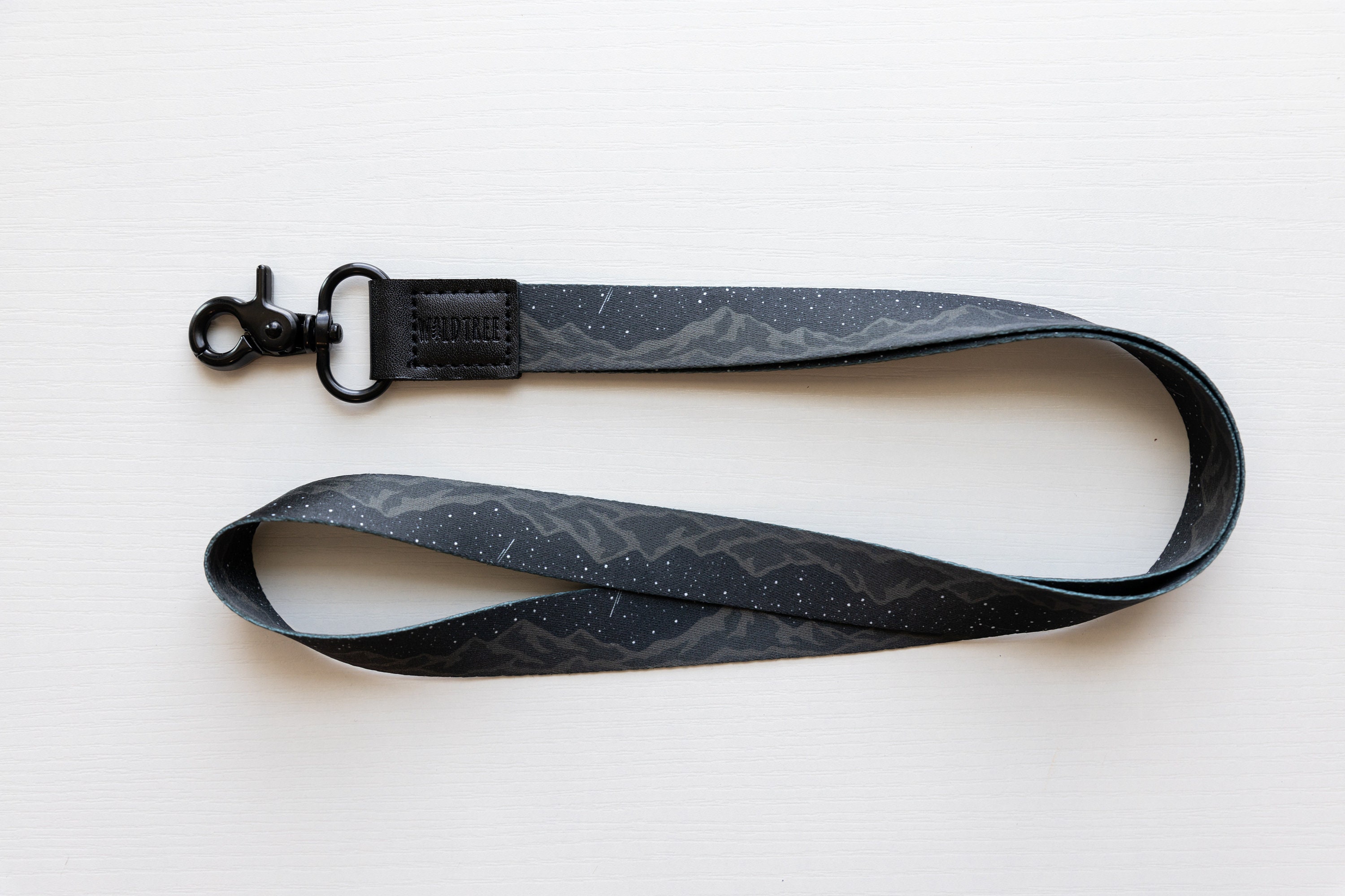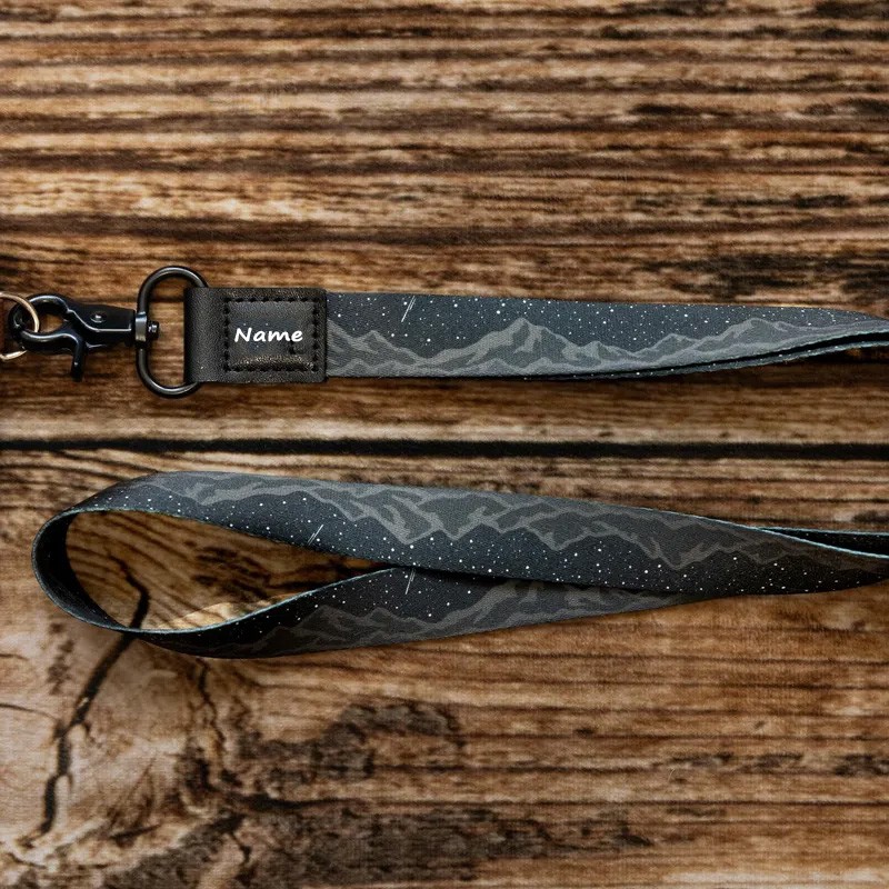 High-quality Long Neck lanyard Keychain Featuring Mountains and Stars with Vegan Black Leather Ends. Great for ID badges, Keys, Wallets, etc..