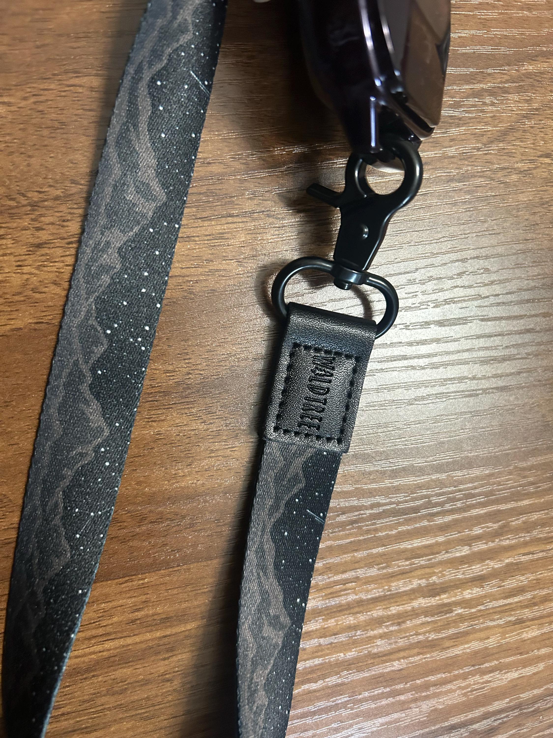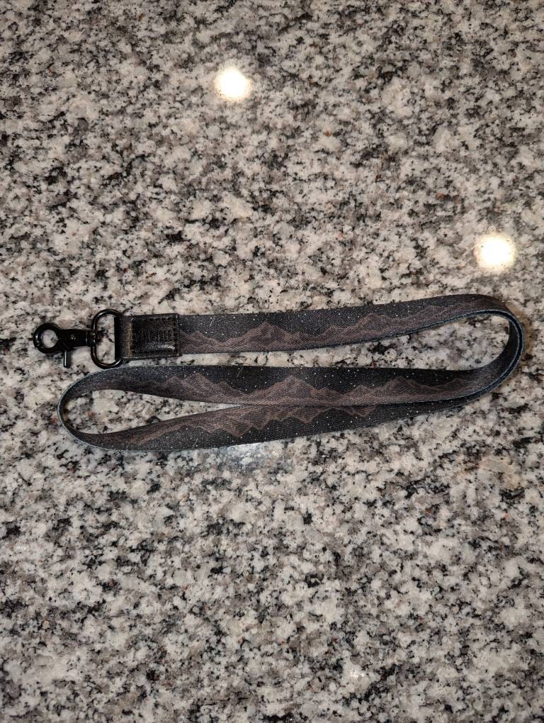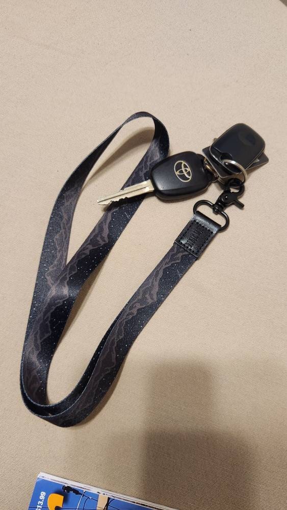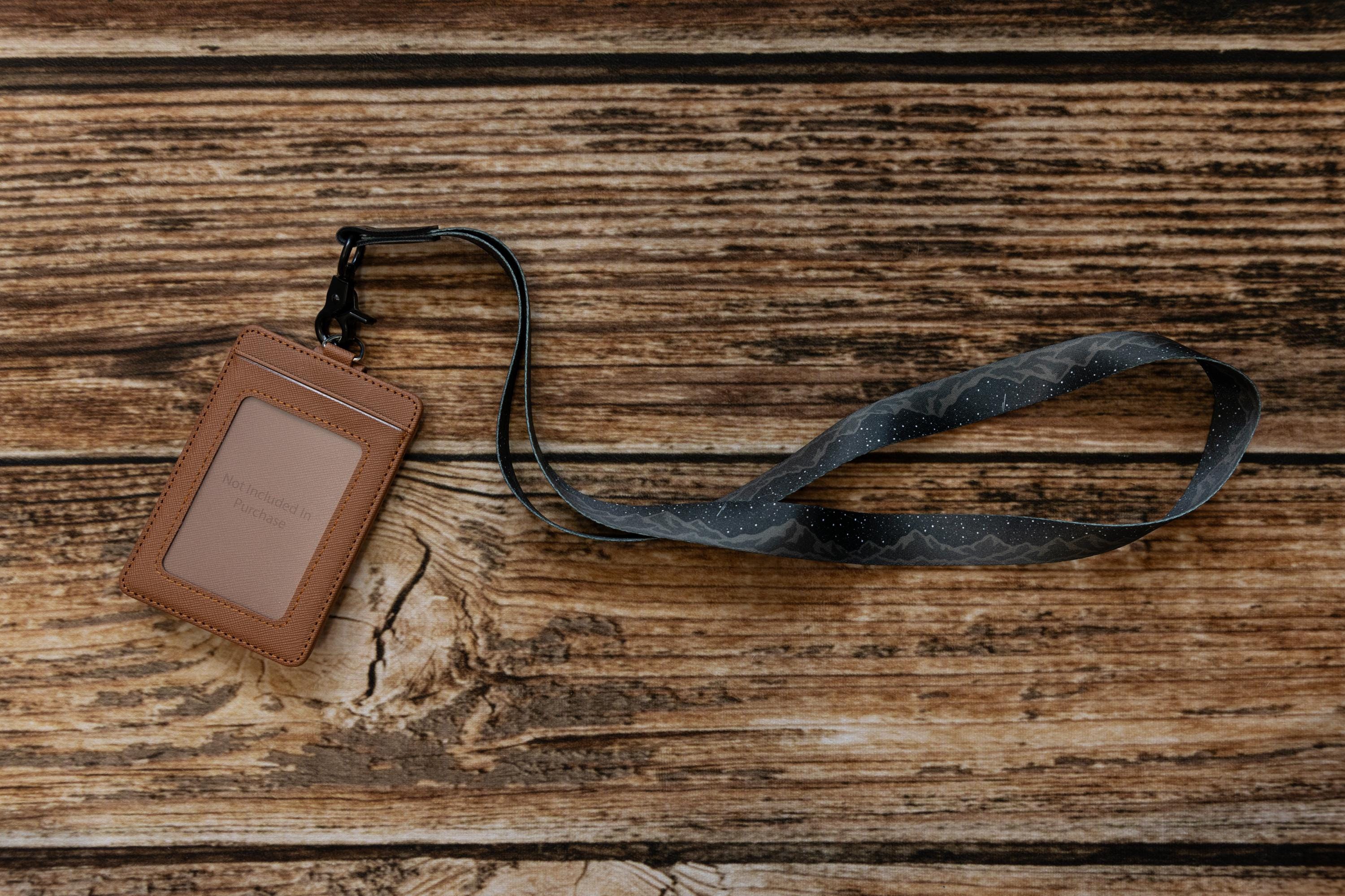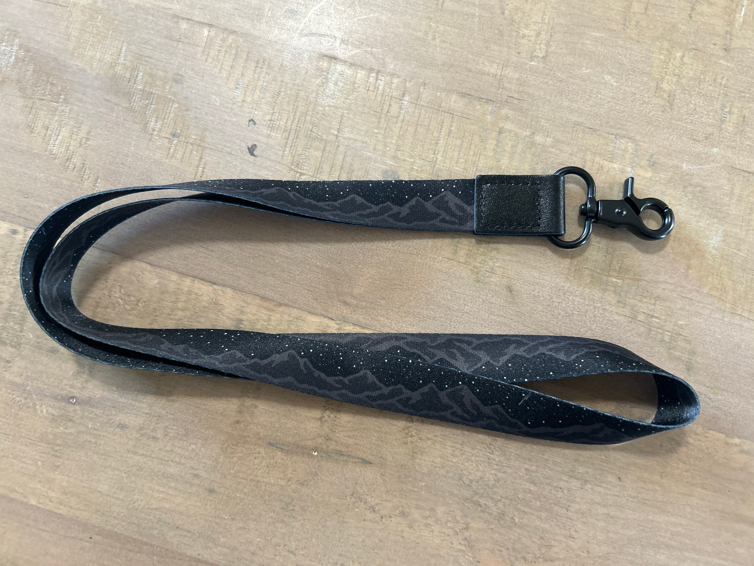 High-quality Long Neck lanyard Keychain Featuring Mountains and Stars with Vegan Black Leather Ends. Great for ID badges, Keys, Wallets, etc..