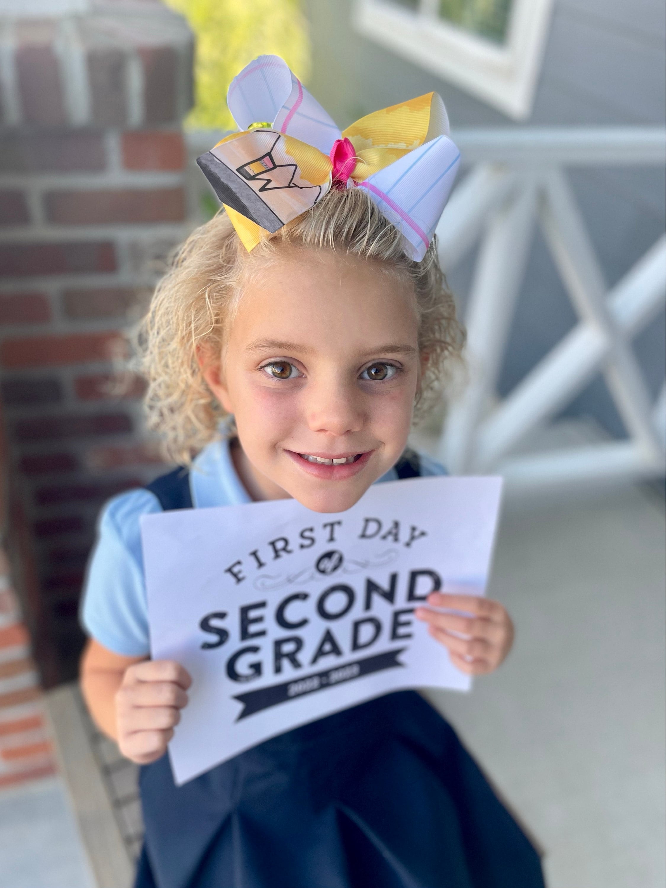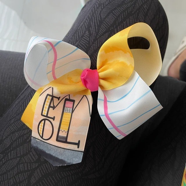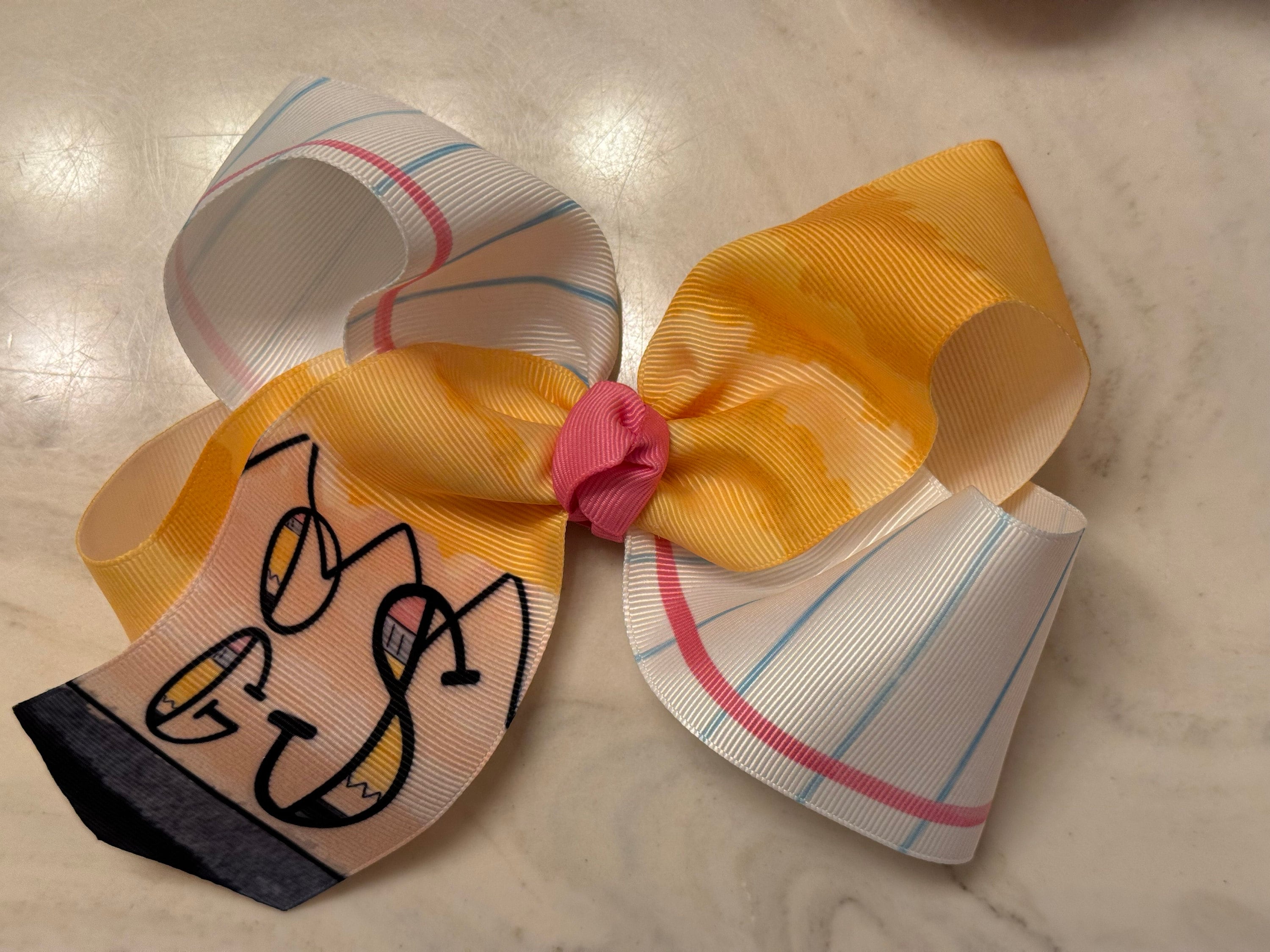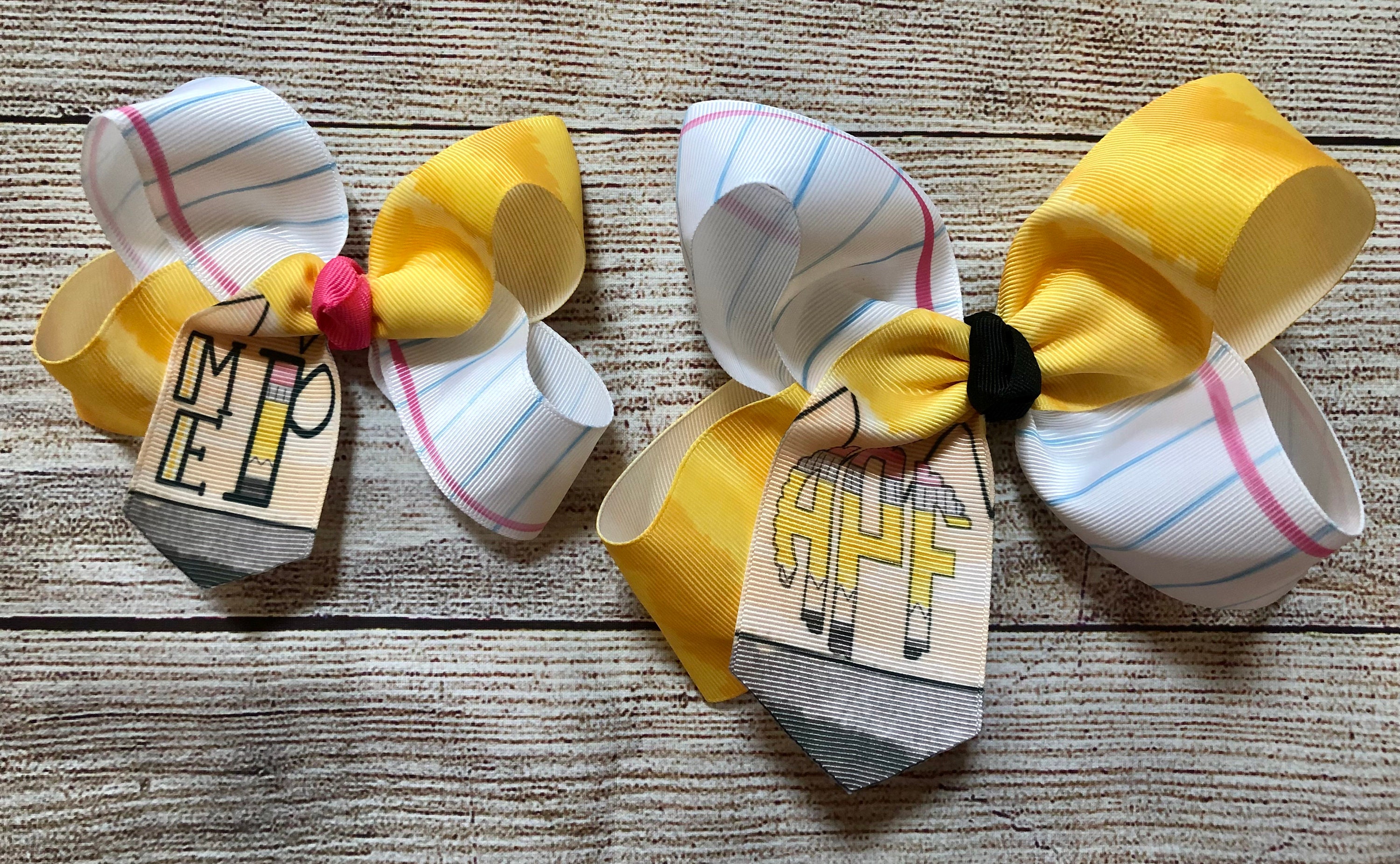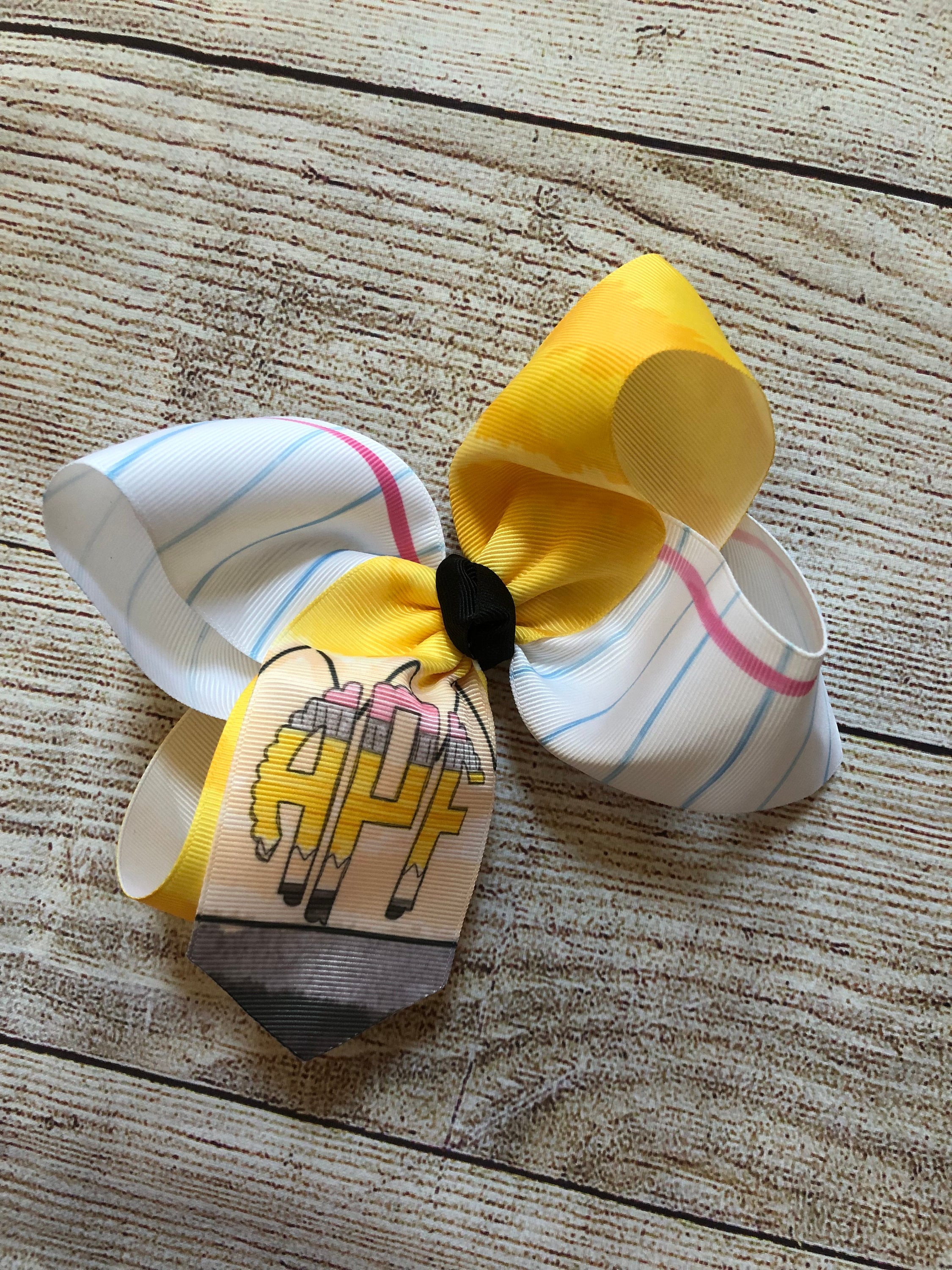 This listing is for 1 medium OR large hair bow, personalized with your child's monogram. The bow is made to resemble pencil and paper and is perfect for your little girl’s back to school outfits and her first day of school!