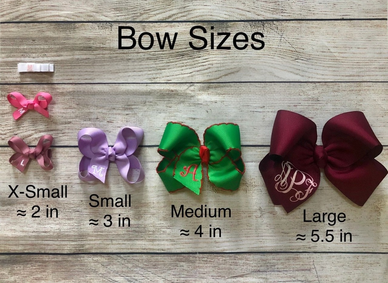 The medium bow measures approximately 4 inches wide (using 1.5" grosgrain ribbon) and the large bow measures approximately 5.5 inches wide (using 2.25 inch grosgrain ribbon). The bow will come with an alligator clip attached to the back.