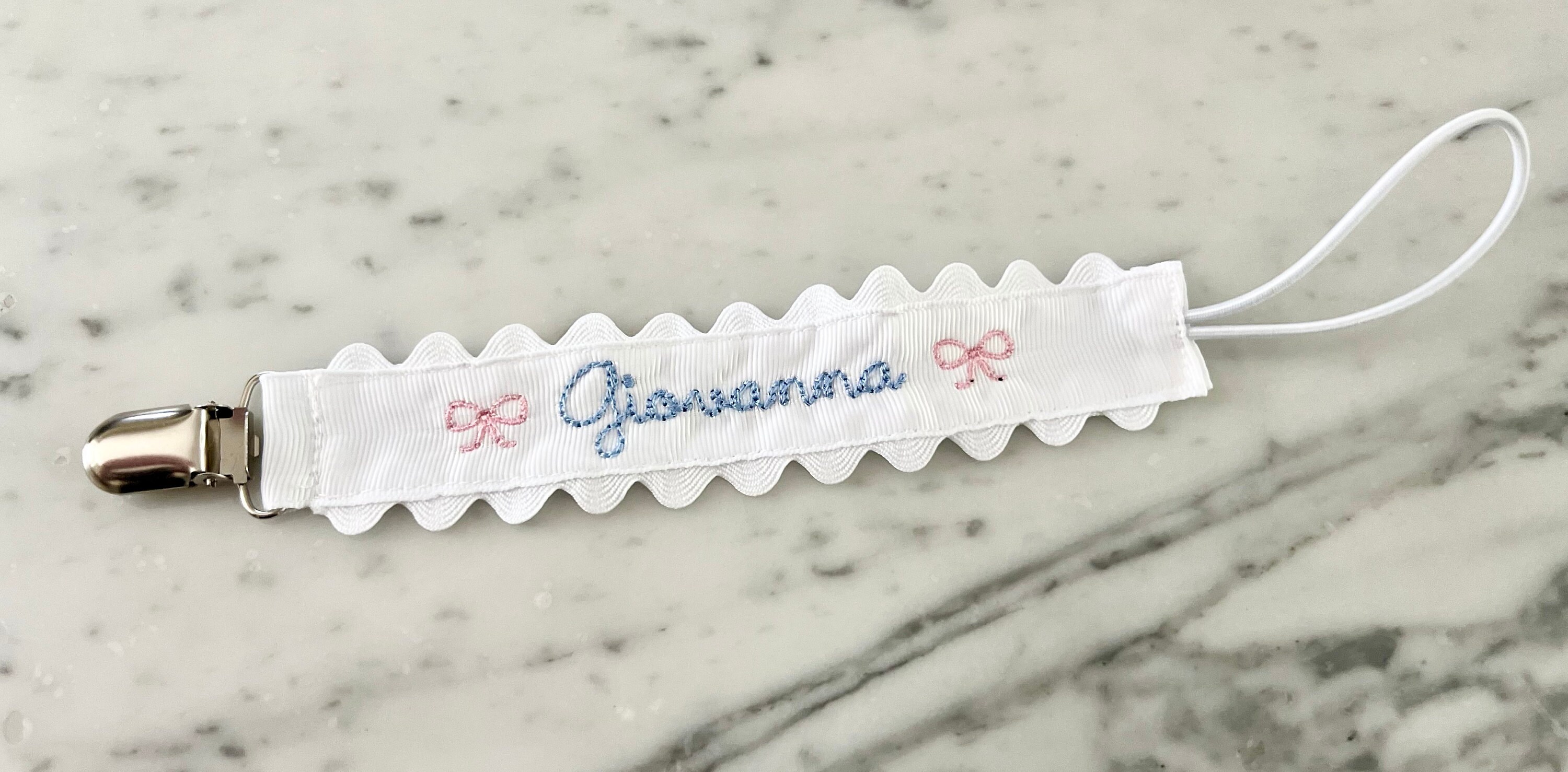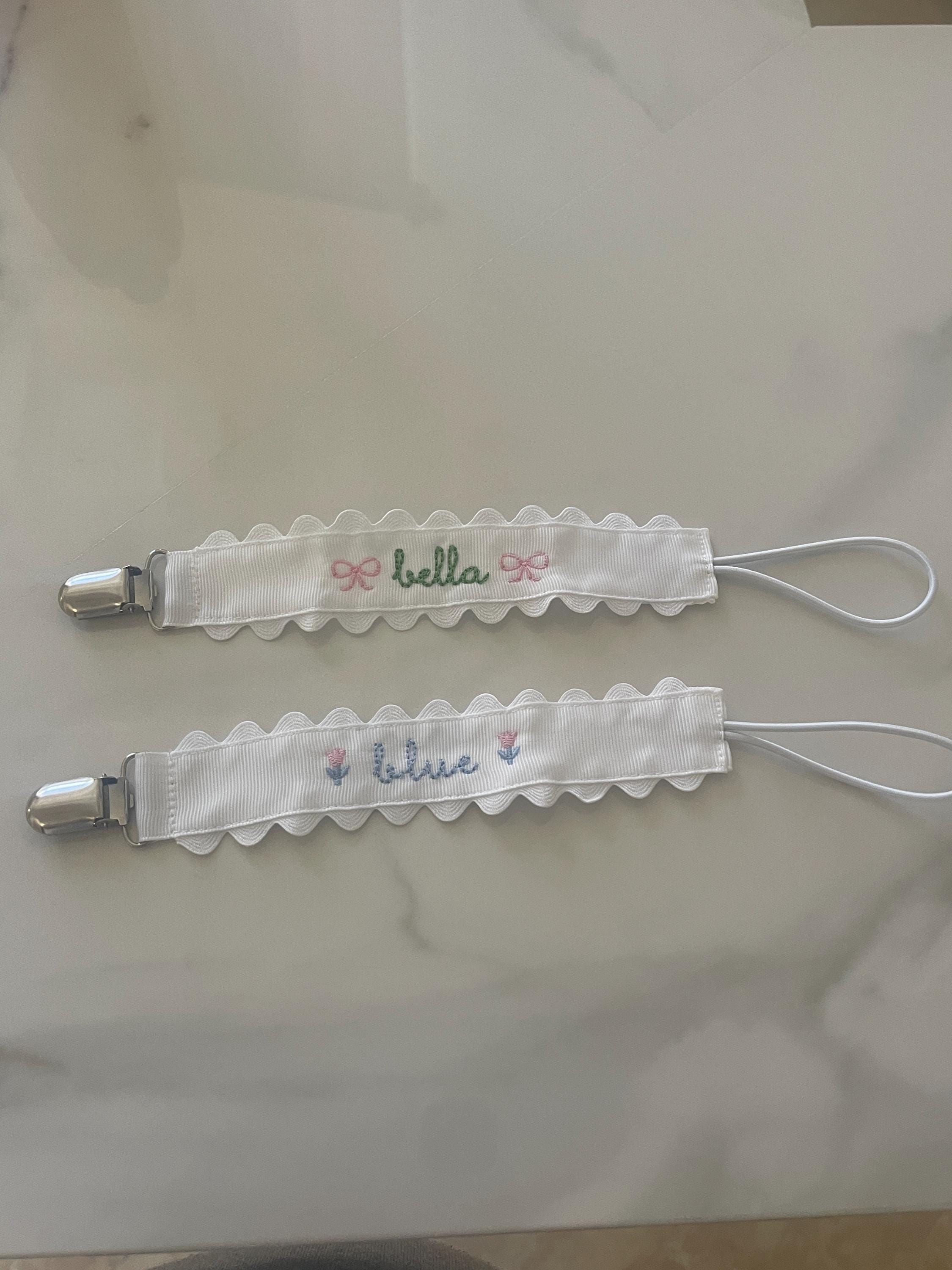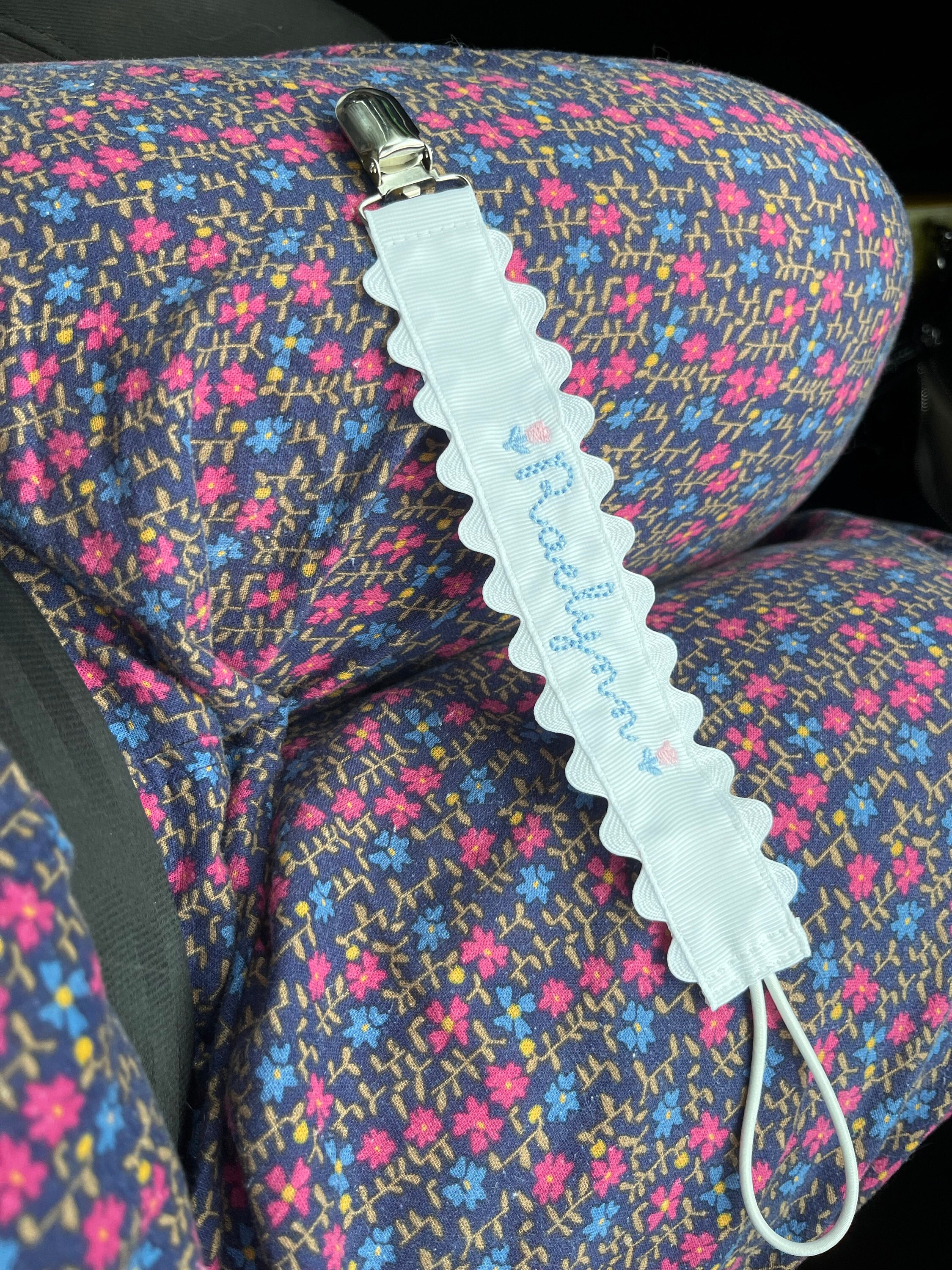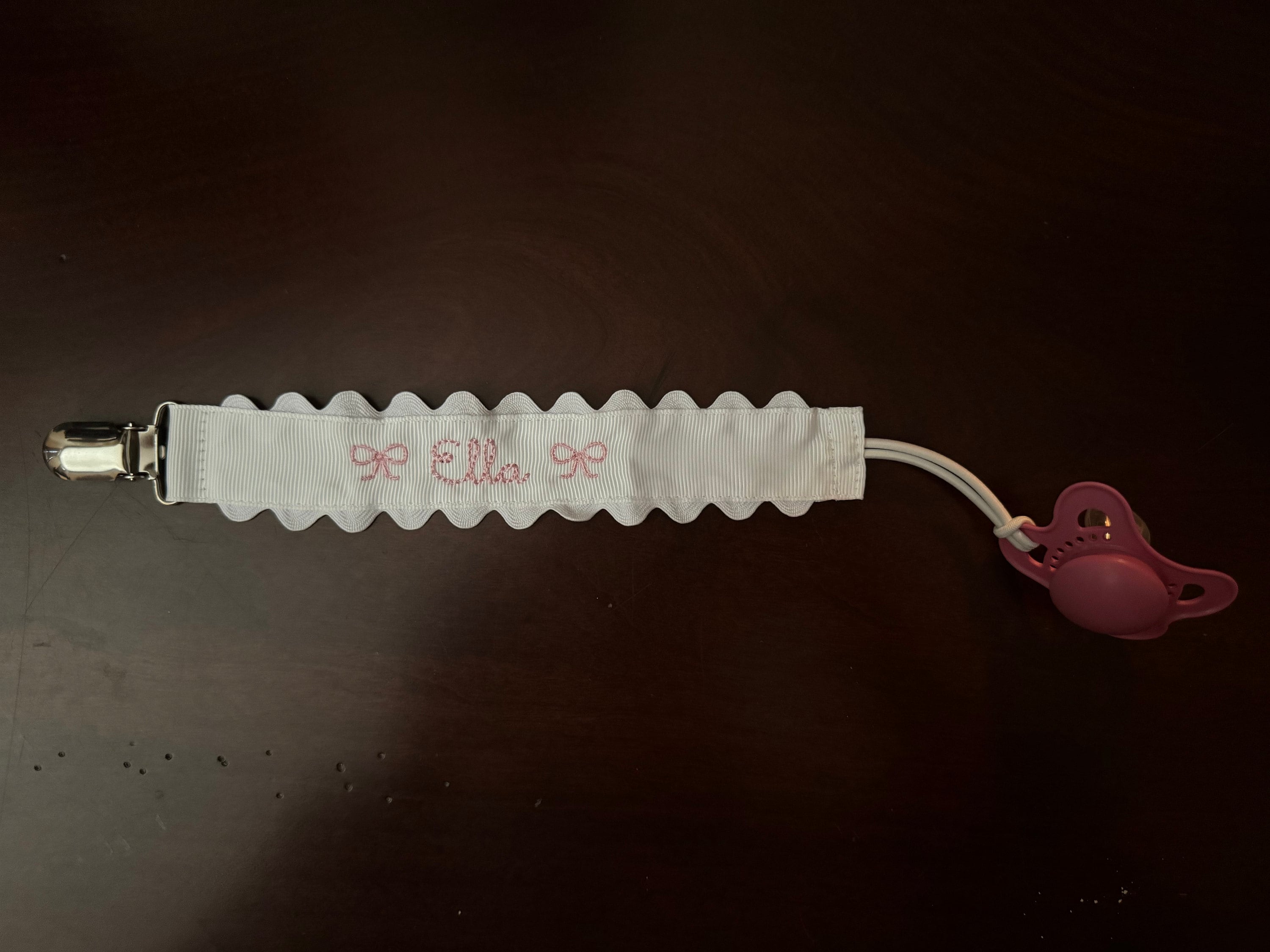 Sweet little classic pacifier clip made with grosgrain ribbon, white ric rac and an elastic loop. Personalize it with your little one's name embroidered in a precious font with thread color of your choice. Makes the perfect gift coupled with a personalized bib and burp cloth.