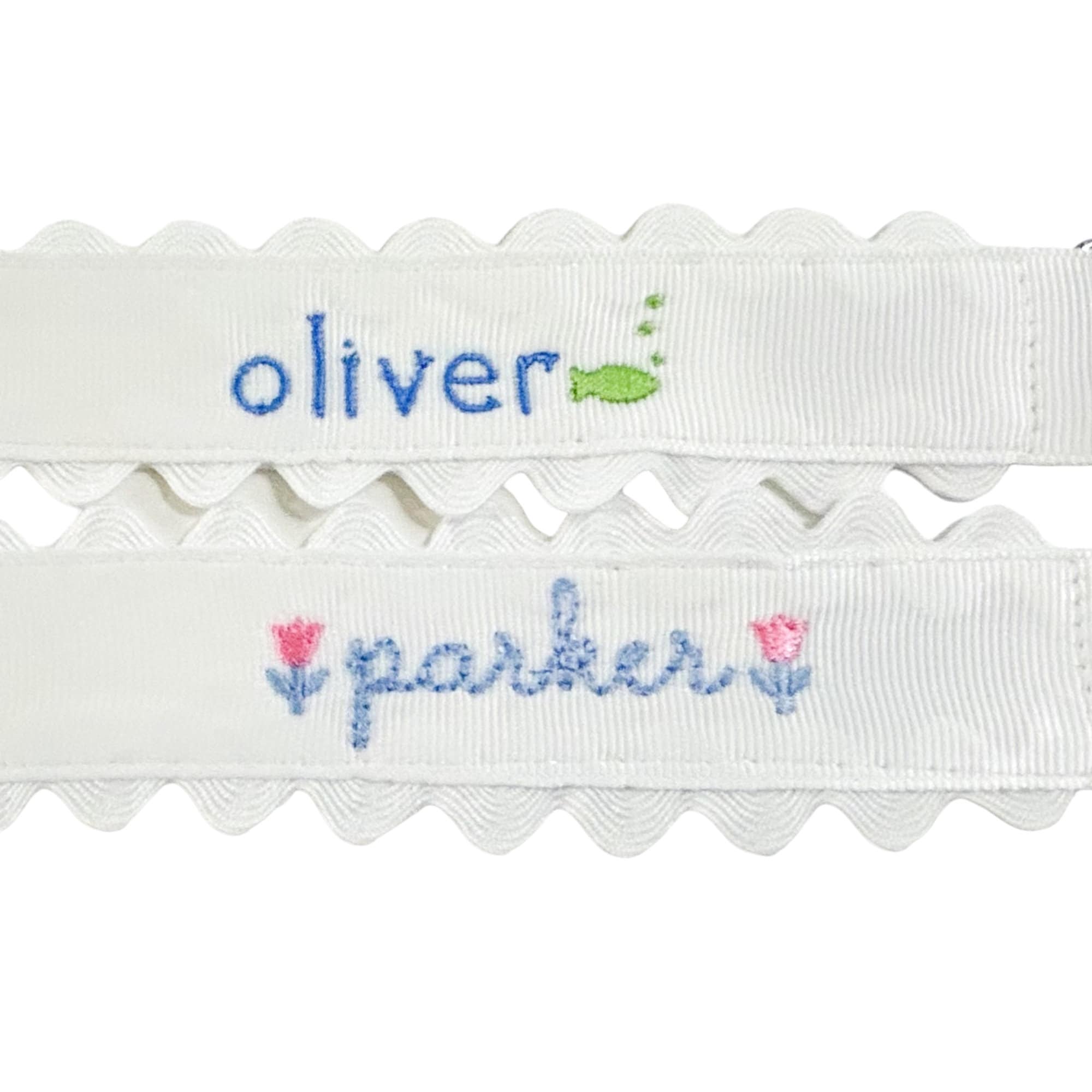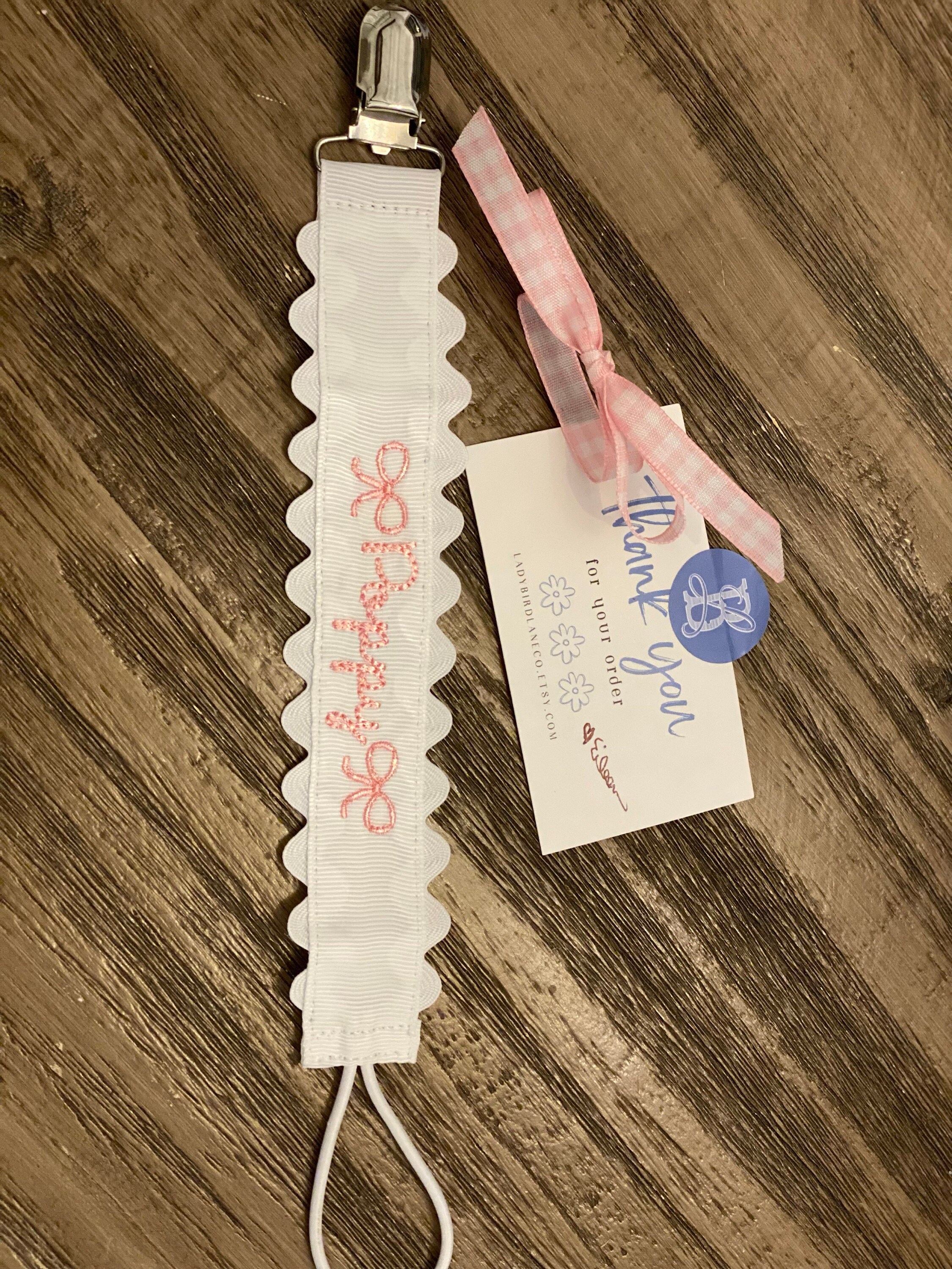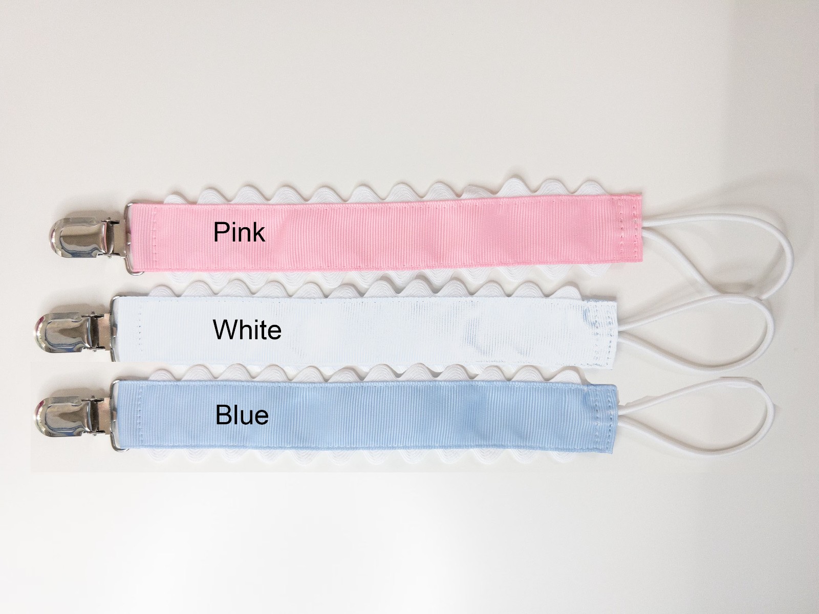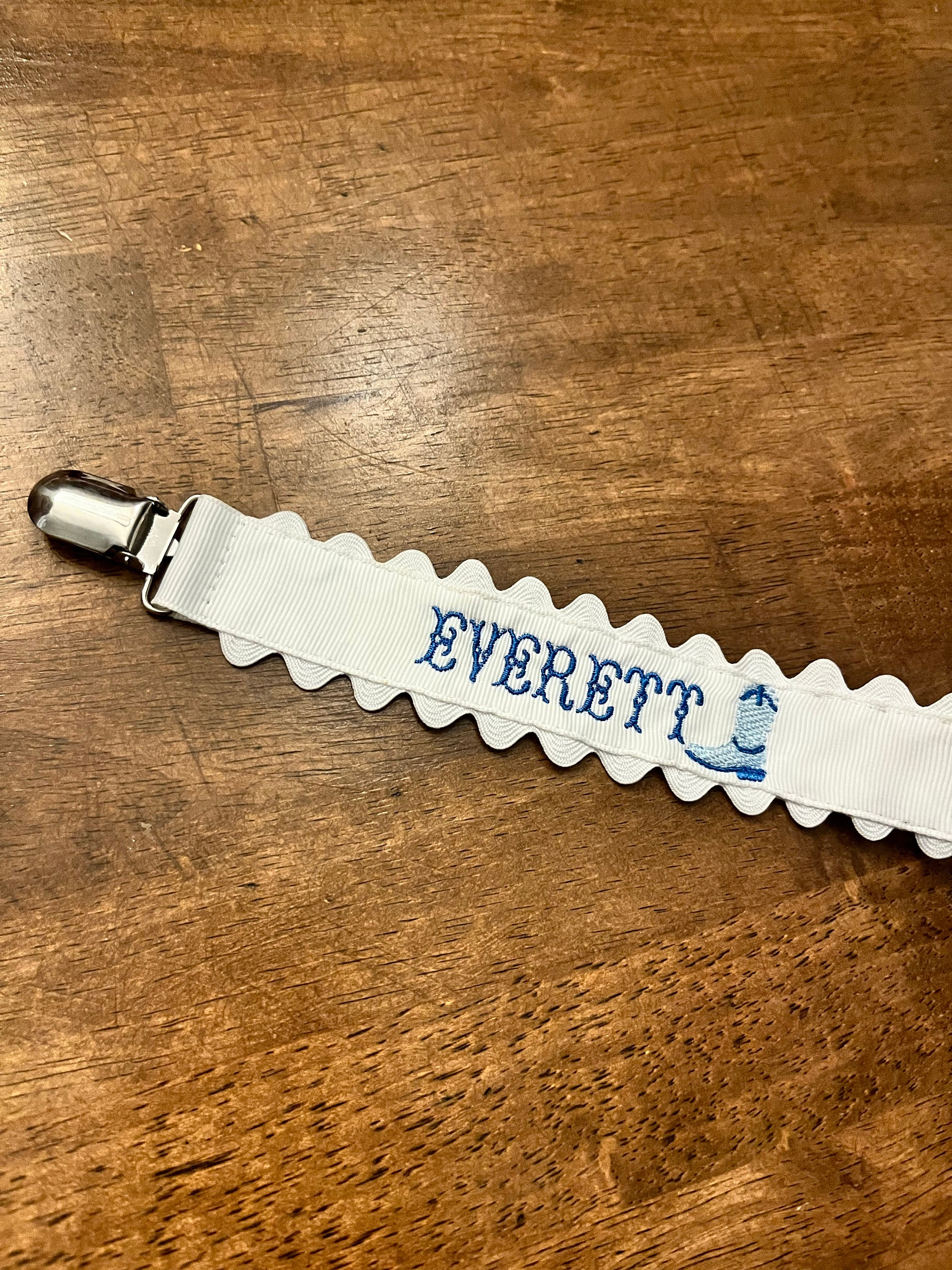 Sweet little classic pacifier clip made with grosgrain ribbon, white ric rac and an elastic loop. Personalize it with your little one's name embroidered in a precious font with thread color of your choice. Makes the perfect gift coupled with a personalized bib and burp cloth.