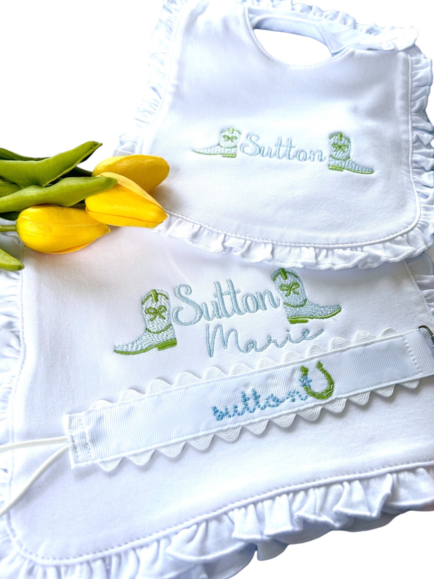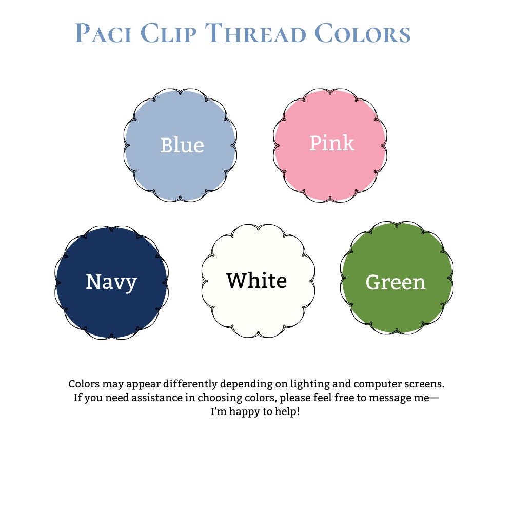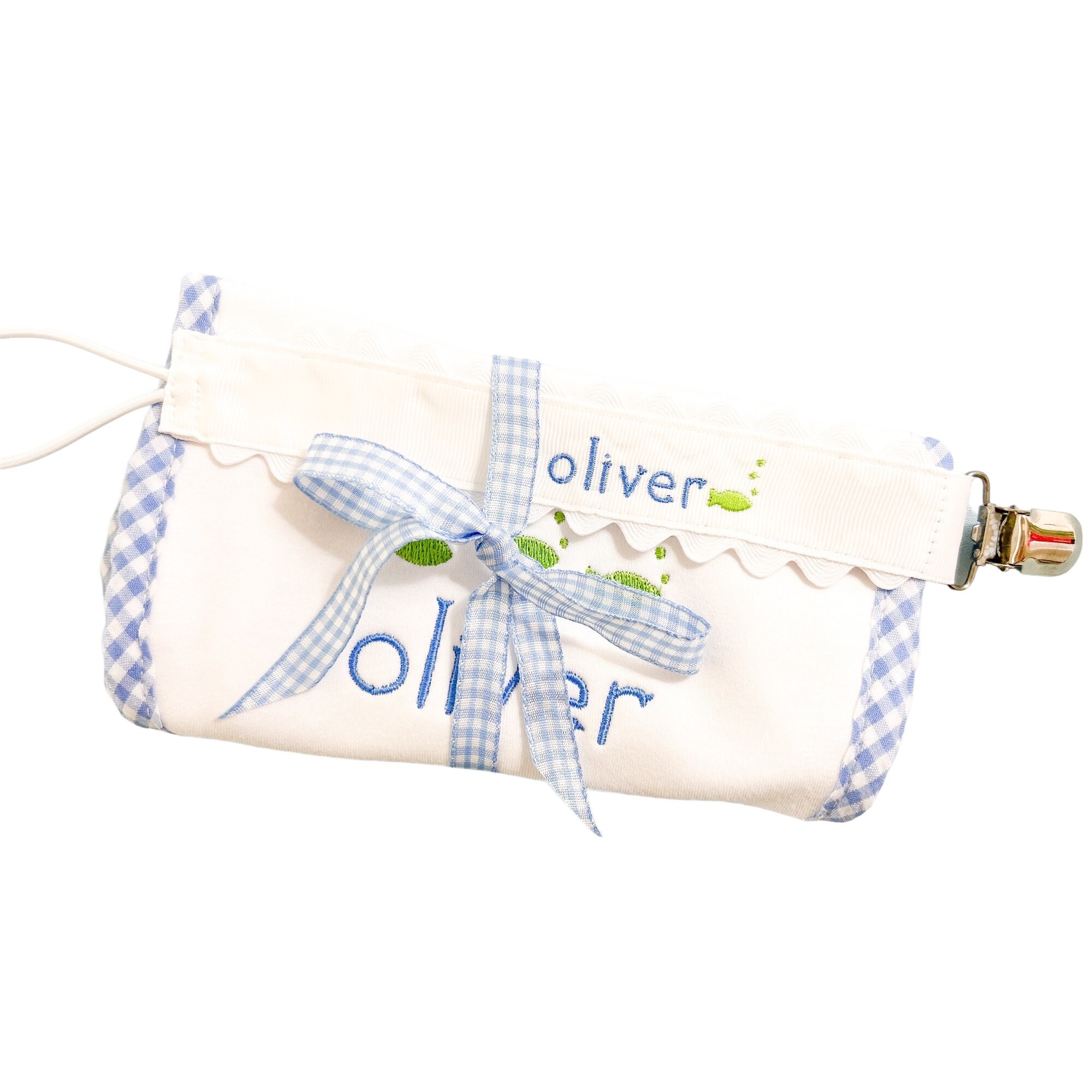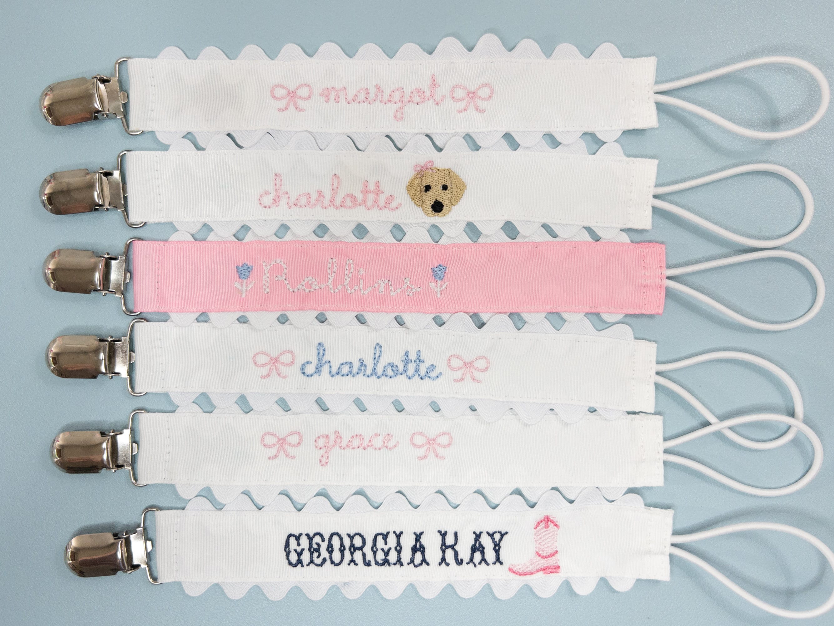 Sweet little classic pacifier clip made with grosgrain ribbon, white ric rac and an elastic loop. Personalize it with your little one's name embroidered in a precious font with thread color of your choice. Makes the perfect gift coupled with a personalized bib and burp cloth.