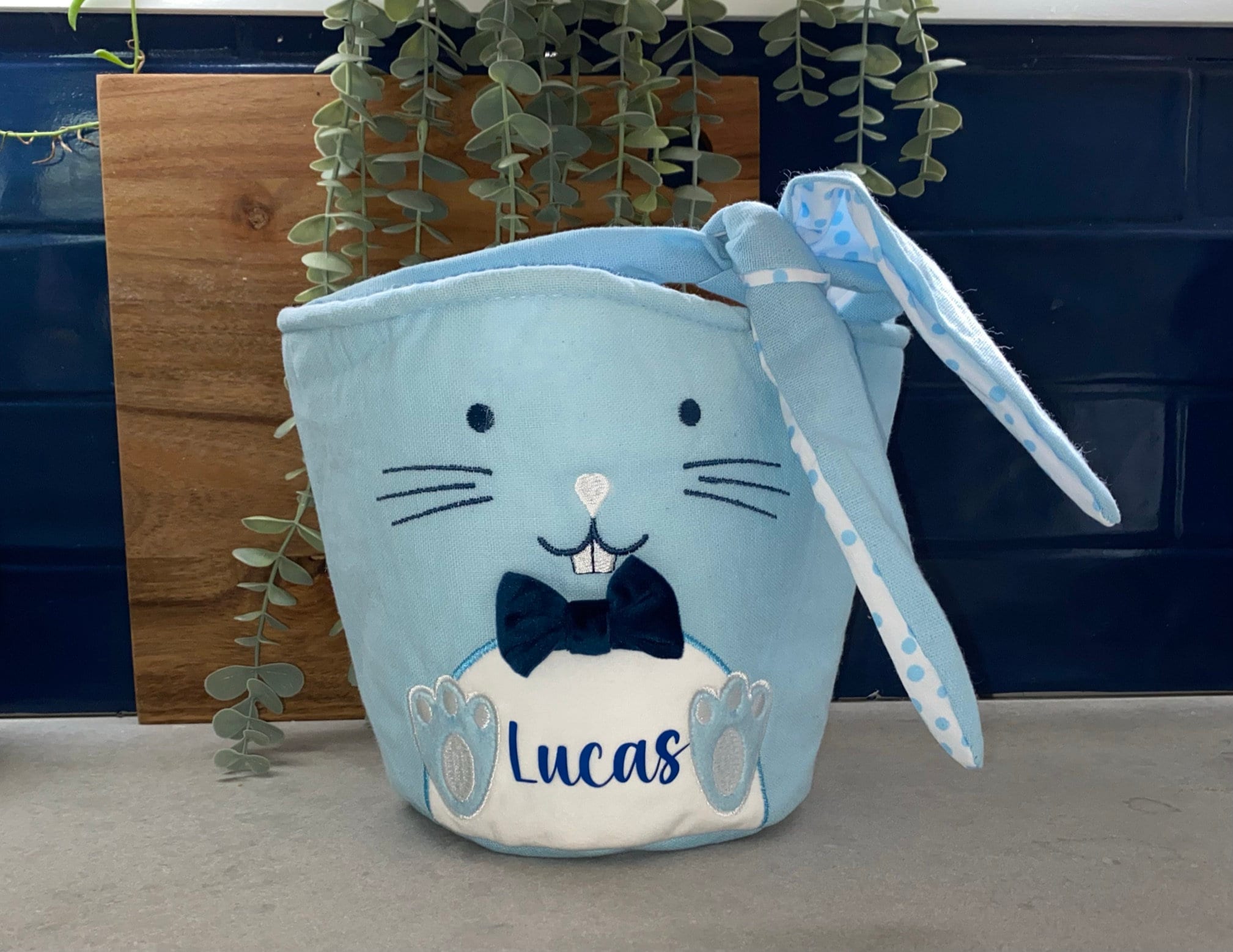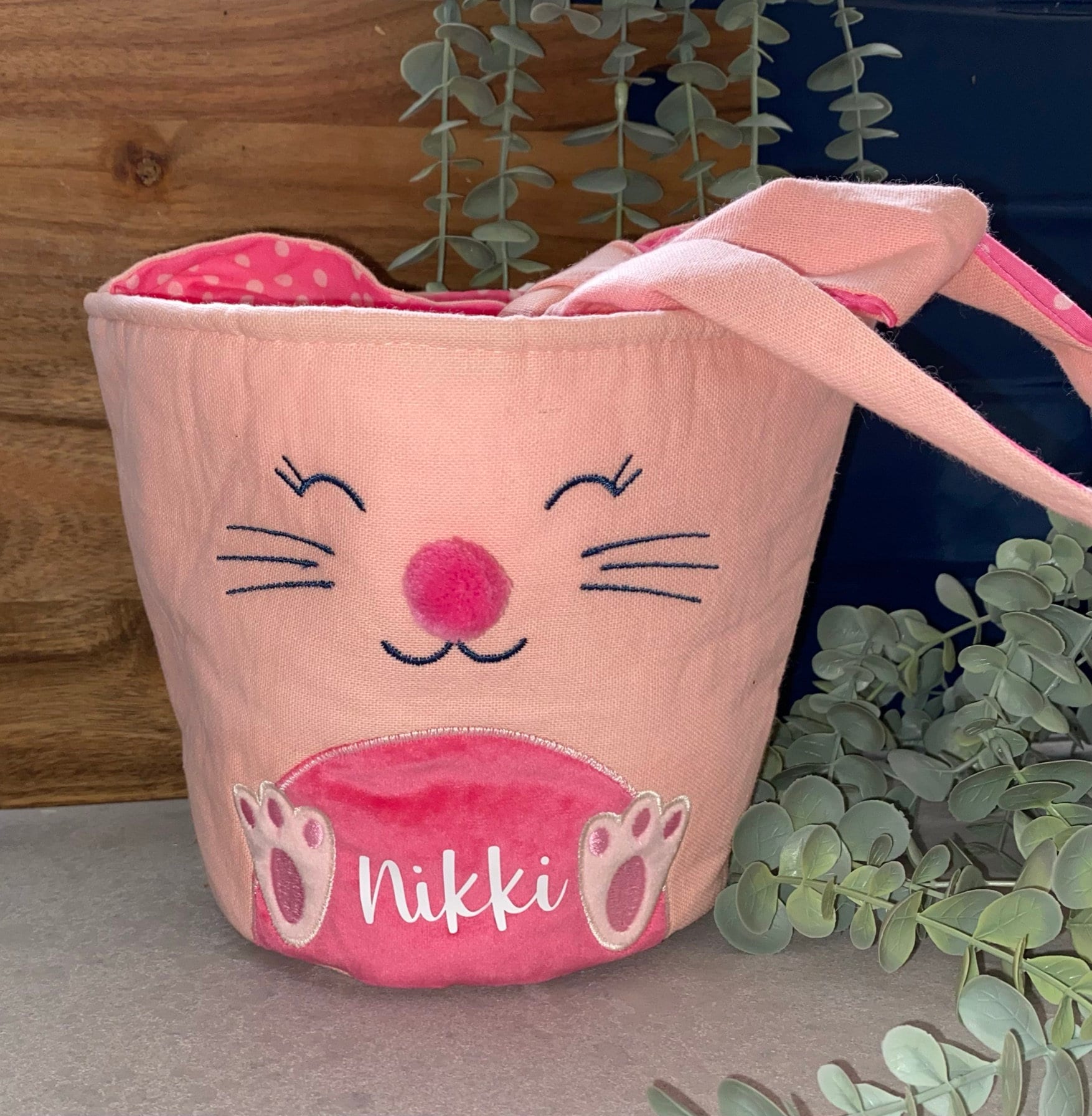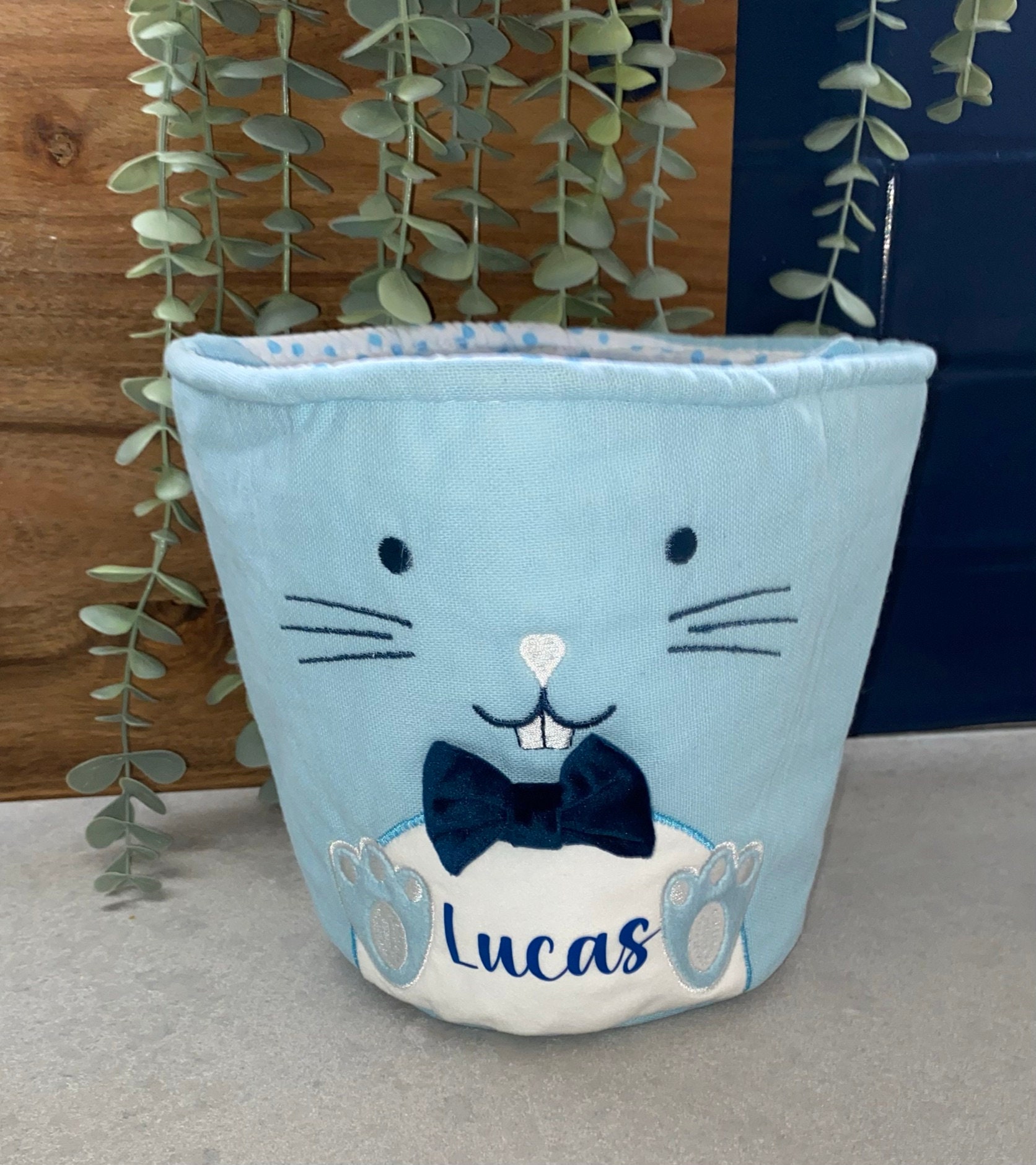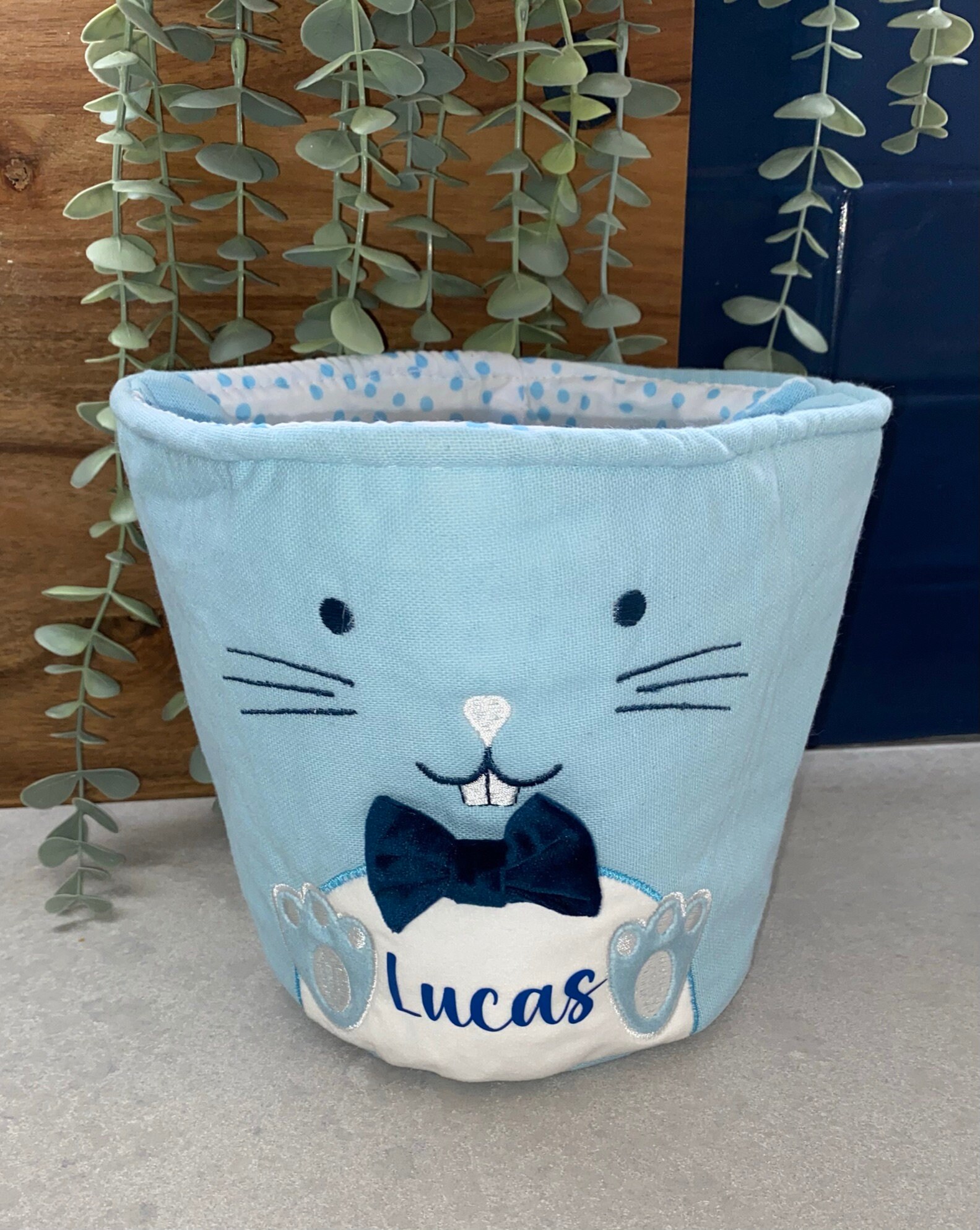 Each basket feature a cute bunny face on the front, a pompom tail on the back and floppy ears as the carry handles. Each basket is lined with a matching polka dot fabric.The basket measures - 19cm high, 20cm across the top and 14cm across the base.