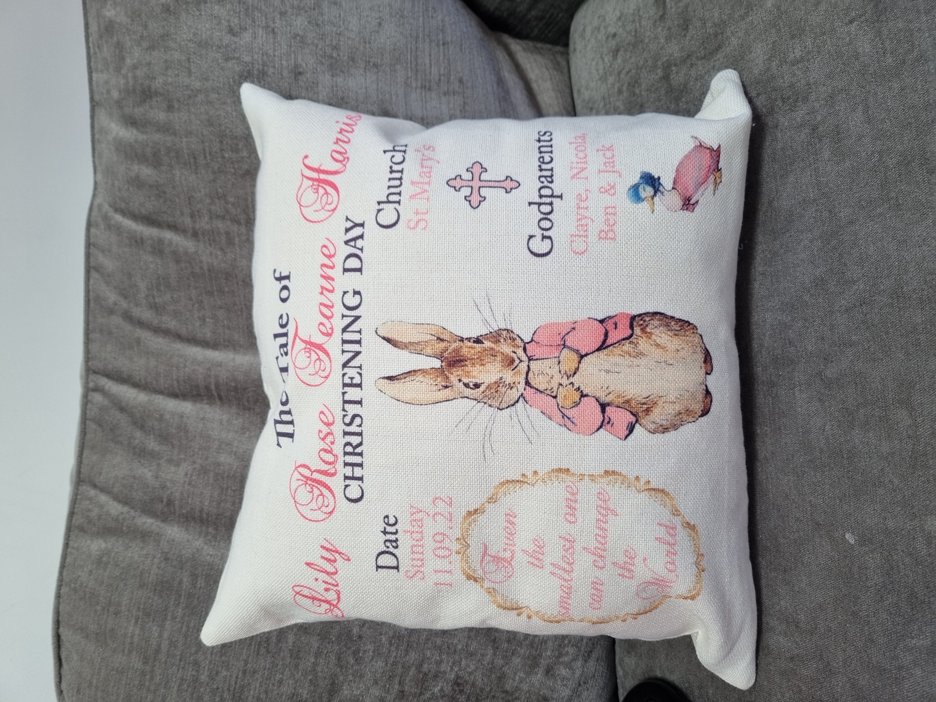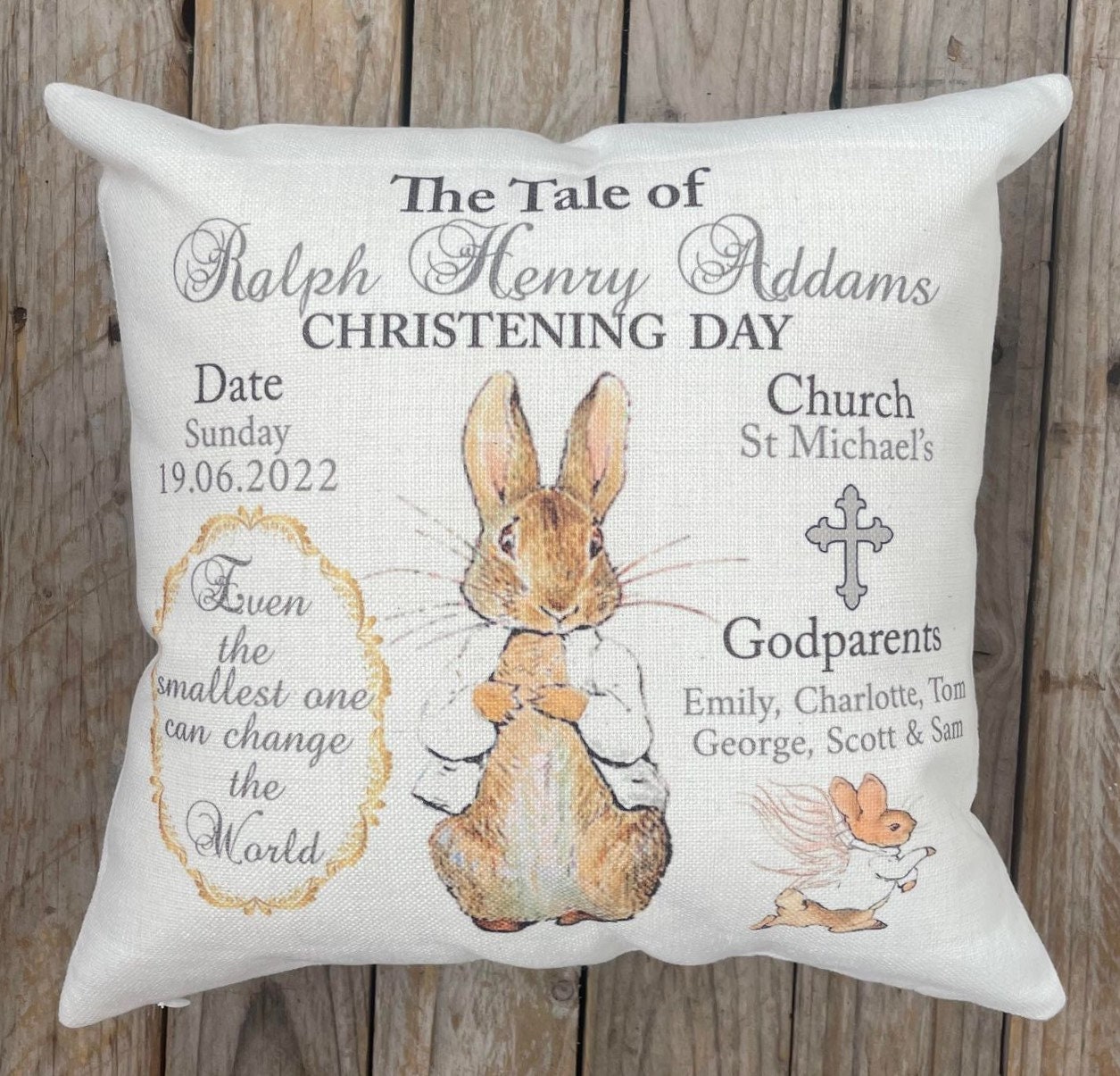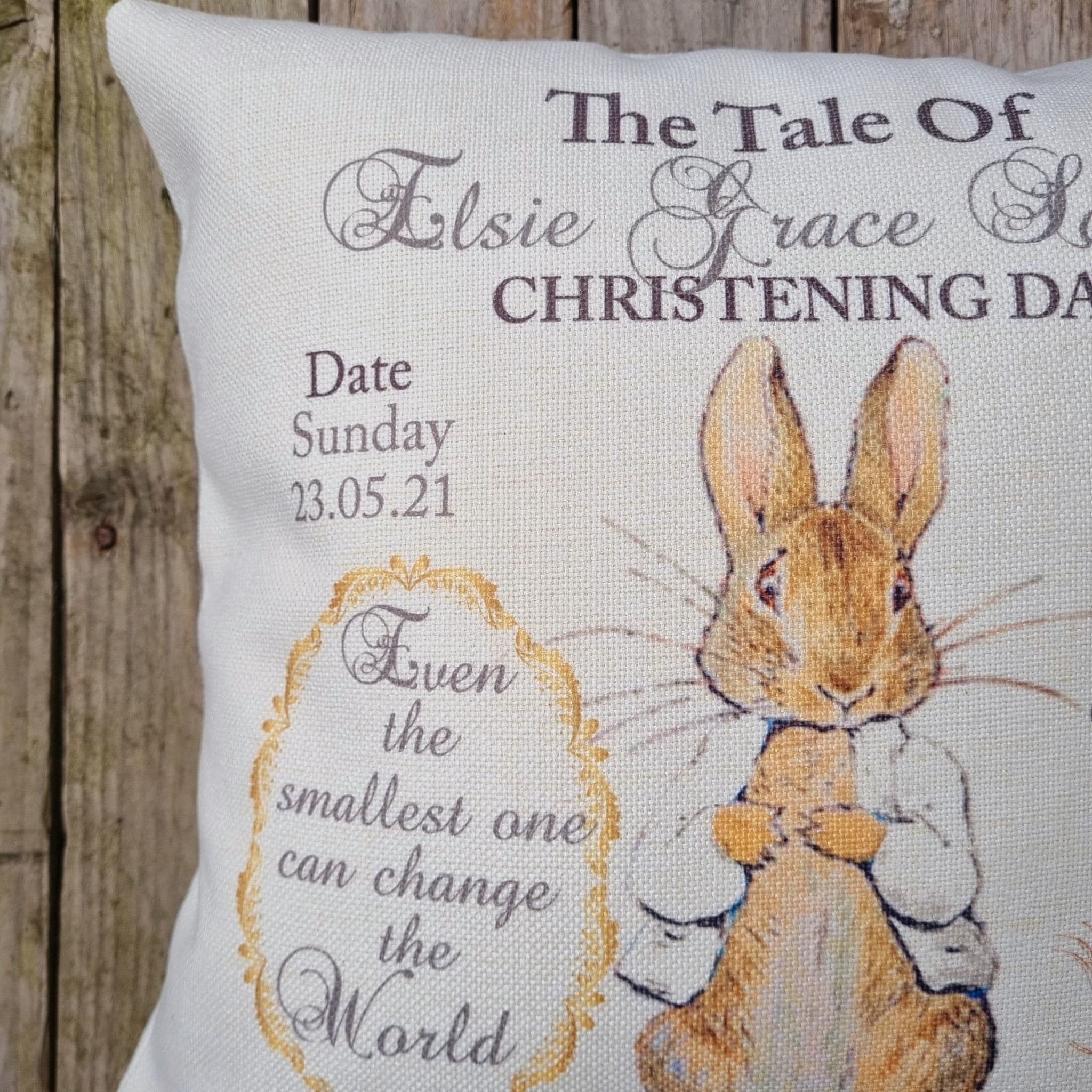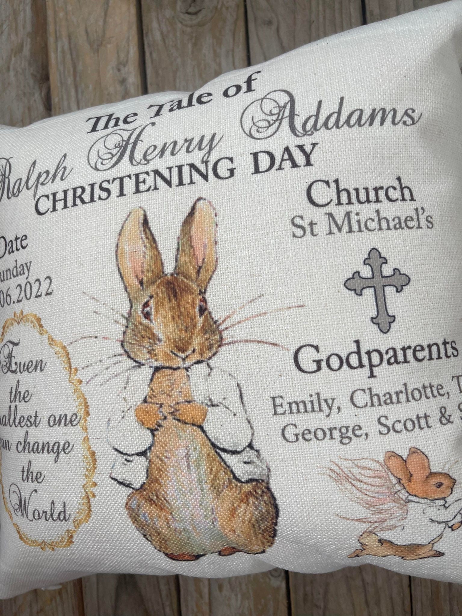 Beautiful bespoke customisable designed Personalised Peter Rabbit Cushion. Perfect gift & keepsake of the Christening Day.