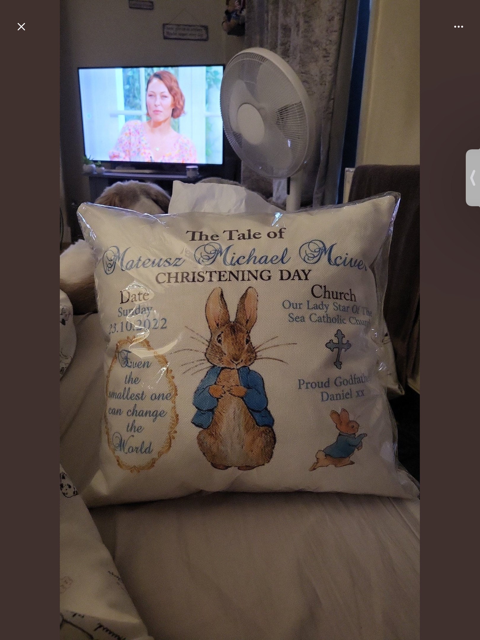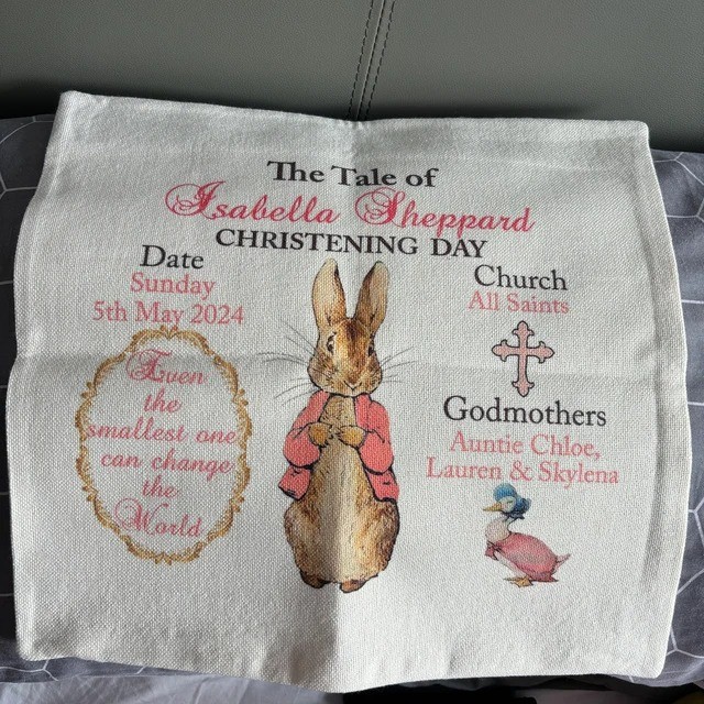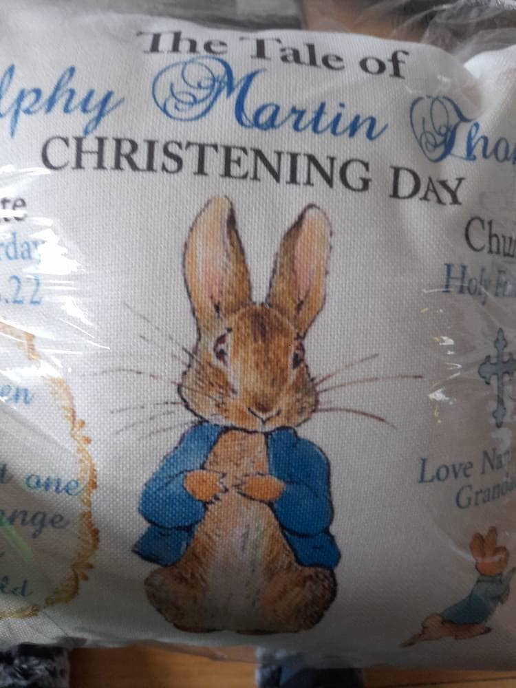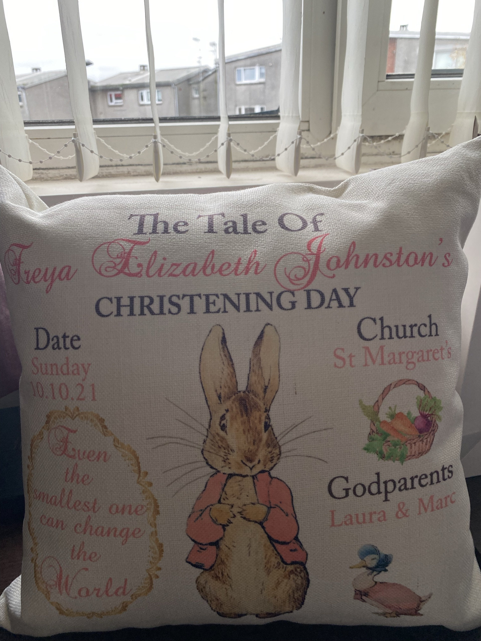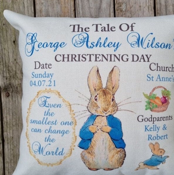 Beautiful bespoke customisable designed Personalised Peter Rabbit Cushion. Perfect gift & keepsake of the Christening Day.
