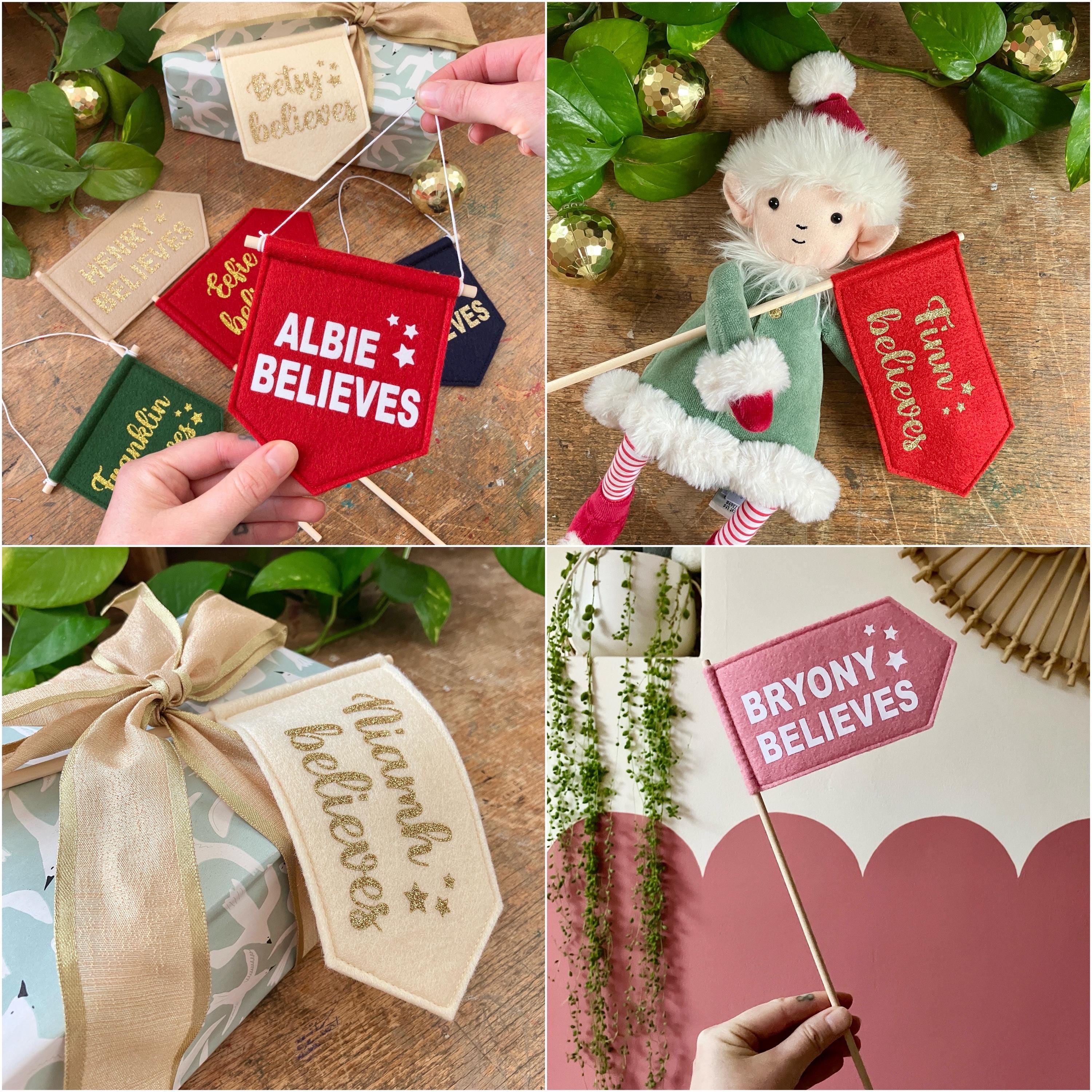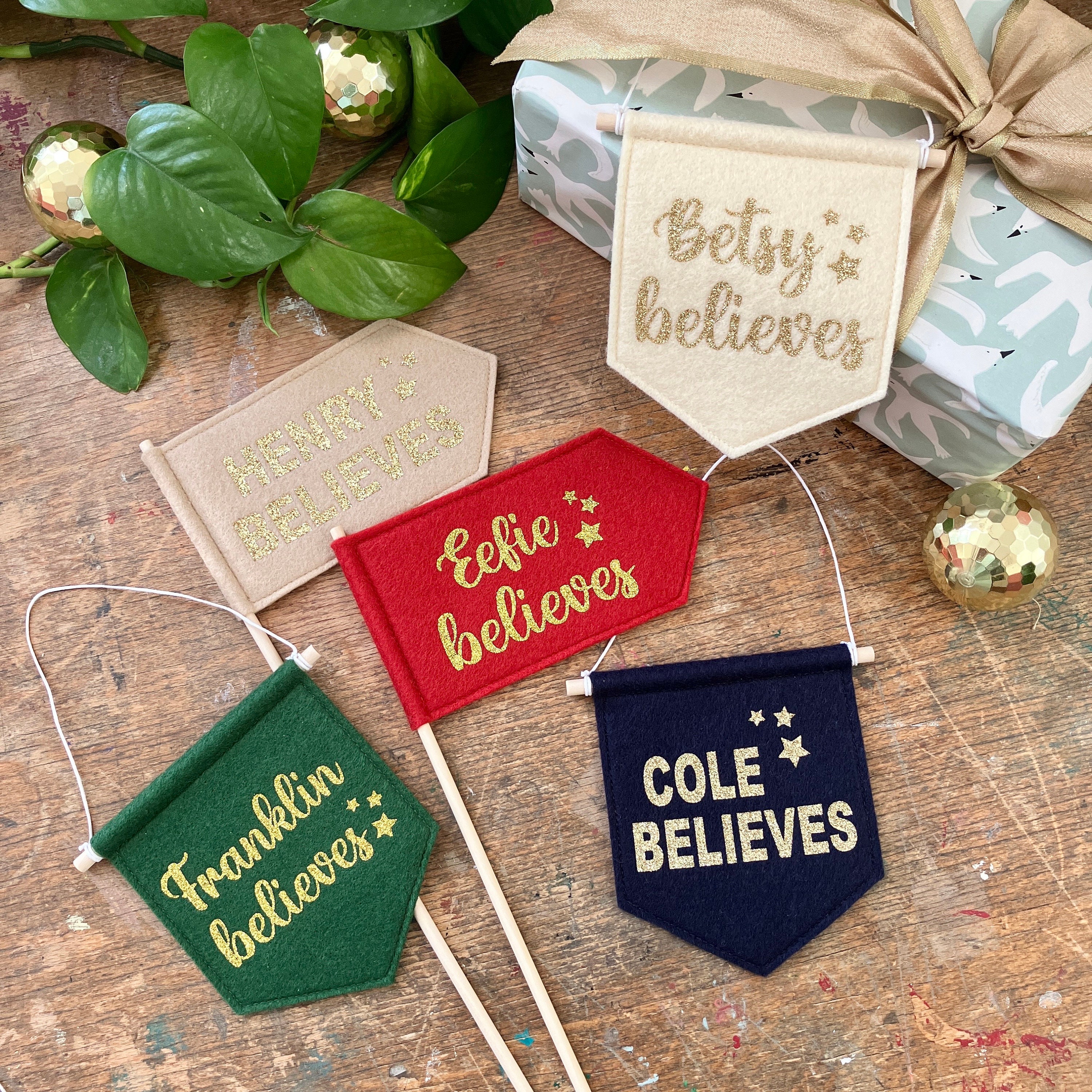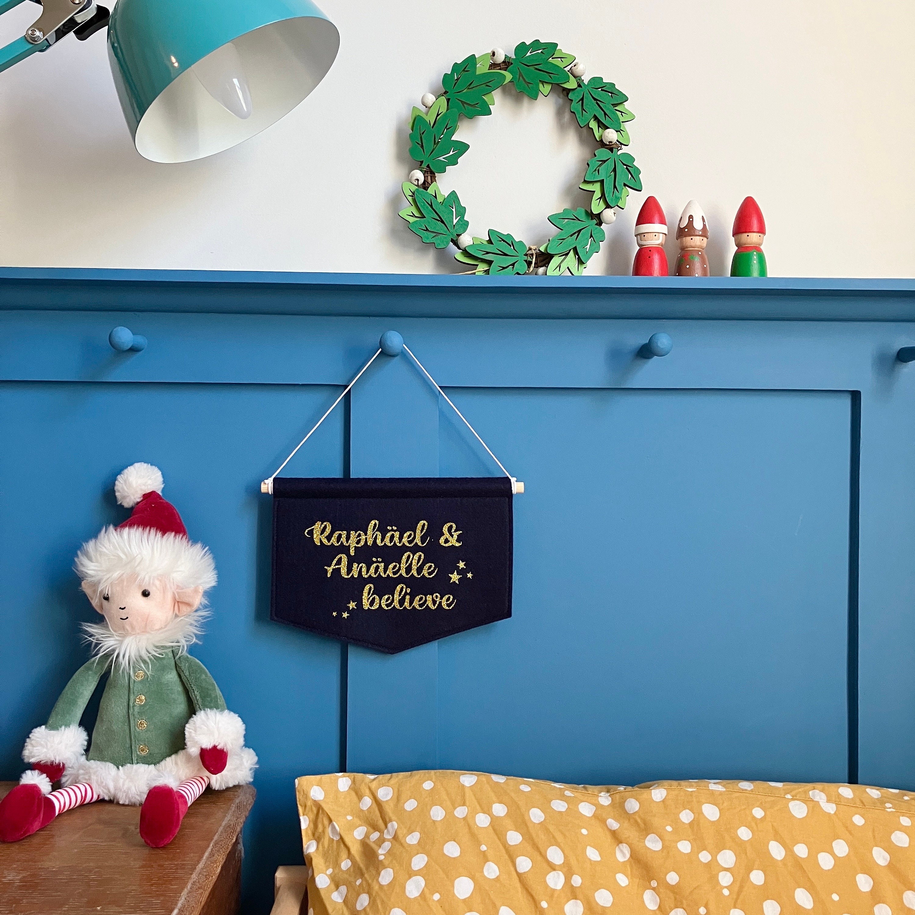 Magical Christmas decor for children, a banner perfect for little True Believers. This small banner is perfect for individual names with the wider banner ideal for a statement piece or for siblings. The glitter lettering sparkles beautifully in the sunlight or with the reflection of flashing Christmas lights, set against a soft vegan friendly felt background.