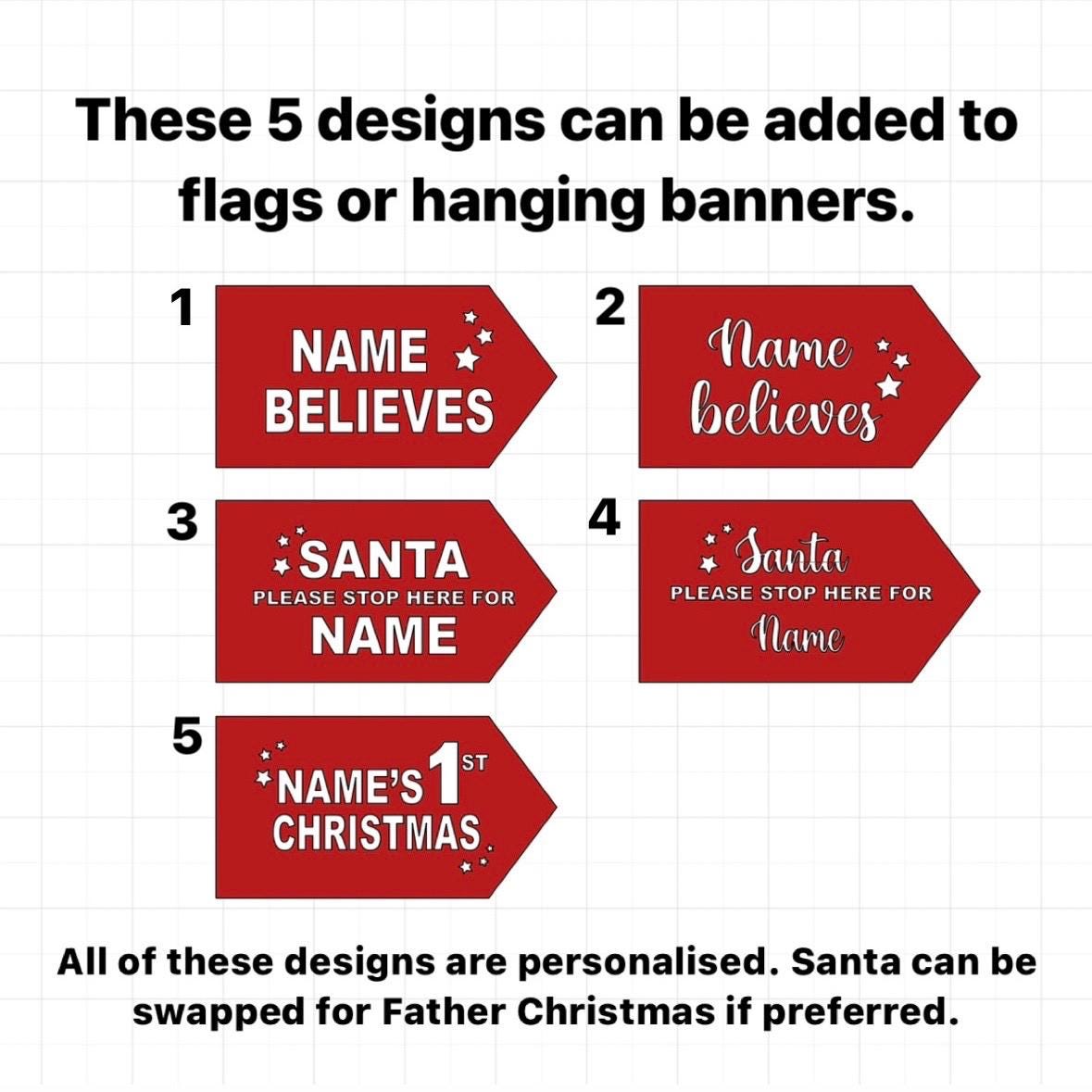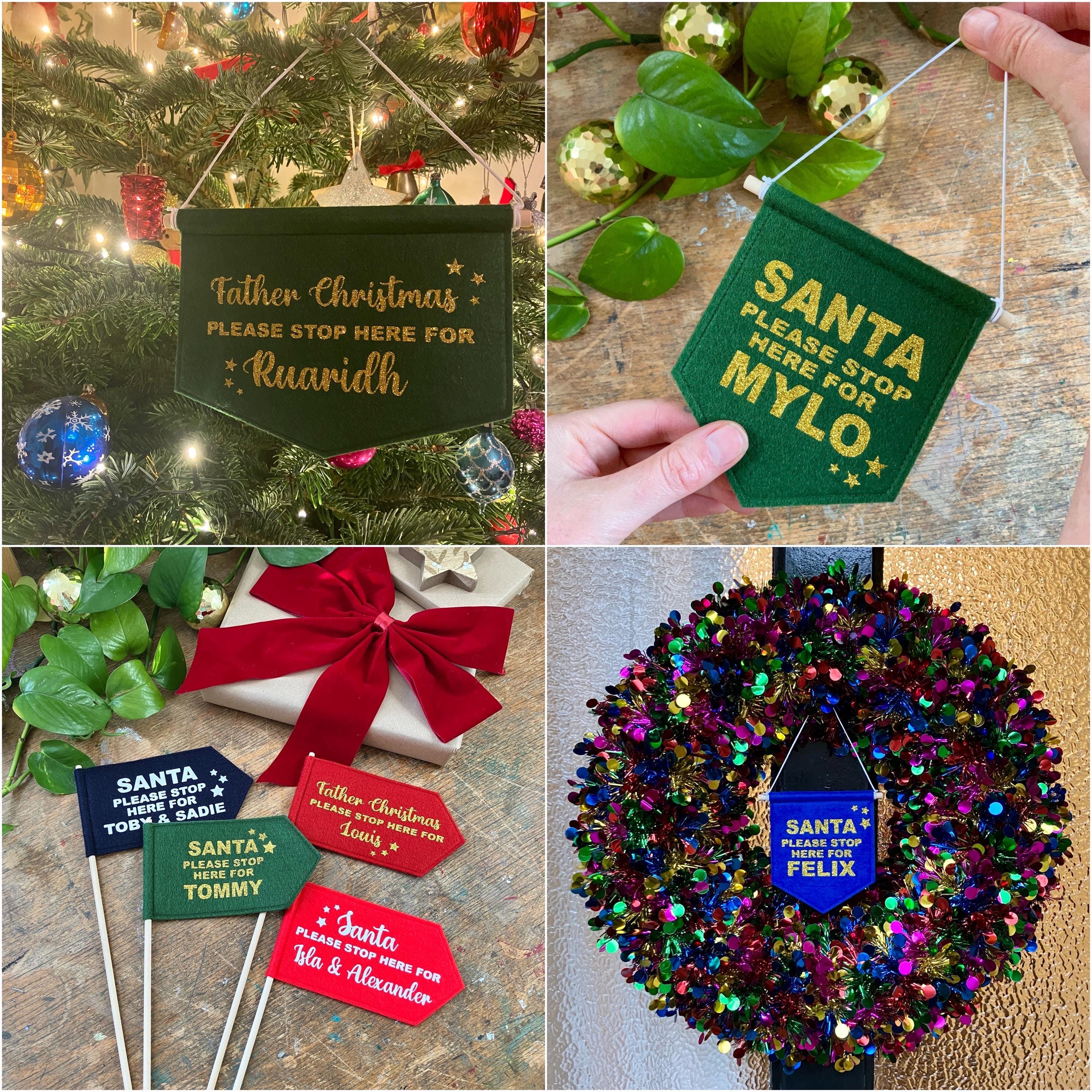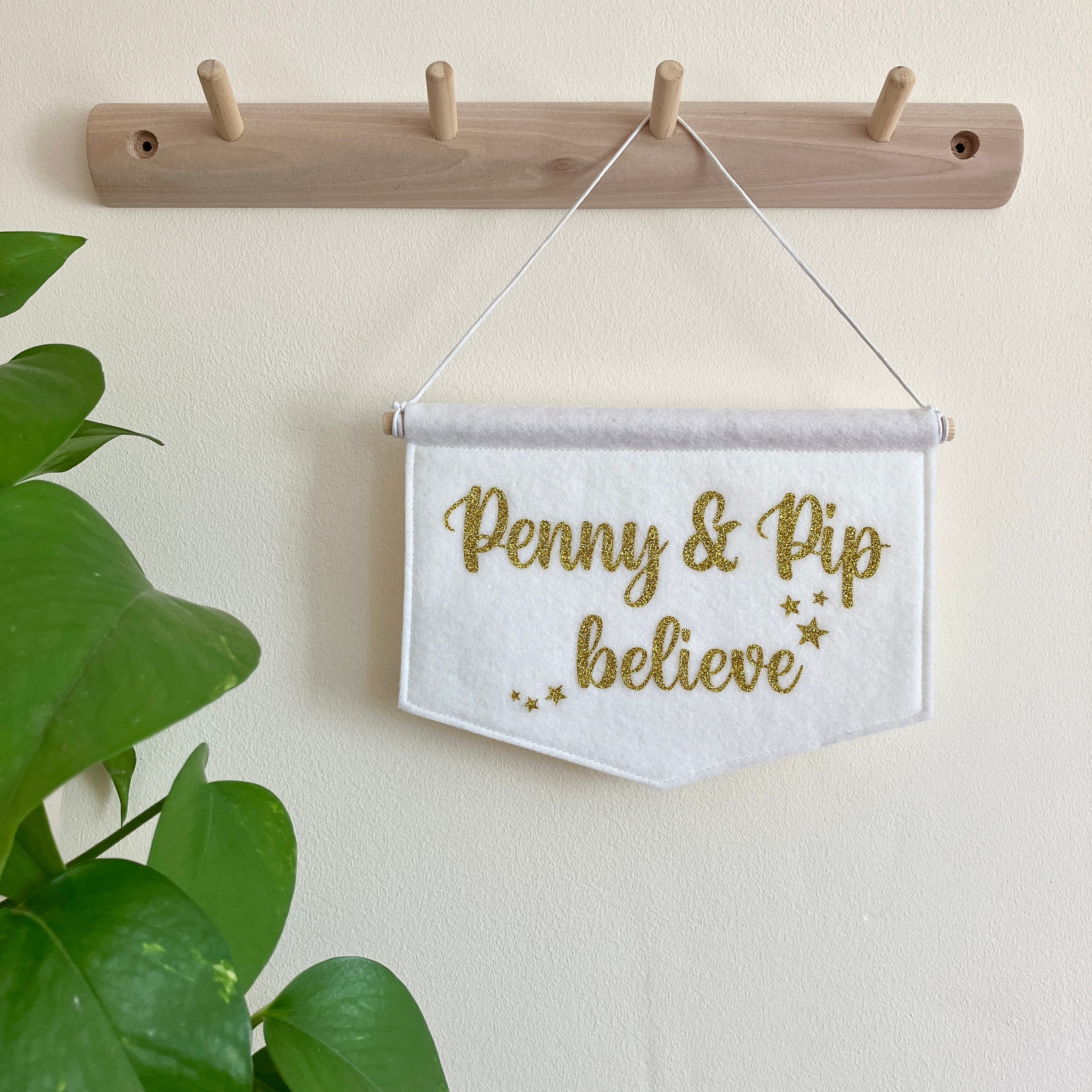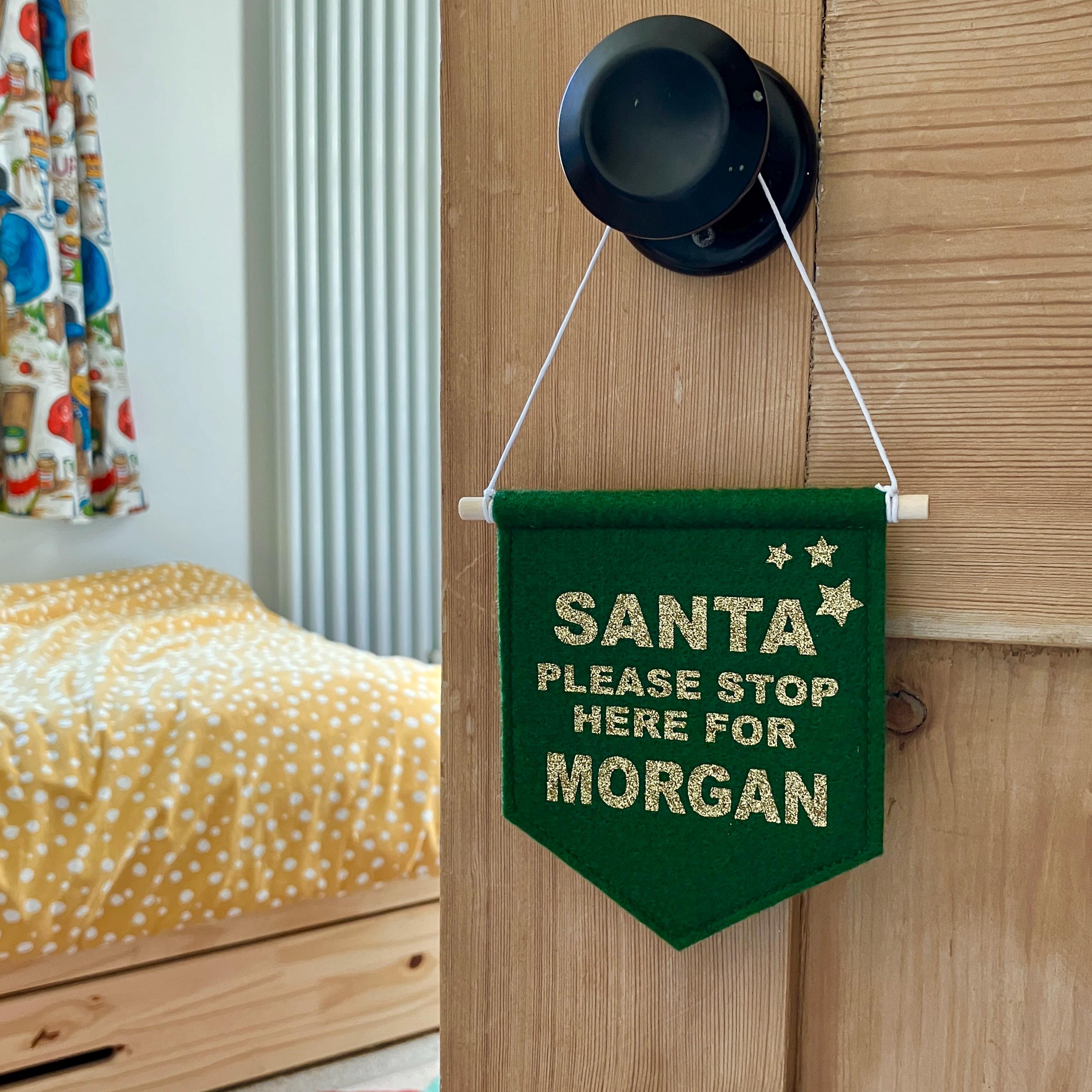 Magical Christmas decor for children, a banner perfect for little True Believers. This small banner is perfect for individual names with the wider banner ideal for a statement piece or for siblings. The glitter lettering sparkles beautifully in the sunlight or with the reflection of flashing Christmas lights, set against a soft vegan friendly felt background.