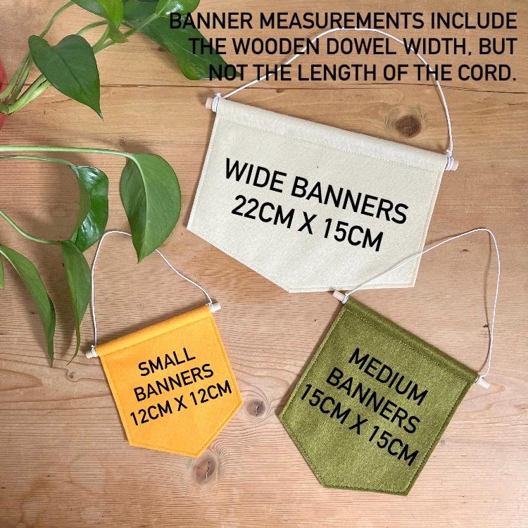Wide hanging banner 22cm wide (at dowel) x 15cm tall (not inc. cord length).