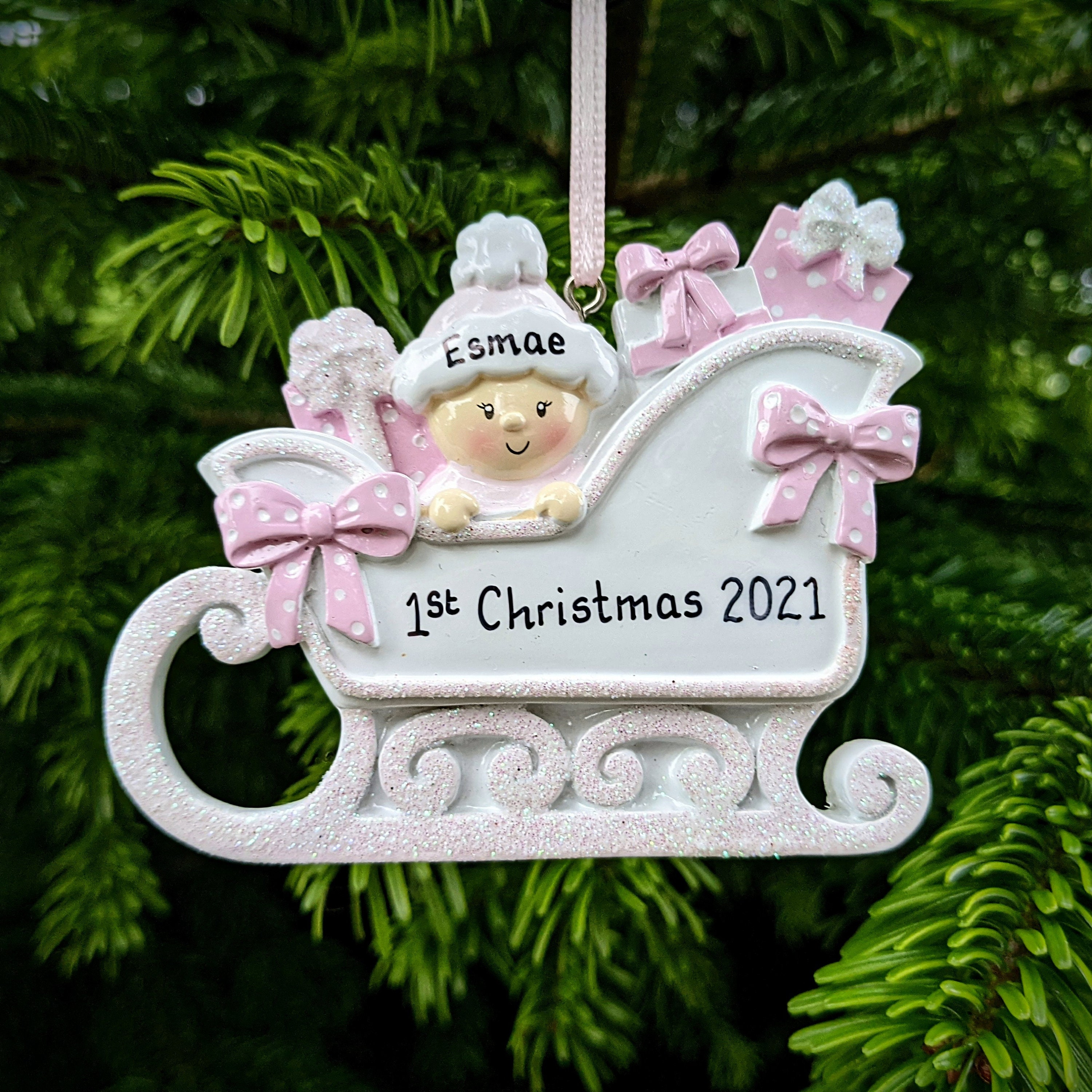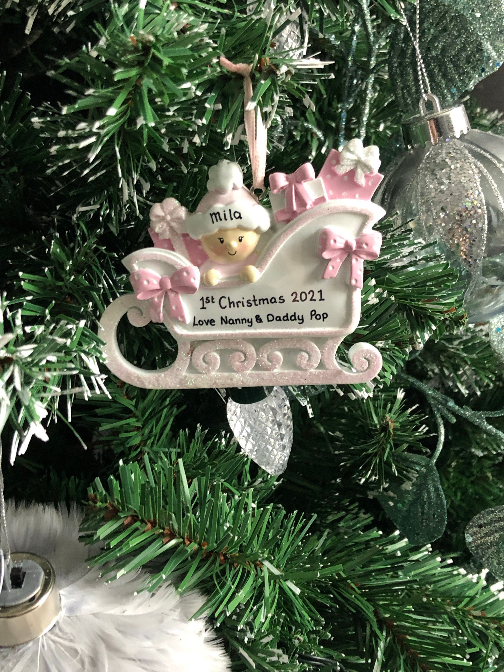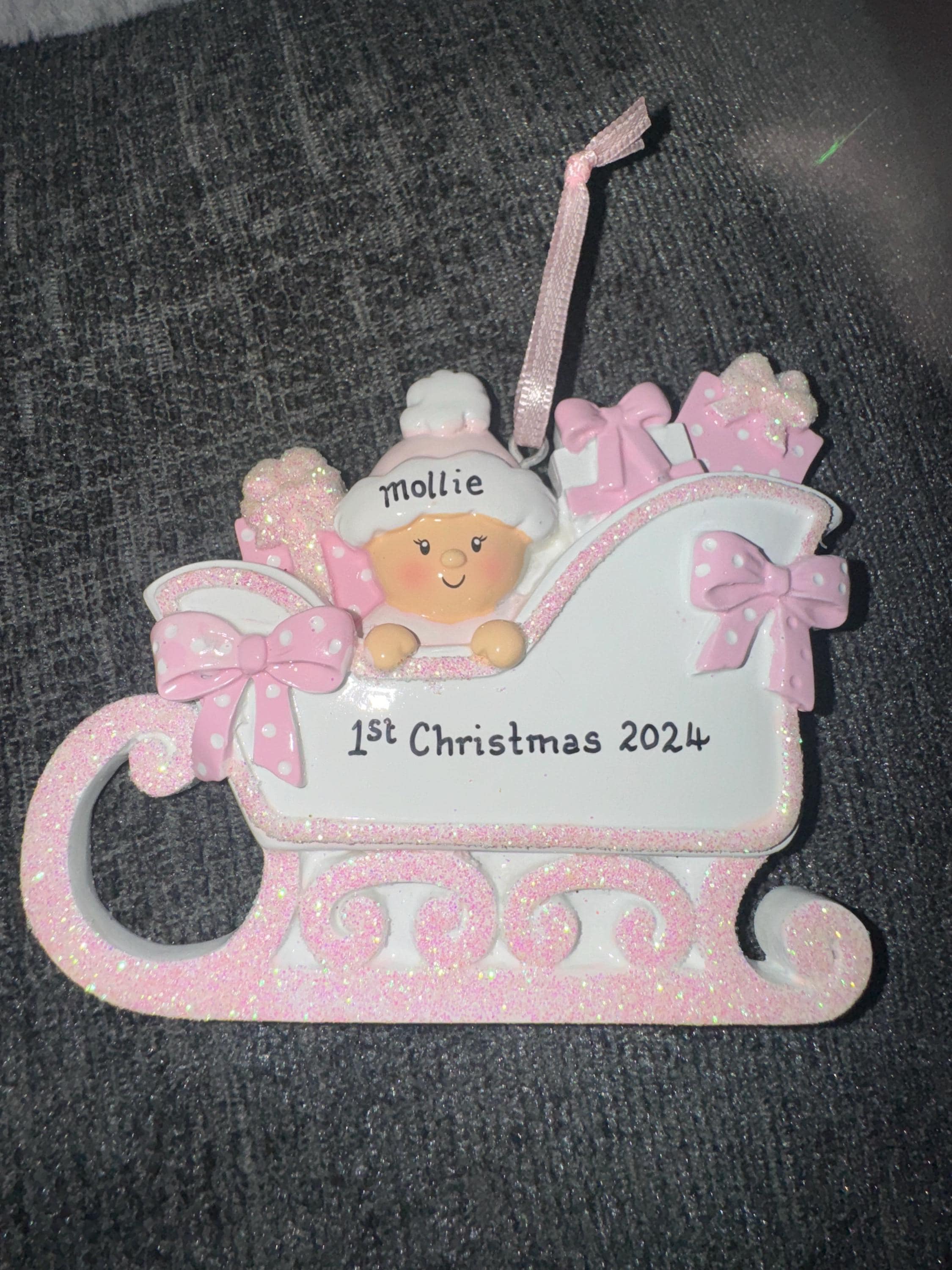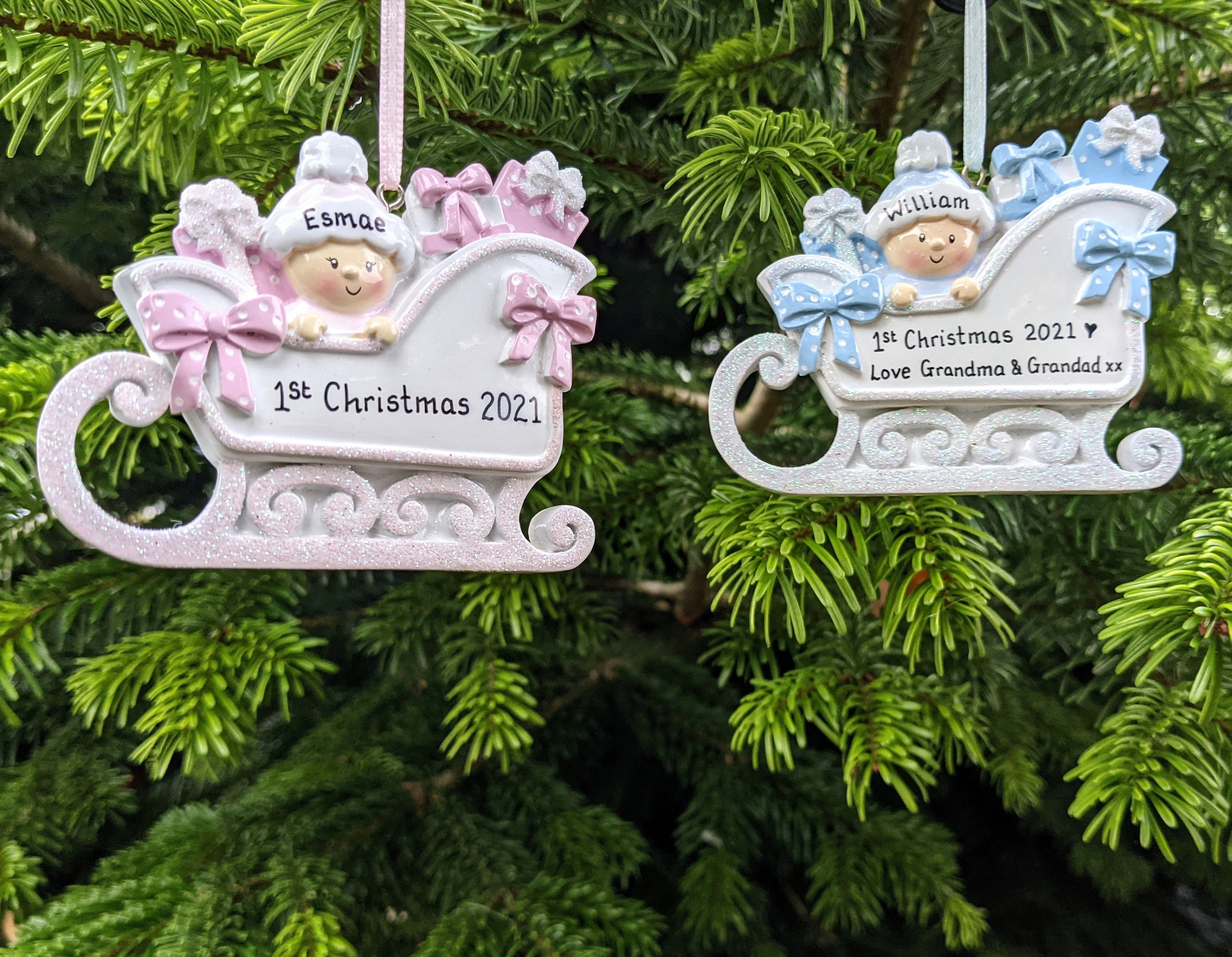 Features one child sat amongst presents in Santa's sleigh and designed to hang from your Christmas tree. These high quality resin decorations are hand painted with a glossy finish and completed with touches of glitter and pink or blue paint depending on your choice of a new baby girl or new baby boy.
