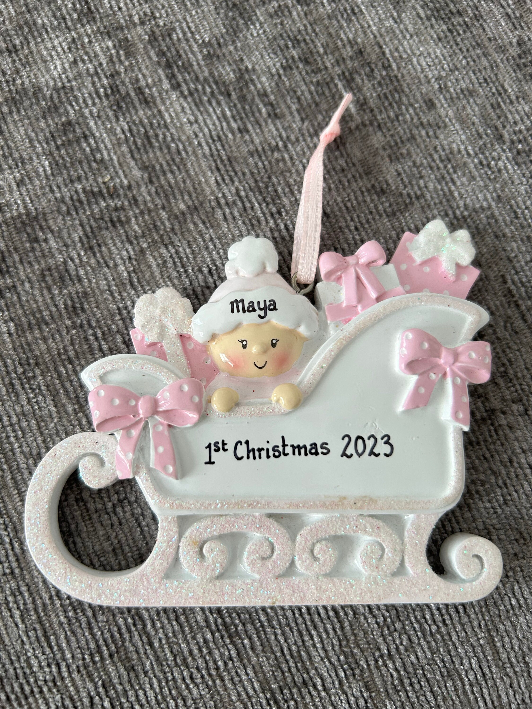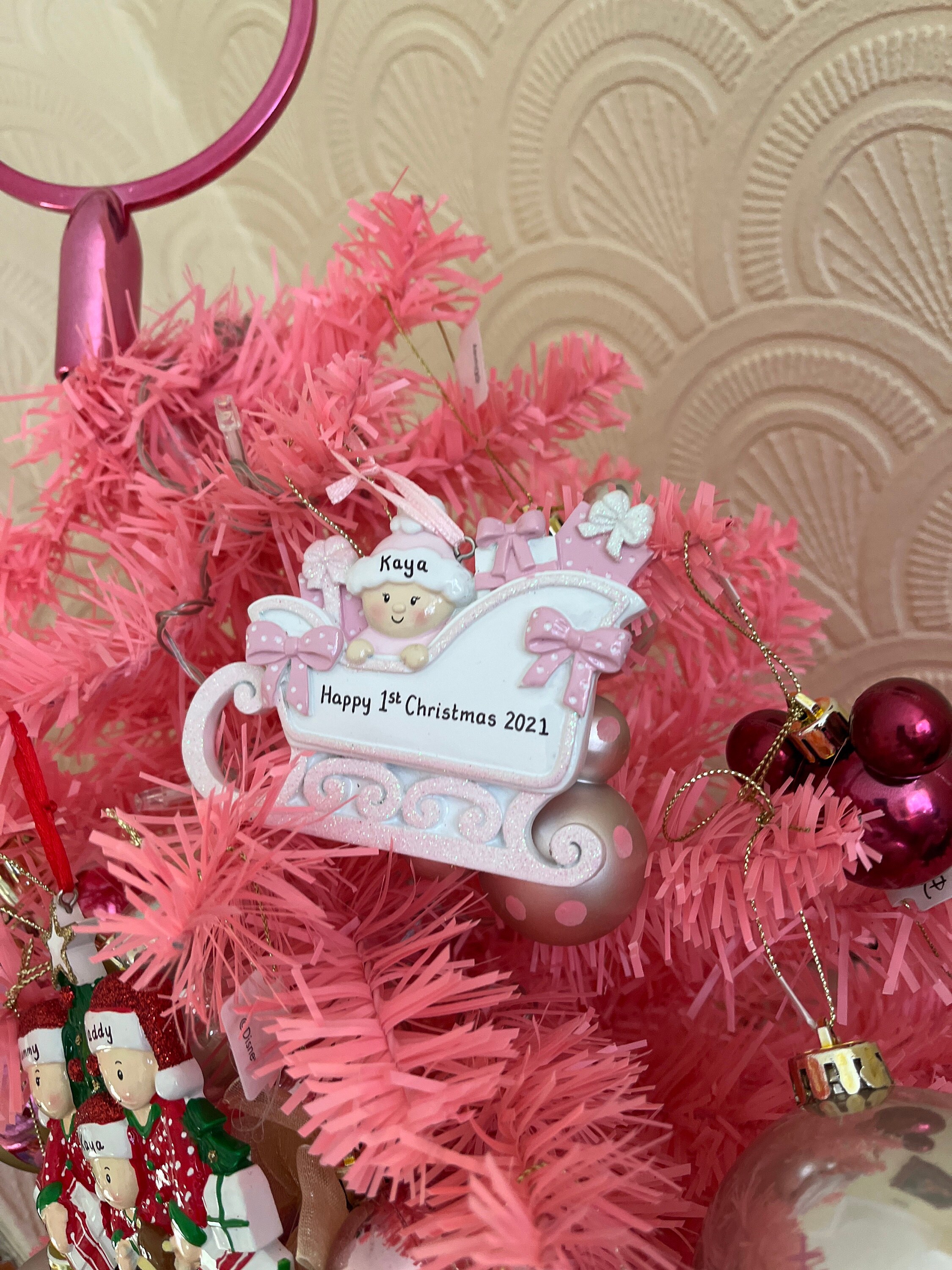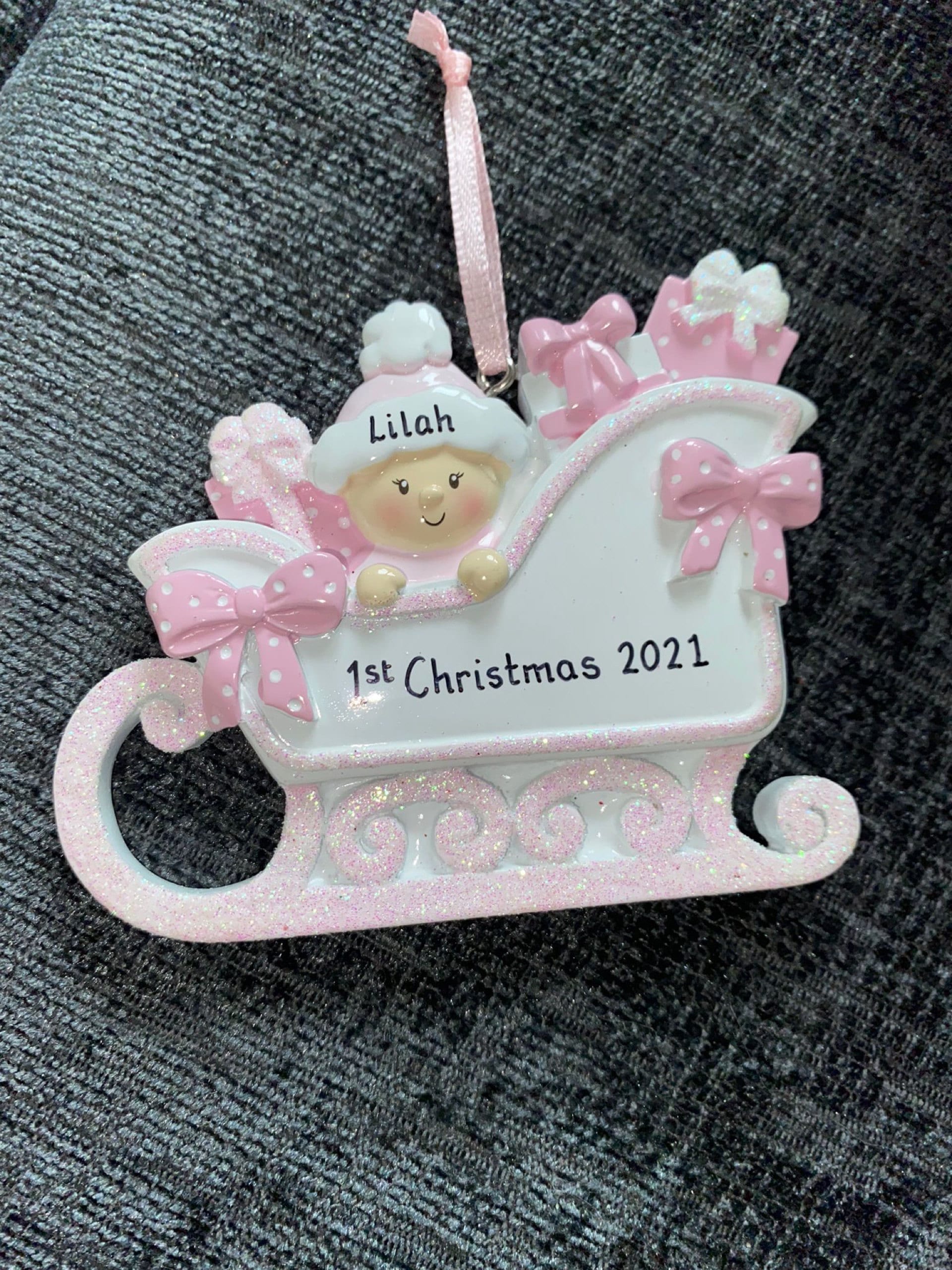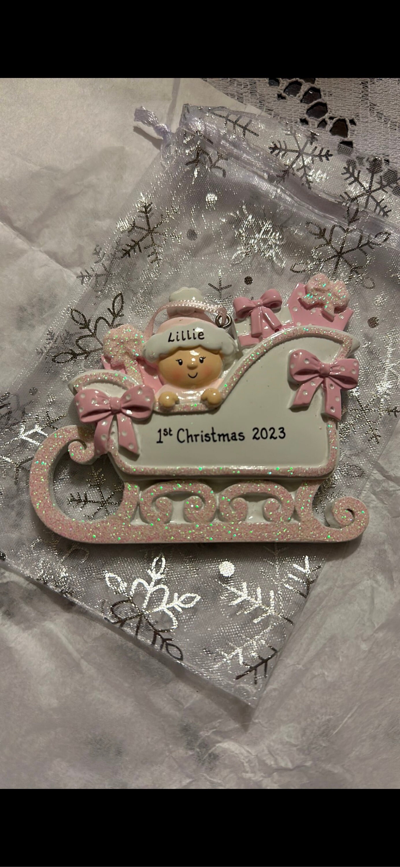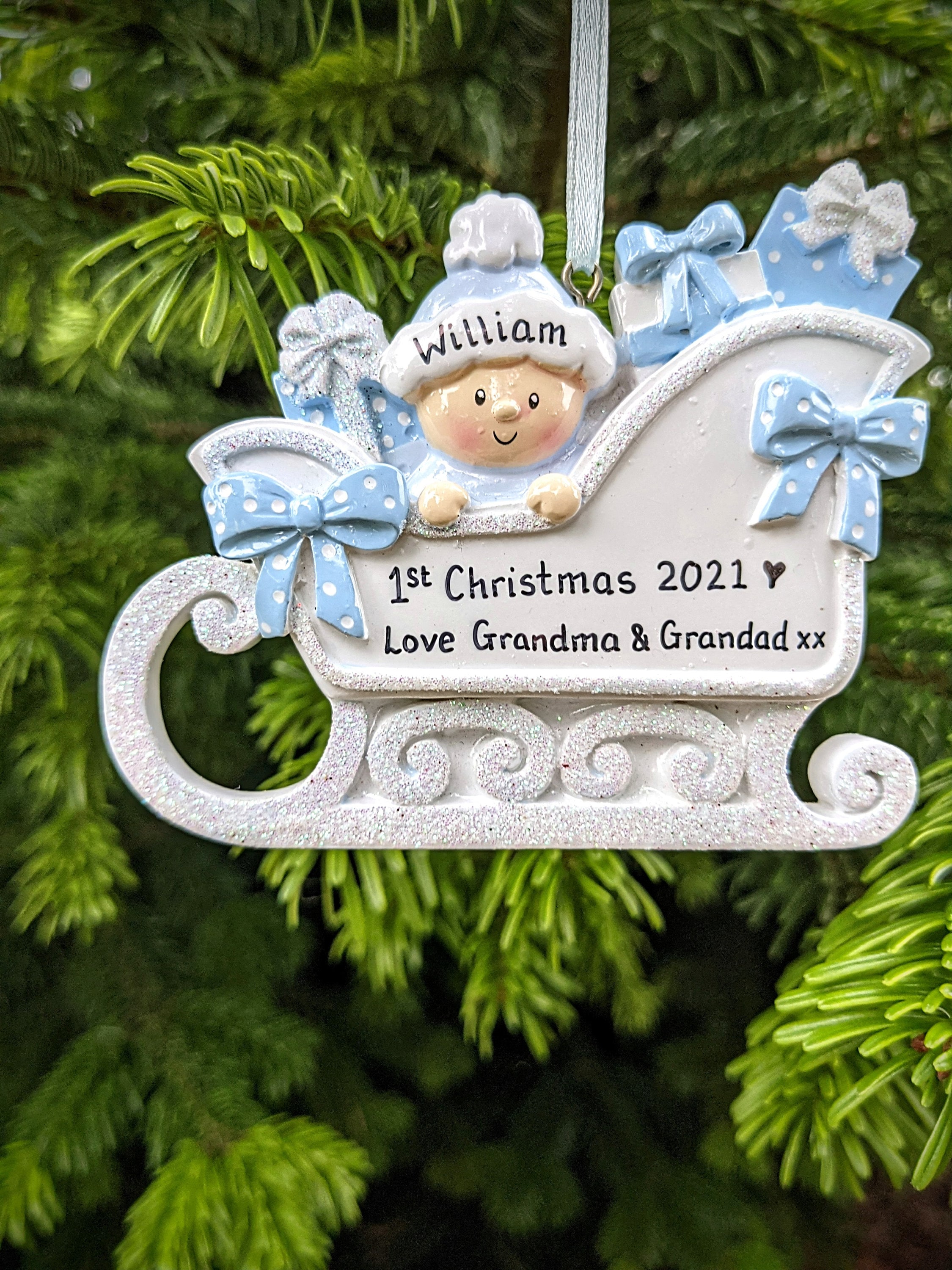 Features one child sat amongst presents in Santa's sleigh and designed to hang from your Christmas tree. These high quality resin decorations are hand painted with a glossy finish and completed with touches of glitter and pink or blue paint depending on your choice of a new baby girl or new baby boy.