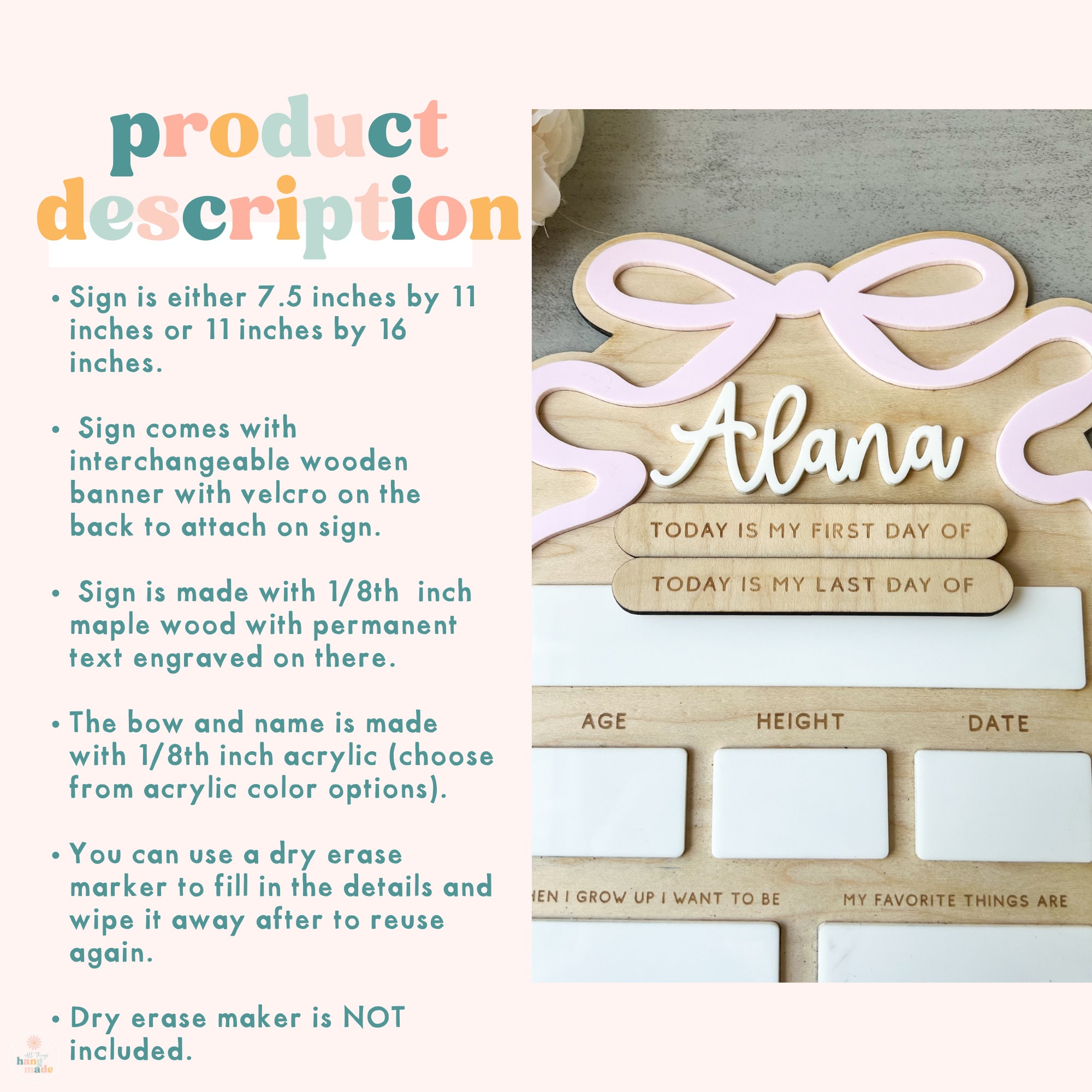 🌟Material: The sign is made from 1/8 maple wood with the board text permanently engraved on and the name/bow is made with 1/8 acrylic. You can choose from various color options for the name and bow.