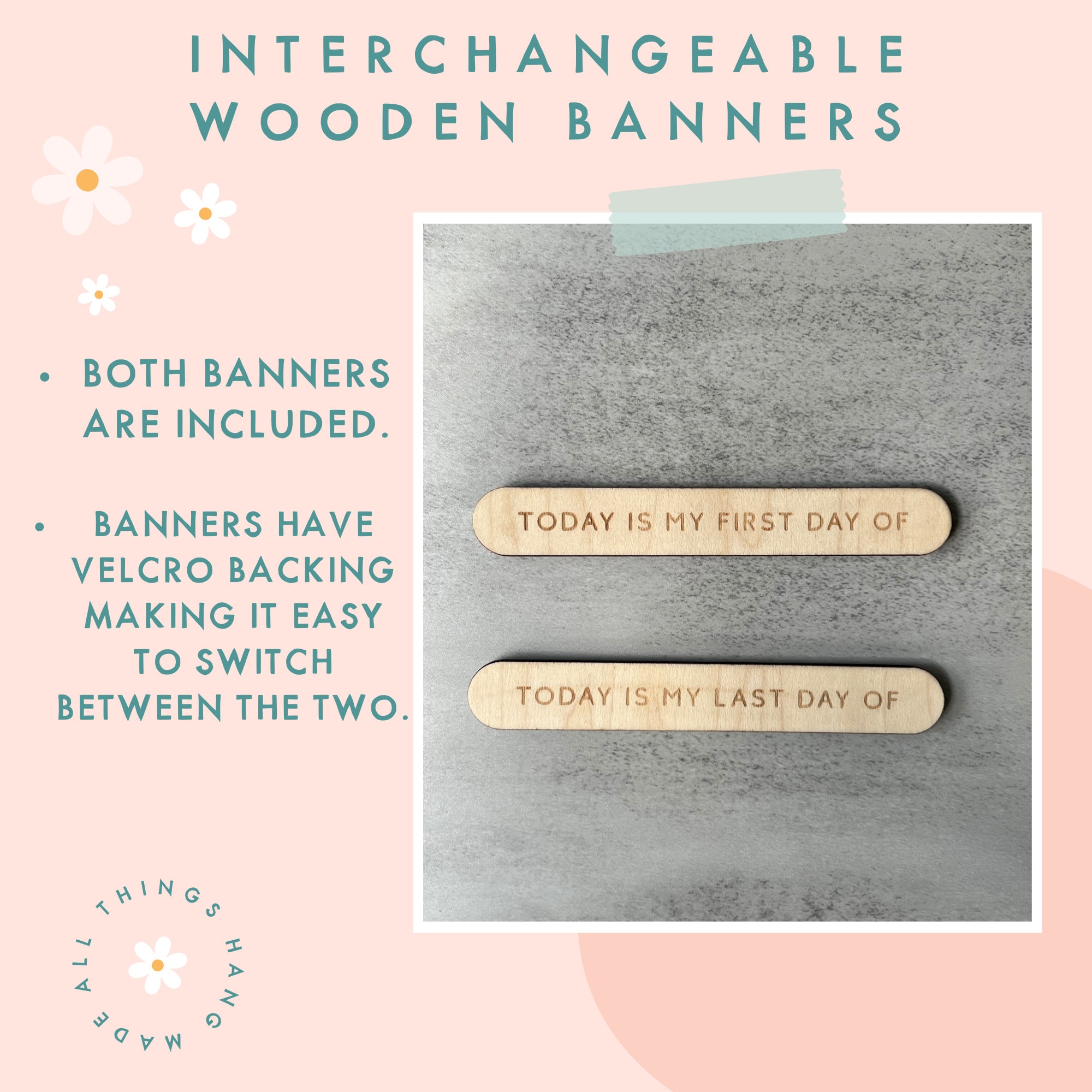 🌟Interchangeable Wooden Banner: Sign comes with two banners: “TODAY IS MY FIRST DAY OF” & “TODAY IS MY LAST DAY OF”. The velcro attached to it makes it so you can easily change the message depending on the occasion.