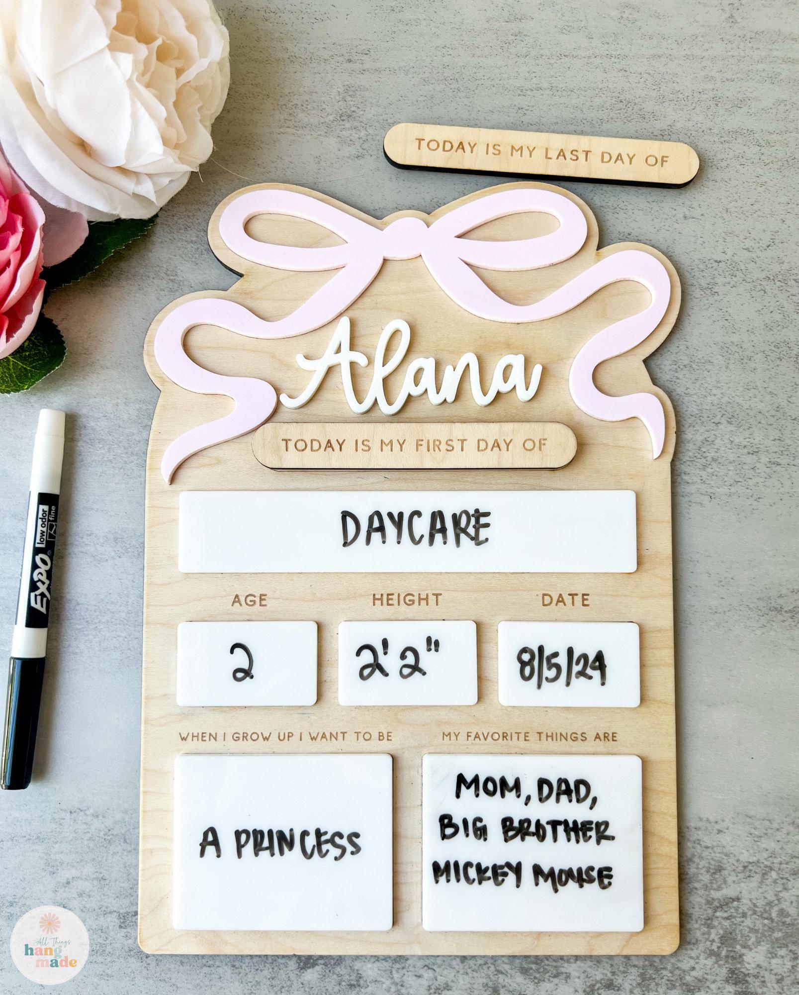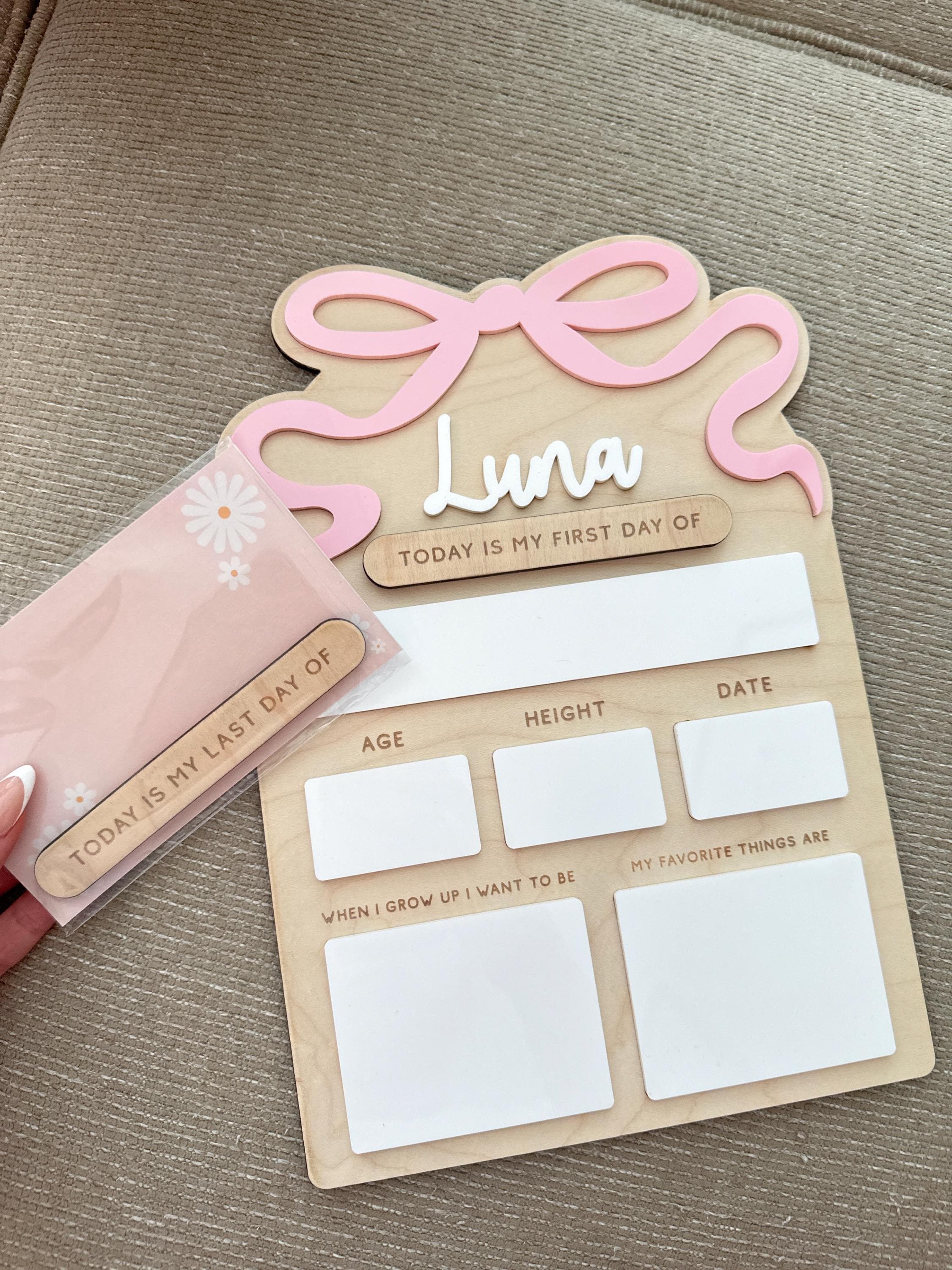Introducing our “Interchangeable and Reusable Back To School Dry Erase Sign”. This cute and girly pink bow board is perfect for photo opportunities for the first/last day of school for each academic school year. You can easily change the First/Last Day of School banner and fill out the details using a dry erase maker and snap a cute photo with your child each academic year.