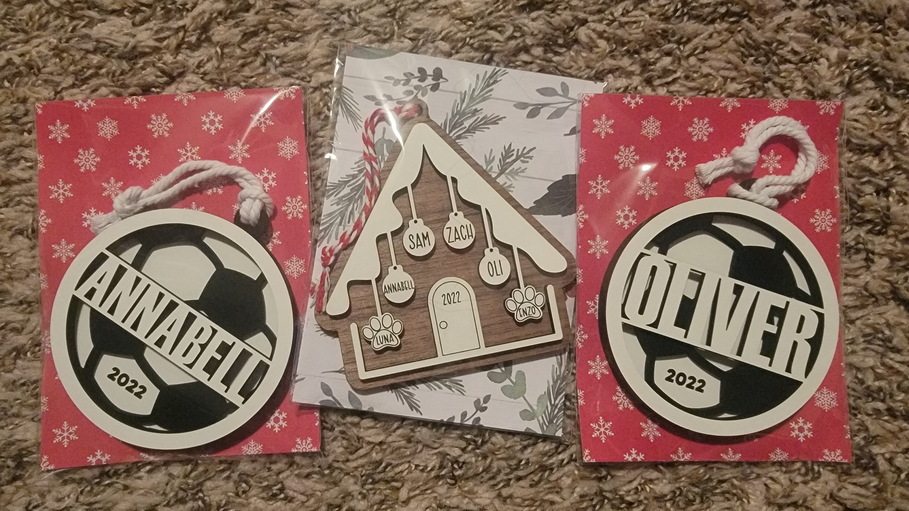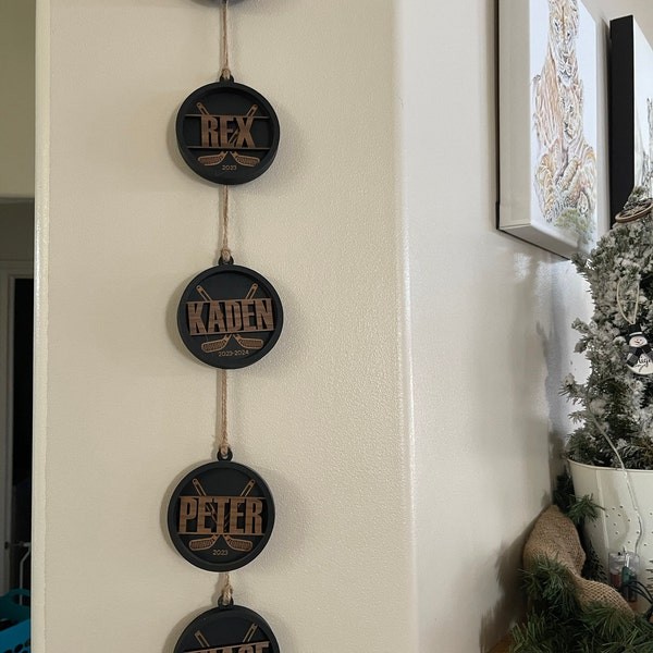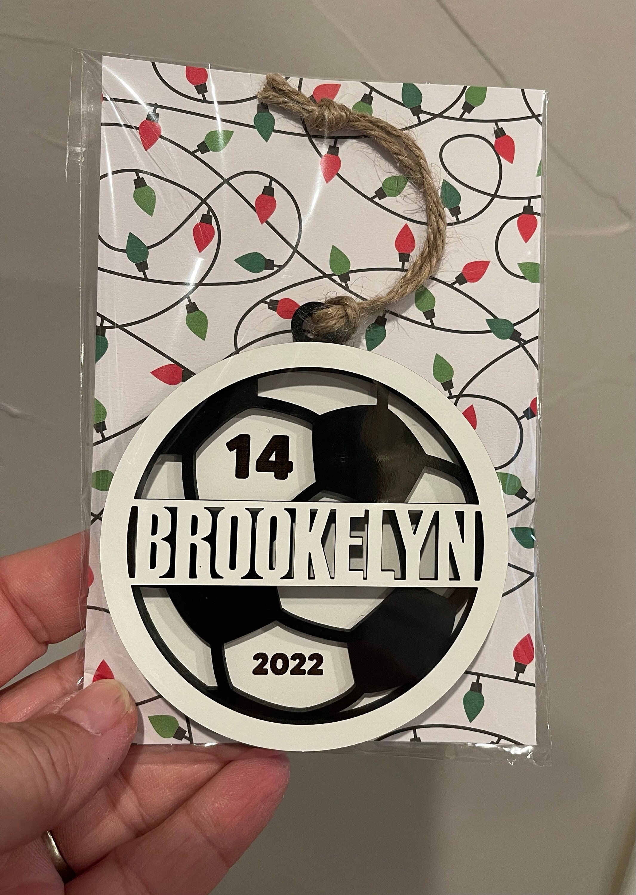 Name height will vary depending on how many letters are in the name. This ornament is strung with jute twine.