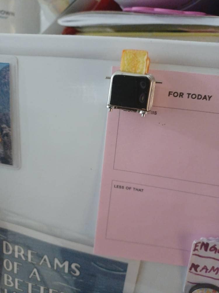 Are you looking for a cute, creative way to remind yourself or someone else to make breakfast? Look no further than our bestselling mini Toaster Magnet, featuring a tiny bread toaster and 2 slices of delicious-looking bread. The 2 pieces of bread are detachable! And its fun design means that even just passing by, it brings an extra bit of joy into your life. Not only does this Slice Toaster Fridge Magnet offer endless cuteness, but it also makes for a great gift for friends or family who need a pick-me-up. Put a smile on their faces with this playful addition to their kitchen or fridge collection!