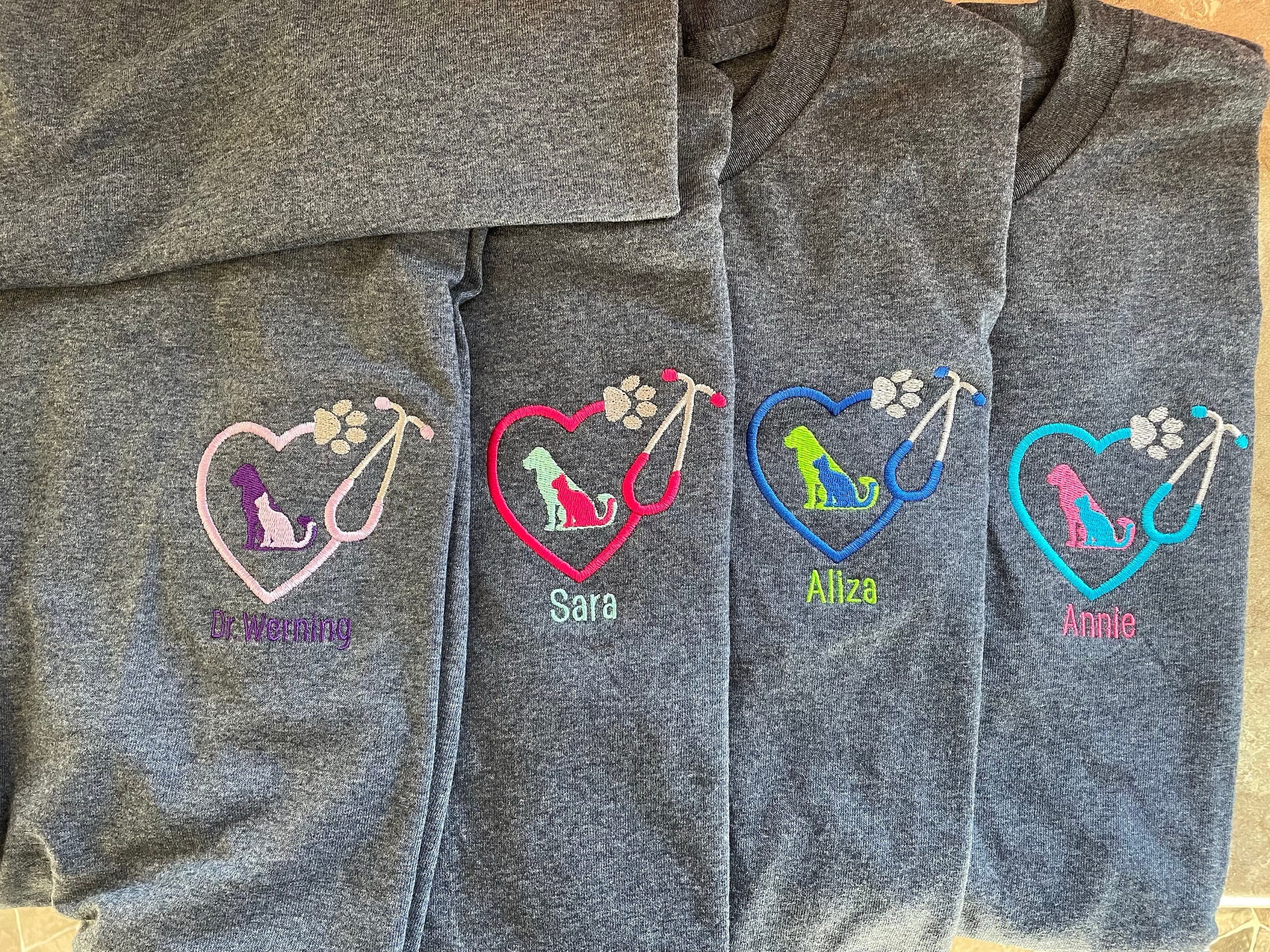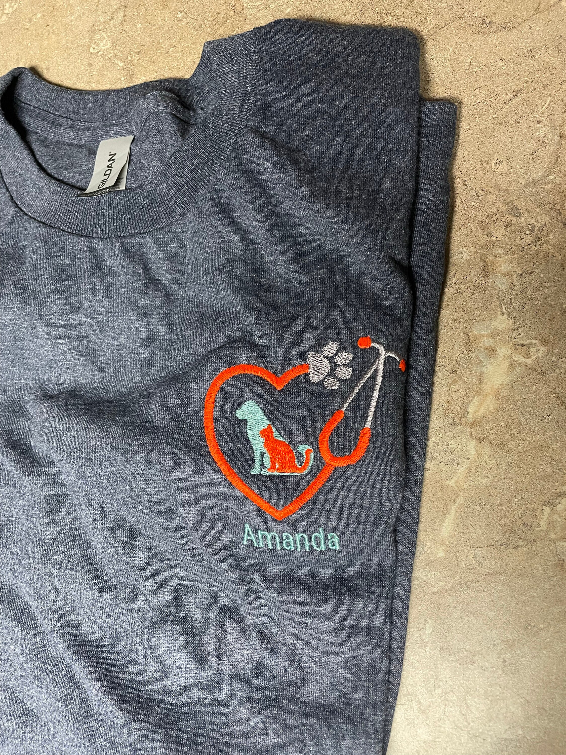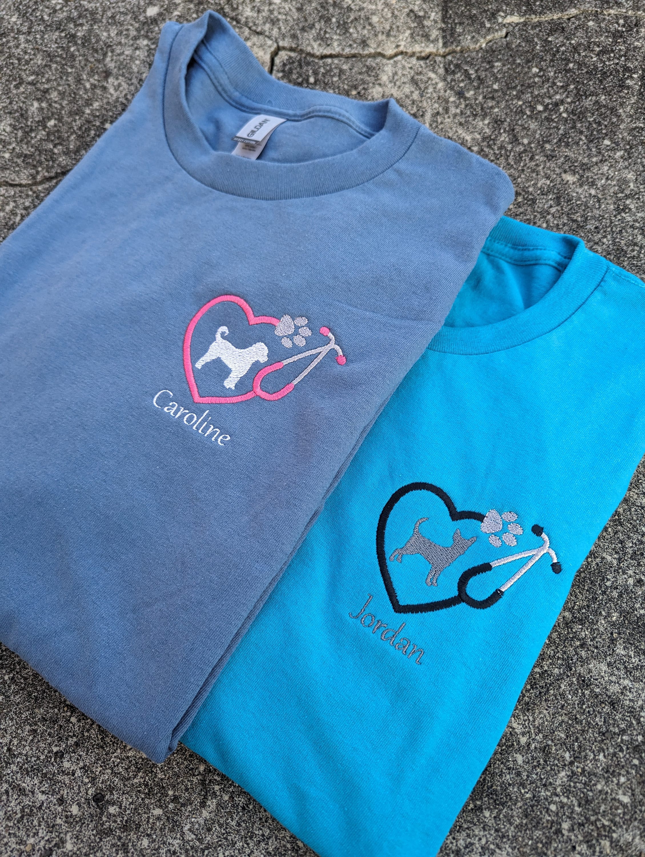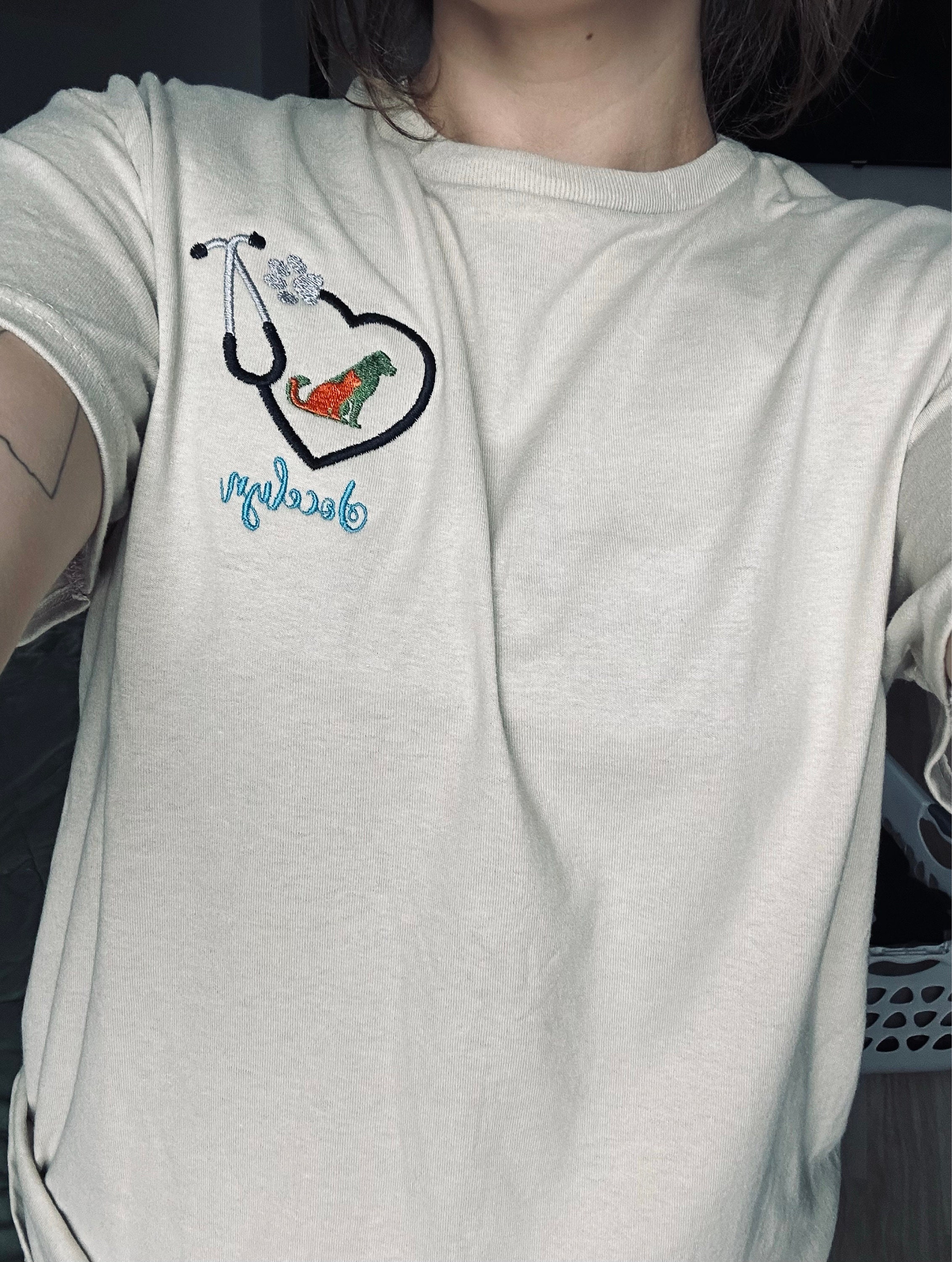 Our #1 selling vet tech design is now available on tshirts! These tees are perfect for summertime wear and make great gifts for vet techs, vet assistants, vet med students, vet receptionists, etc. You can choose any animal listed in our charts or message us if there is an animal you would like that is not listed. You can choose to have a stethoscope frame around the animal or the animal itself.