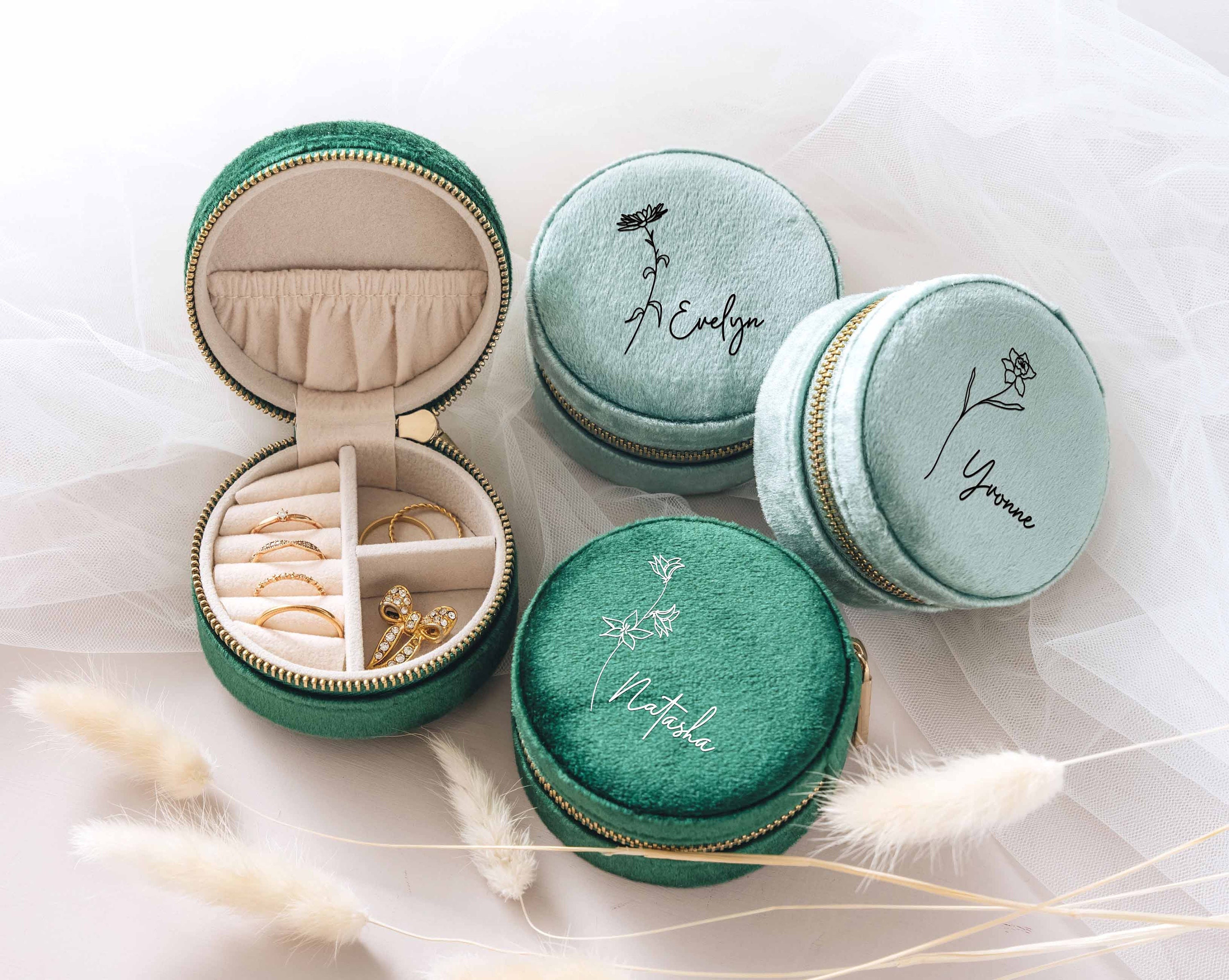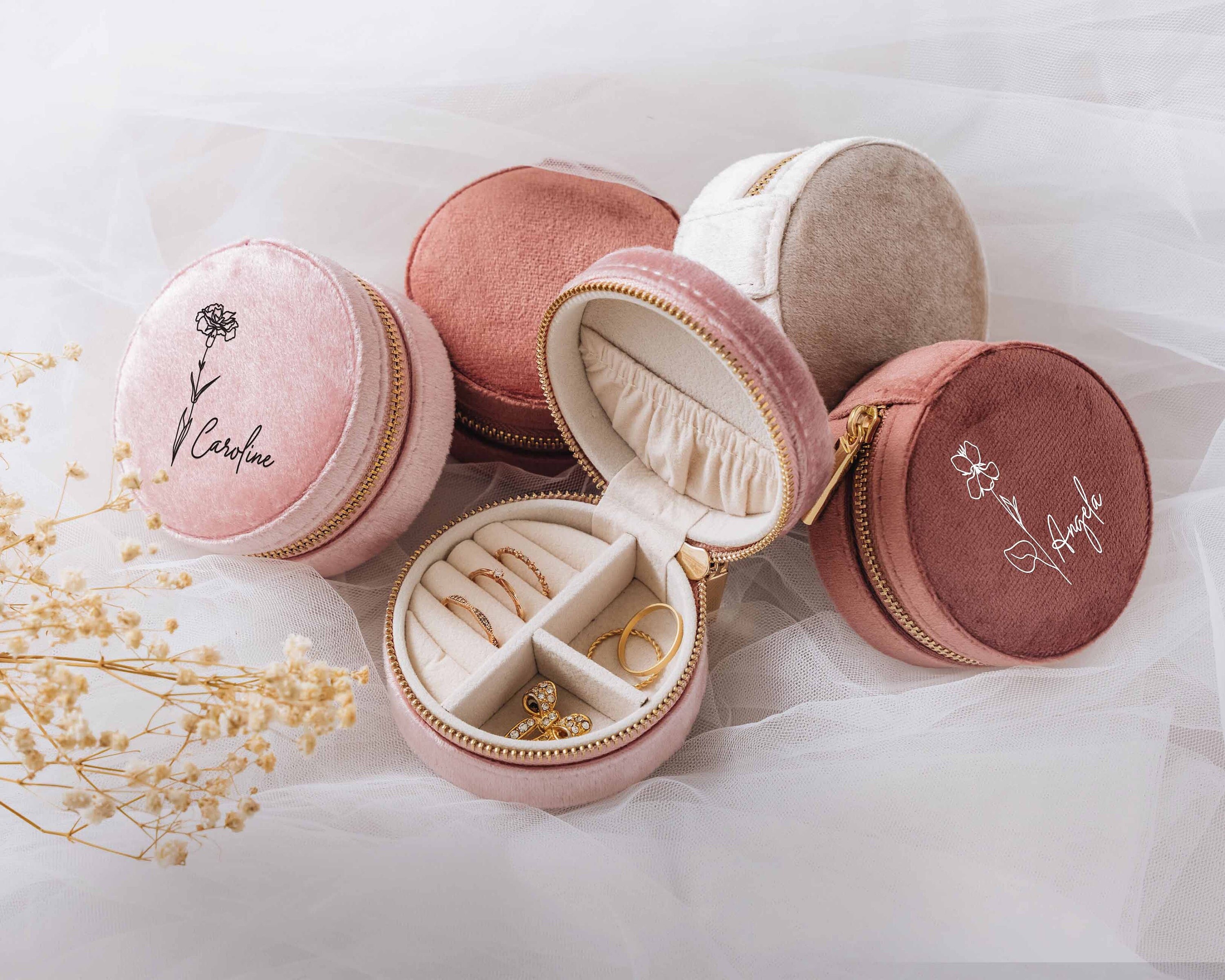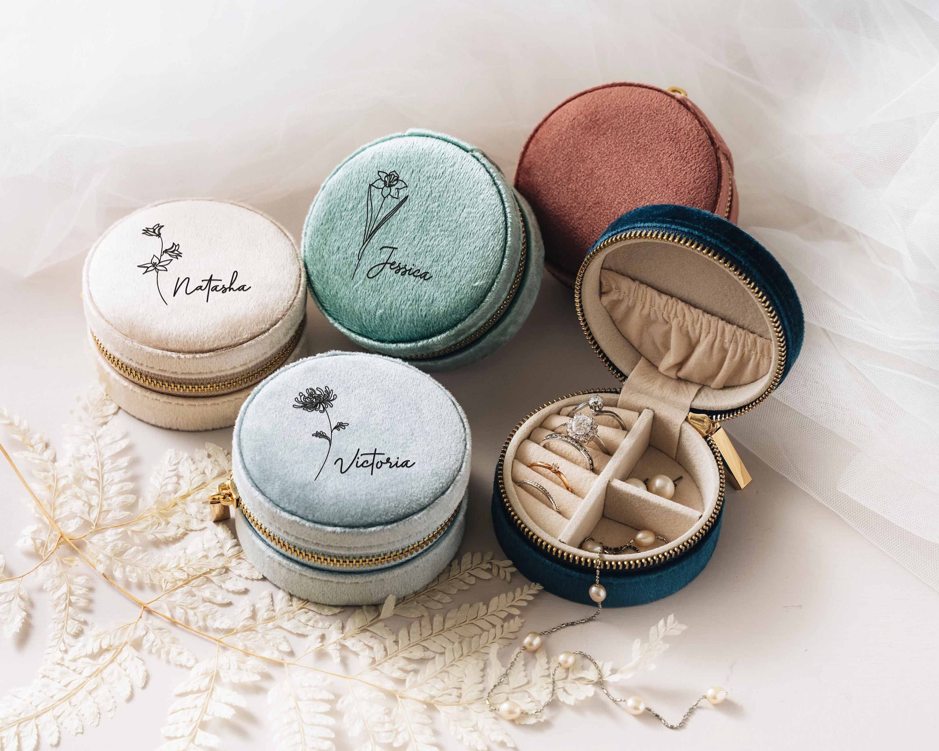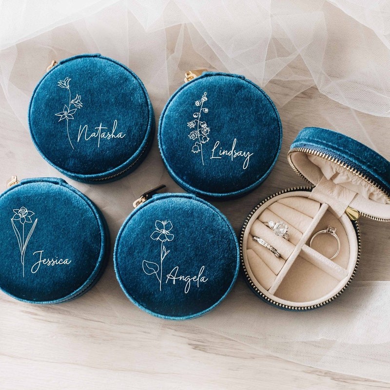 Discover the perfect blend of sophistication and sentiment with our stunning Velvet Jewelry Box! 🌟 Adorned with the flower of the recipient's birth month 🌸, this exquisite box makes an ideal gift for bridesmaids, maids of honor, brides, and cherished friends alike.